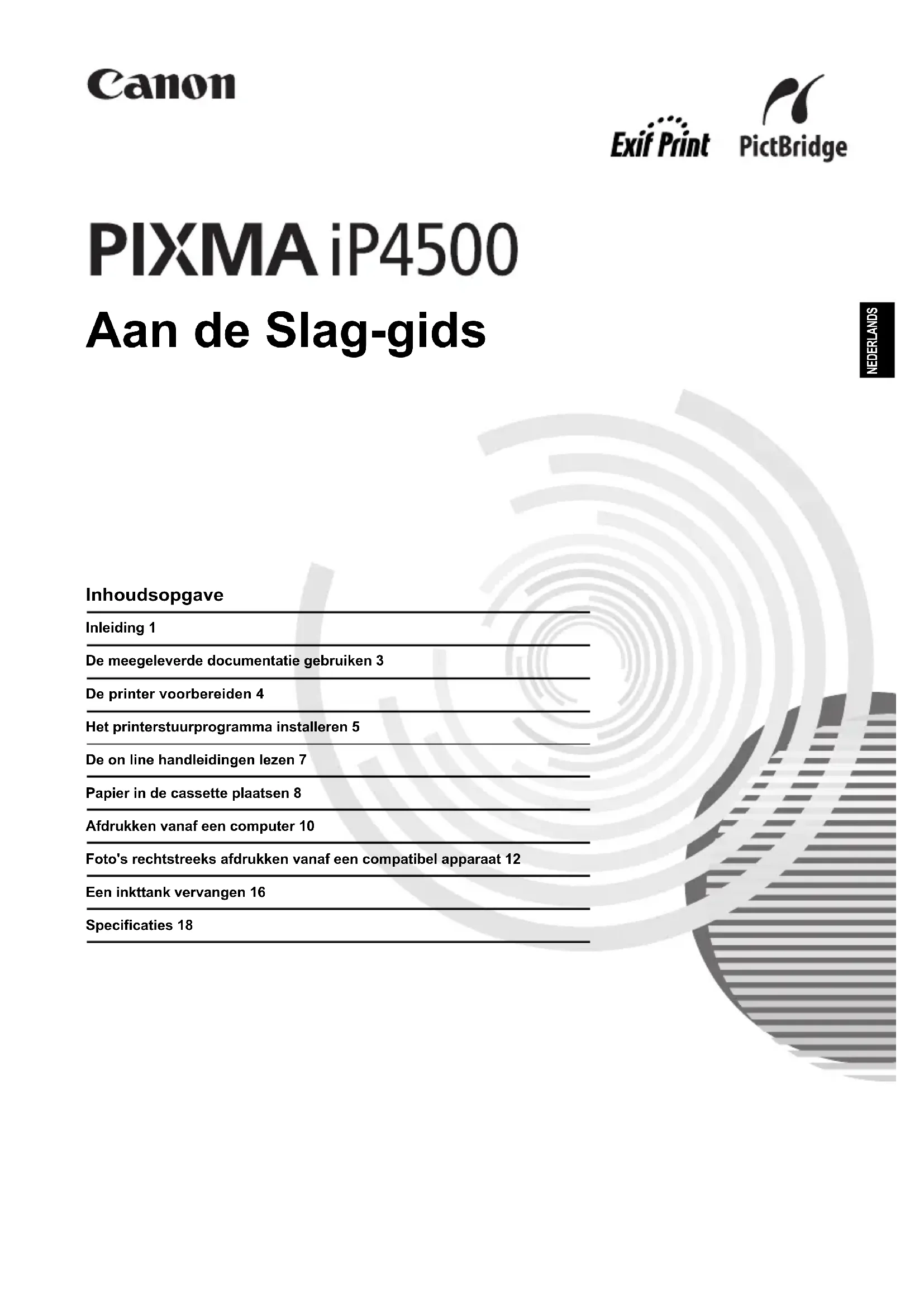 Stroomvoorziening Gebruik alleen het netsnoer dat bij de printer is geleverd. Gebruik nooit een netvoeding met een ander voltage dan de voeding in het land van aanschaf. Een verkeerde netspanning kan leiden tot brand of elektrische schokken. De voltages en de frequenties van de voeding zijn als volgt:AC 100-240 V, 50/60 Hz Informatie over verbruiksgoederen Verbruiksgoederen (inkttanks/FINE-cartridges (FINE Cartridges)) blijven beschikbaar tot 5 jaar nadat de productie is beëindigd. Veiligheidsvoorschriften Waarschuwing z Dit product produceert een zwakke magnetische flux. Als u een pacemaker gebruikt en voelt dat er afwijkingen optreden in de werking van de pacemaker, moet u uit de buurt van dit product blijven als het in gebruik is en contact opnemen met uw arts. z Probeer nooit met natte handen de stekker in het stopcontact te steken of eruit te halen. z Het netsnoer mag niet worden beschadigd, aangepast of uitgerekt of overmatig worden gebogen of verdraaid. Plaats geen zware voorwerpen op het netsnoer. z Gebruik nooit een netvoeding met een ander voltage dan het standaardvoltage in het land van aanschaf. Een onjuiste spanning en frequentie kunnen brand of een elektrische schok veroorzaken. z Steek de stekker altijd geheel in het stopcontact. Let op z Houd uit voorzorg inkttanks buiten het bereik van kinderen. z Laat de inkttanks niet vallen en schud ze niet heen en weer. Er kan dan inkt uit de tanks op uw handen of kleding lekken. Lees ook de veiligheidsvoorschriften in de on line Gebruikershandleiding. Neem de waarschuwingen in acht om persoonlijk letsel en schade aan de printer te voorkomen.3De meegeleverde documentatie gebruiken NEDERLANDS De meegeleverde documentatie gebruiken Gedrukte documentatie Eenvoudige installatie-instructies Lees deze instructies eerst. Dit blad bevat instructies voor het installeren van de printer en het gereedmaken voor gebruik. Aan de Slag-gids (deze handleiding) Lees deze handleiding als u de printer gaat gebruiken. Nadat u de instructies in de Eenvoudige installatie-instructies hebt opgevolgd, raden we u aan deze handleiding te lezen om bekend te worden met de basisbediening, zoals het afdrukken vanaf de computer of vanaf een met PictBridge compatibel apparaat. On line handleidingen Gebruikershandleiding Lees deze handleiding als u de printer gaat gebruiken. Als de Aan de Slag-gids niet voldoende informatie bevat, raadpleegt u de Gebruikershandleiding. U kunt deze installeren vanaf de [Setup CD-ROM/ Installatiecd-rom]. Deze handleiding biedt gedetailleerde informatie over: z afdrukmateriaal z afdrukken vanaf een computer z routineonderhoud z probleemoplossing Voor geavanceerde functies zijn tevens aanvullende handleidingen beschikbaar. Handleiding afdrukken op pc Raadpleeg deze handleiding voor uitgebreide instructies over het instellen van het printerstuurprogramma. Handleiding foto's afdrukken op pc (alleen Windows