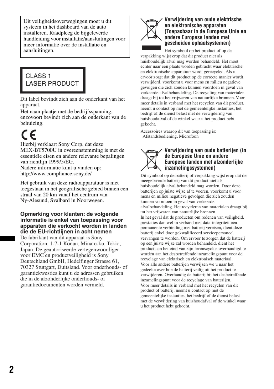 Uit veiligheidsoverwegingen moet u dit systeem in het dashboard van de auto installeren. Raadpleeg de bijgeleverde handleiding voor installatie/aansluitingen voor meer informatie over de installatie en aansluitingen. Dit label bevindt zich aan de onderkant van het apparaat. Het naamplaatje met de bedrijfsspanning, enzovoort bevindt zich aan de onderkant van de behuizing. Verwijdering van oude elektrische en elektronische apparaten (Toepasbaar in de Europese Unie en andere Europese landen met gescheiden ophaalsystemen) Het symbool op het product of op de verpakking wijst erop dat dit product niet als huishoudelijk afval mag worden behandeld. Het moet echter naar een plaats worden gebracht waar elektrische en elektronische apparatuur wordt gerecycled. Als u ervoor zorgt dat dit product op de correcte manier wordt verwijderd, voorkomt u voor mens en milieu negatieve gevolgen die zich zouden kunnen voordoen in geval van verkeerde afvalbehandeling. De recycling van materialen draagt bij tot het vrijwaren van natuurlijke bronnen. Voor meer details in verband met het recyclen van dit product, neemt u contact op met de gemeentelijke instanties, het bedrijf of de dienst belast met de verwijdering van huishoudafval of de winkel waar u het product hebt gekocht. Accessoires waarop dit van toepassing is: Afstandsbediening, Microfoon Hierbij verklaart Sony Corp. dat deze MEX-BT5700U in overeenstemming is met de essentiële eisen en andere relevante bepalingen van richtlijn 1999/5/EG. Nadere informatie kunt u vinden op: http://www.compliance.sony.de/ Het gebruik van deze radioapparatuur is niet toegestaan in het geografische gebied binnen een straal van 20 km vanaf het centrum van Ny-Alesund, Svalbard in Noorwegen. Opmerking voor klanten: de volgende informatie is enkel van toepassing voor apparaten die verkocht worden in landen die de EU-richtlijnen in acht nemen De fabrikant van dit apparaat is Sony Corporation, 1-7-1 Konan, Minato-ku, Tokio, Japan. De geautoriseerde vertegenwoordiger voor EMC en productveiligheid is Sony Deutschland GmbH, Hedelfinger Strasse 61, 70327 Stuttgart, Duitsland. Voor onderhouds- of garantiekwesties kunt u de adressen gebruiken die in de afzonderlijke onderhouds- of garantiedocumenten worden vermeld.