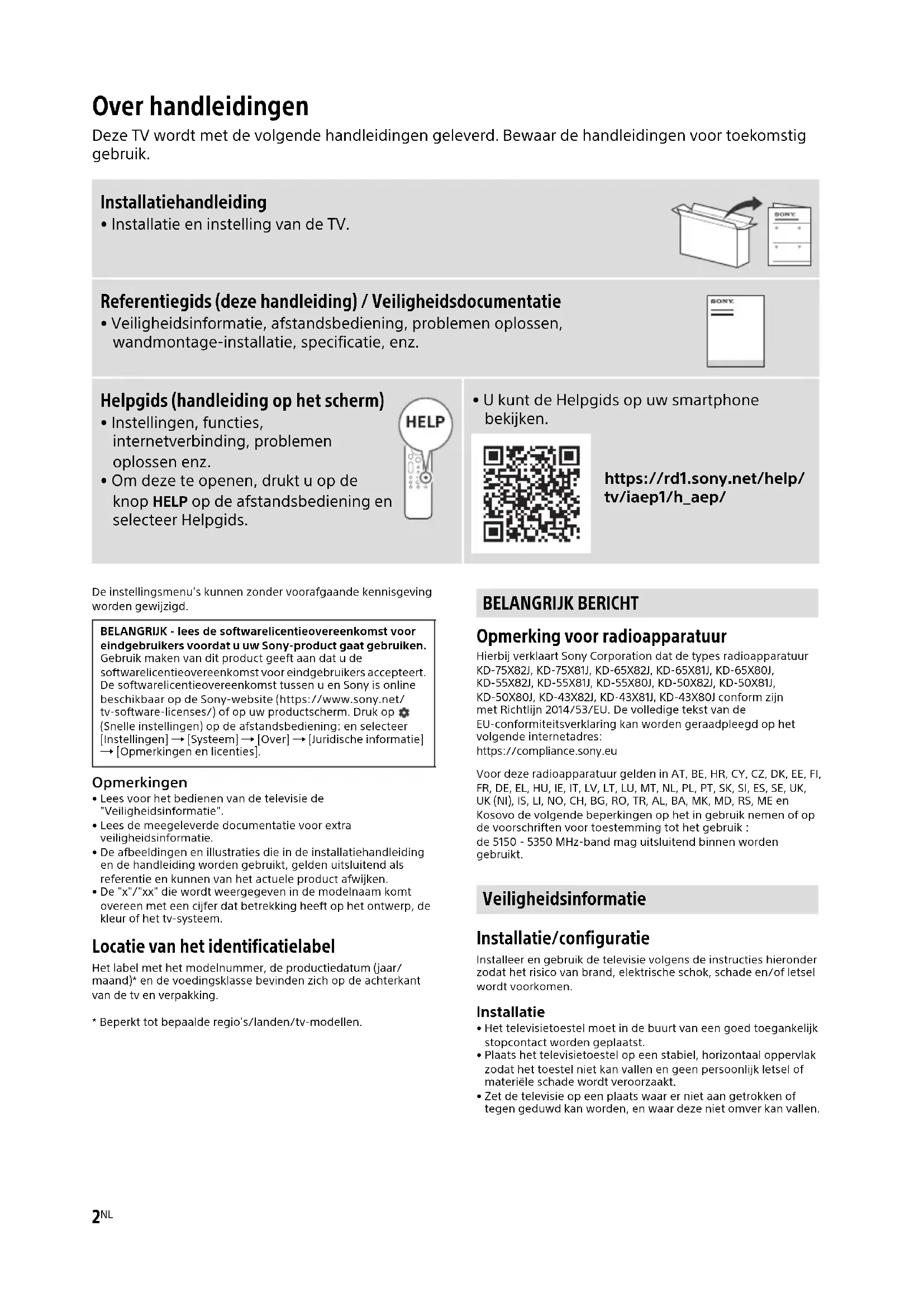 - Beperkt tot bepaalde regio's/landen/tv-modellen. Opmerking voor radioapparatuur Hierbij verklaart Sony Corporation dat de types radioapparatuur KD-75X82J, KD-75X81J, KD-65X82J, KD-65X81J, KD-65X80J, KD-55X82J, KD-55X81J, KD-55X80J, KD-50X82J, KD-50X81J, KD-50X80J, KD-43X82J, KD-43X81J, KD-43X80J conform zijn met Richtlijn 2014/53/EU. De volledige tekst van de EU-conformiteitsverklaring kan worden geraadpleegd op het volgende internetadres: https://compliance.sony.eu Voor deze radioapparatuur gelden in AT, BE, HR, CY, CZ, DK, EE, FI, FR, DE, EL, HU, IE, IT, LV, LT, LU, MT, NL, PL, PT, SK, SI, ES, SE, UK, UK (NI), IS, LI, NO, CH, BG, RO, TR, AL, BA, MK, MD, RS, ME en Kosovo de volgende beperkingen op het in gebruik nemen of op de voorschriften voor toestemming tot het gebruik : de 5150 - 5350 MHz-band mag uitsluitend binnen worden gebruikt. Installatie/configuratie Installeer en gebruik de televisie volgens de instructies hieronder zodat het risico van brand, elektrische schok, schade en/of letsel wordt voorkomen. Installatie