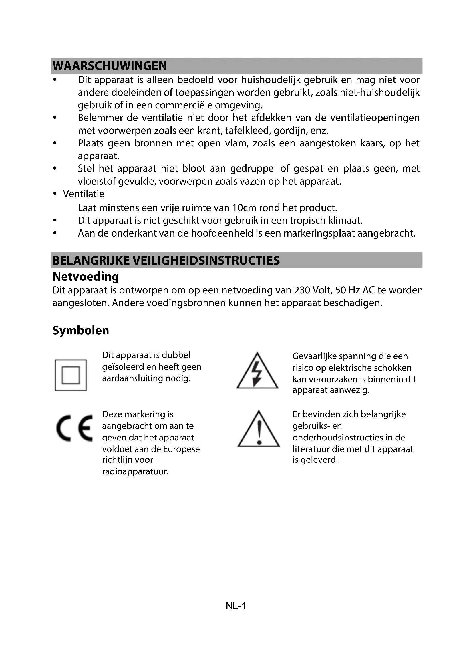 En tant que revendeur, nous nous préoccupons de l'environnement. Aidez-nous en observant toutes les instructions de mise au rebut de vos produits, emballages et, le cas échéant, accessoires et piles. Nous devons tous oeuvrer pour la protection des ressources naturelles et nous efforcer de recycler tous les matériaux d'une manière qui ne puisse nuire ni à notre santé ni à l'environnement.FR-7NL-1 WAARSCHUWINGEN Dit apparaat is alleen bedoeld voor huishoudelijk gebruik en mag niet voor andere doeleinden of toepassingen worden gebruikt, zoals niet-huishoudelijk gebruik of in een commerciële omgeving. Belemmer de ventilatie niet door het afdekken van de ventilatieopeningen met voorwerpen zoals een krant, tafelkleed, gordijn, enz. Plaats geen bronnen met open vlam, zoals een aangestoken kaars, op het apparaat. Stel het apparaat niet bloot aan gedruppel of gespat en plaats geen, met vloeistof gevulde, voorwerpen zoals vazen op het apparaat. Ventilatie Laat minstens een vrije ruimte van 10cm rond het product. Dit apparaat is niet geschikt voor gebruik in een tropisch klimaat. Aan de onderkant van de hoofdeenheid is een markeringsplaat aangebracht. BELANGRIJKE VEILIGHEIDSINSTRUCTIES Netvoeding Dit apparaat is ontworpen om op een netvoeding van 230 Volt, 50 Hz AC te worden aangesloten. Andere voedingsbronnen kunnen het apparaat beschadigen. Symbolen
