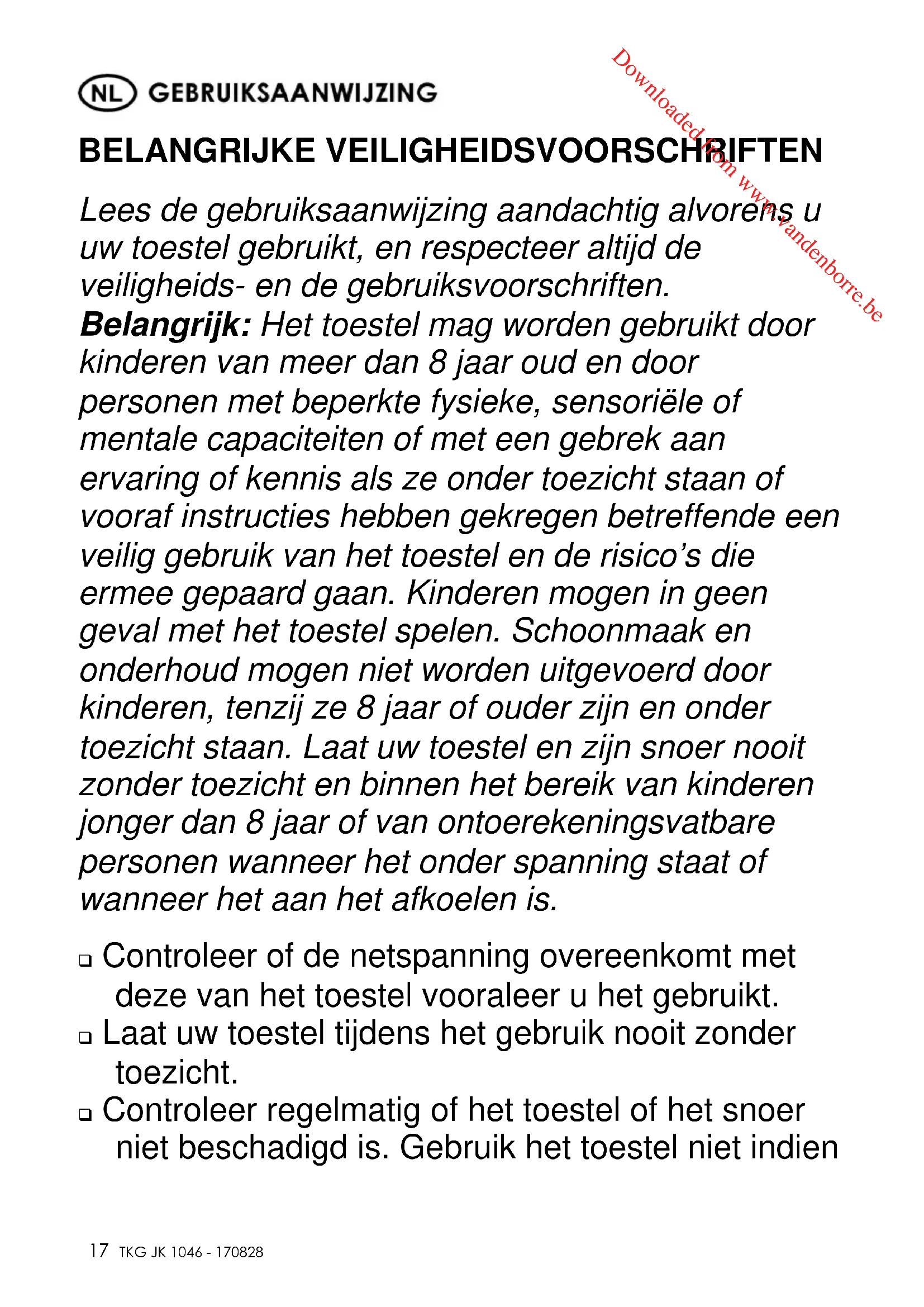 Fax +32 2 359 95 50 BELANGRIJKE VEILIGHEIDSVOORSCHRIFTEN Lees de gebruiksaanwijzing aandachtig alvorens u uw toestel gebruikt, en respecteer altijd de veiligheids- en de gebruiksvoorschriften. Belangrijk: Het toestel mag worden gebruikt door kinderen van meer dan 8 jaar oud en door personen met beperkte fysieke, sensoriële of mentale capaciteiten of met een gebrek aan ervaring of kennis als ze onder toezicht staan of vooraf instructies hebben gekregen betreffende een veilig gebruik van het toestel en de risico’s die ermee gepaard gaan. Kinderen mogen in geen geval met het toestel spelen. Schoonmaak en onderhoud mogen niet worden uitgevoerd door kinderen, tenzij ze 8 jaar of ouder zijn en onder toezicht staan. Laat uw toestel en zijn snoer nooit zonder toezicht en binnen het bereik van kinderen jonger dan 8 jaar of van ontoerekeningsvatbare personen wanneer het onder spanning staat of wanneer het aan het afkoelen is. Controleer of de netspanning overeenkomt met deze van het toestel vooraleer u het gebruikt. Laat uw toestel tijdens het gebruik nooit zonder toezicht. Controleer regelmatig of het toestel of het snoer niet beschadigd is. Gebruik het toestel niet indien Downloaded from www.vandenborre.be Copies of the I/B. Please reproduce them without any changes except under special instruction from Team International BELGIUM. The pages must be reproduced and folded in order to obtain a booklet A5 (+/- 148.5 mm width x 210 mm height). When folding, make sure you keep the good numbering when you turn the pages of the I/B. Don’t change the page numbering. Keep the language integrity.