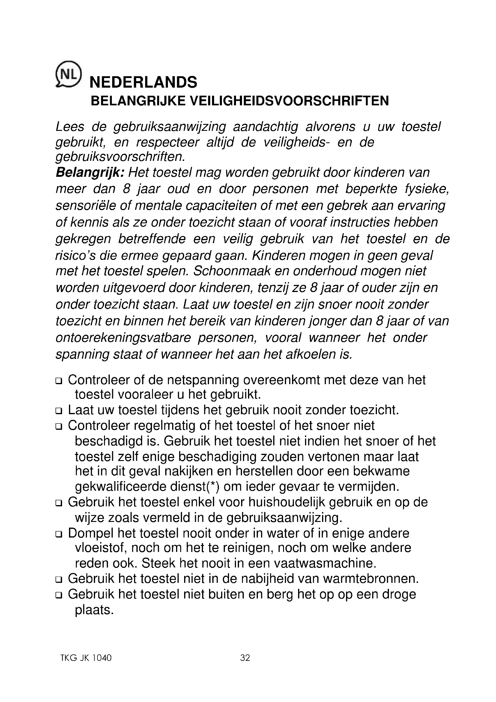 NEDERLANDS BELANGRIJKE VEILIGHEIDSVOORSCHRIFTEN Lees de gebruiksaanwijzing aandachtig alvorens u uw toestel gebruikt, en respecteer altijd de veiligheids- en de gebruiksvoorschriften. Belangrijk: Het toestel mag worden gebruikt door kinderen van meer dan 8 jaar oud en door personen met beperkte fysieke, sensoriële of mentale capaciteiten of met een gebrek aan ervaring of kennis als ze onder toezicht staan of vooraf instructies hebben gekregen betreffende een veilig gebruik van het toestel en de risico’s die ermee gepaard gaan. Kinderen mogen in geen geval met het toestel spelen. Schoonmaak en onderhoud mogen niet worden uitgevoerd door kinderen, tenzij ze 8 jaar of ouder zijn en onder toezicht staan. Laat uw toestel en zijn snoer nooit zonder toezicht en binnen het bereik van kinderen jonger dan 8 jaar of van ontoerekeningsvatbare personen, vooral wanneer het onder spanning staat of wanneer het aan het afkoelen is. ❑ Controleer of de netspanning overeenkomt met deze van het toestel vooraleer u het gebruikt. ❑ Laat uw toestel tijdens het gebruik nooit zonder toezicht. ❑ Controleer regelmatig of het toestel of het snoer niet beschadigd is. Gebruik het toestel niet indien het snoer of het toestel zelf enige beschadiging zouden vertonen maar laat het in dit geval nakijken en herstellen door een bekwame gekwalificeerde dienst(*) om ieder gevaar te vermijden. ❑ Gebruik het toestel enkel voor huishoudelijk gebruik en op de wijze zoals vermeld in de gebruiksaanwijzing. ❑ Dompel het toestel nooit onder in water of in enige andere vloeistof, noch om het te reinigen, noch om welke andere reden ook. Steek het nooit in een vaatwasmachine. ❑ Gebruik het toestel niet in de nabijheid van warmtebronnen. ❑ Gebruik het toestel niet buiten en berg het op op een droge plaats.33 TKG JK 1040