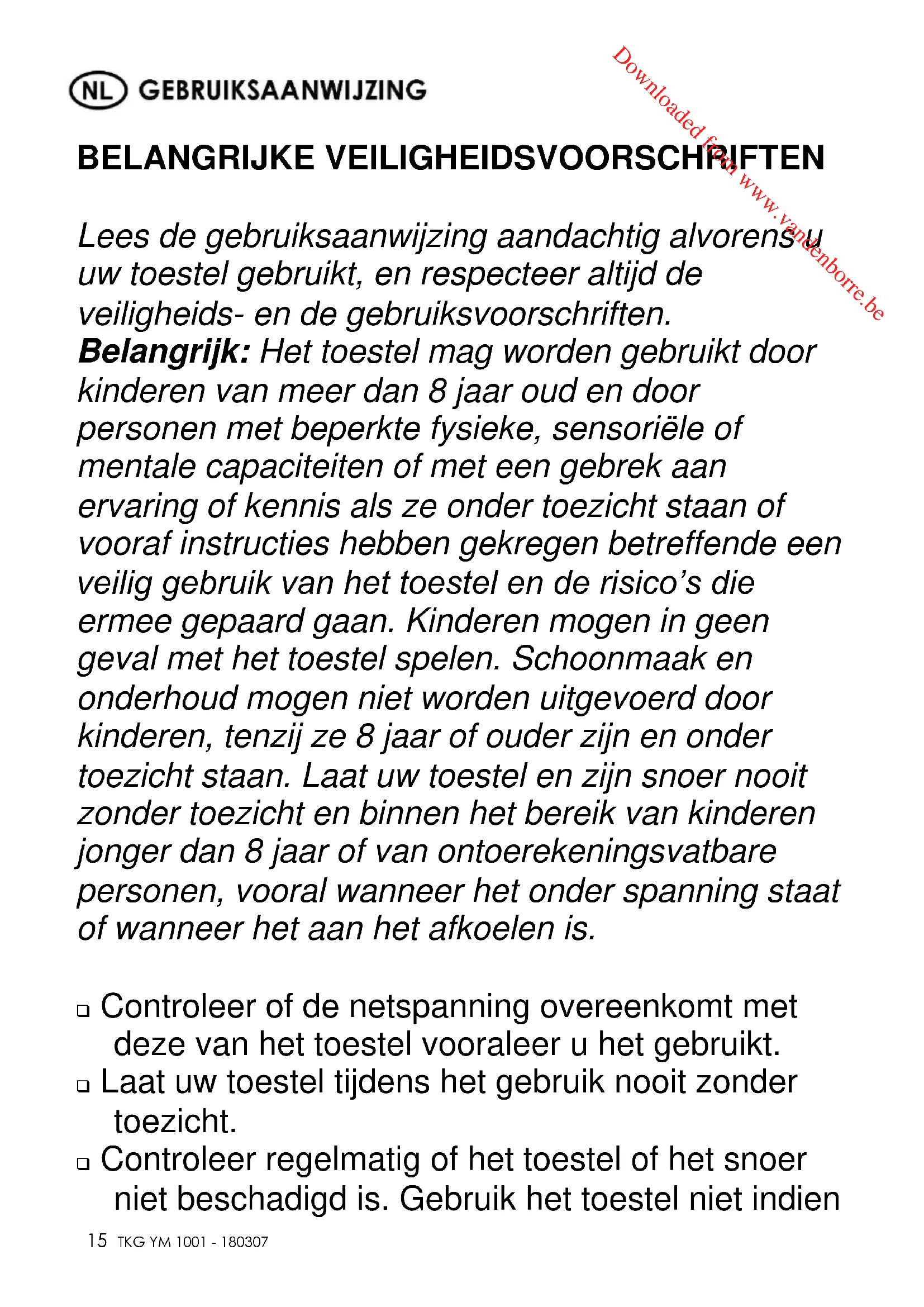 BELANGRIJKE VEILIGHEIDSVOORSCHRIFTEN Lees de gebruiksaanwijzing aandachtig alvorens u uw toestel gebruikt, en respecteer altijd de veiligheids- en de gebruiksvoorschriften. Belangrijk: Het toestel mag worden gebruikt door kinderen van meer dan 8 jaar oud en door personen met beperkte fysieke, sensoriële of mentale capaciteiten of met een gebrek aan ervaring of kennis als ze onder toezicht staan of vooraf instructies hebben gekregen betreffende een veilig gebruik van het toestel en de risico’s die ermee gepaard gaan. Kinderen mogen in geen geval met het toestel spelen. Schoonmaak en onderhoud mogen niet worden uitgevoerd door kinderen, tenzij ze 8 jaar of ouder zijn en onder toezicht staan. Laat uw toestel en zijn snoer nooit zonder toezicht en binnen het bereik van kinderen jonger dan 8 jaar of van ontoerekeningsvatbare personen, vooral wanneer het onder spanning staat of wanneer het aan het afkoelen is. Controleer of de netspanning overeenkomt met deze van het toestel vooraleer u het gebruikt. Laat uw toestel tijdens het gebruik nooit zonder toezicht. Controleer regelmatig of het toestel of het snoer niet beschadigd is. Gebruik het toestel niet indien Downloaded from www.vandenborre.beCopies of the I/B. Please reproduce them without any changes except under special instruction from Team International BELGIUM. The pages must be reproduced and folded in order to obtain a booklet A5 (+/- 148.5 mm width x 210 mm height). When folding, make sure you keep the good numbering when you turn the pages of the I/B. Don’t change the page numbering. Keep the language integrity.