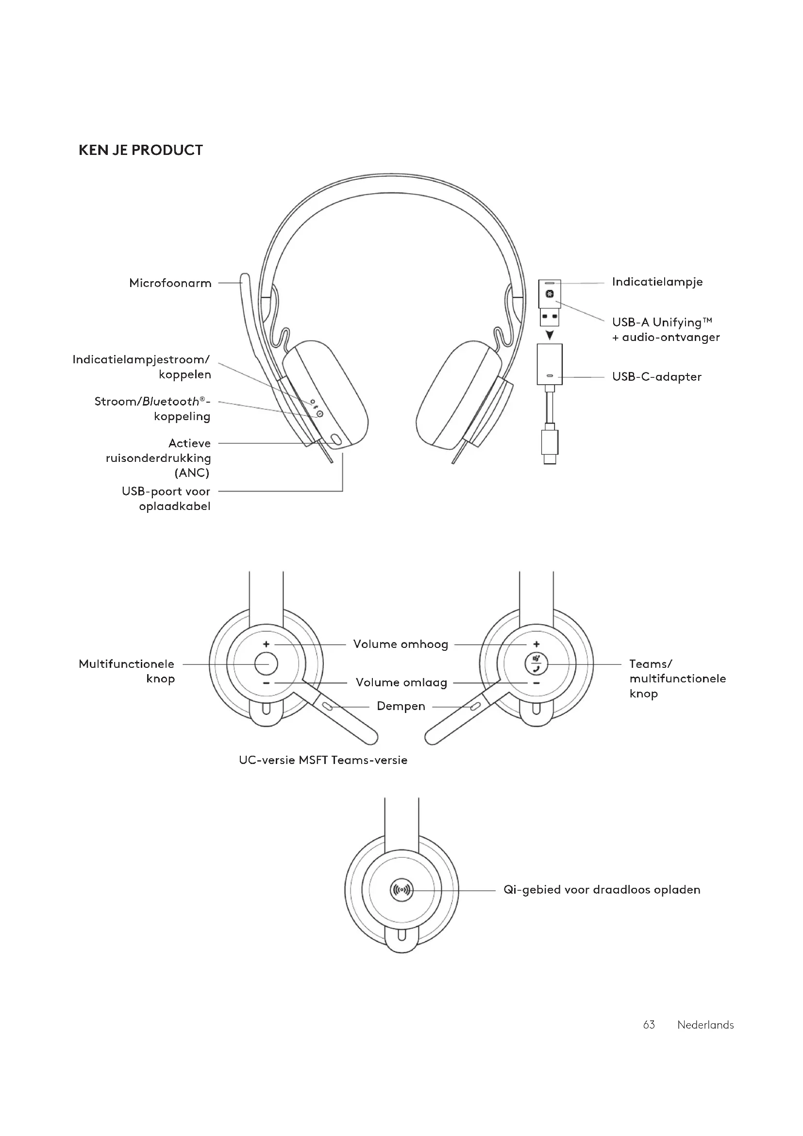 koppeling USB-poort voor oplaadkabel USB-C-adapter Indicatielampje USB-A Unifying™ +audio-ontvanger Volume omhoog Volume omlaag Dempen Multifunctionele knop Teams/ multifunctionele knop Qi-gebied voor draadloos opladen UC-versie MSFT Teams-versie 63 NederlandsUSB-A USB-C ADAPTER USB-A | USB-C Zone Wireless 2 sec.