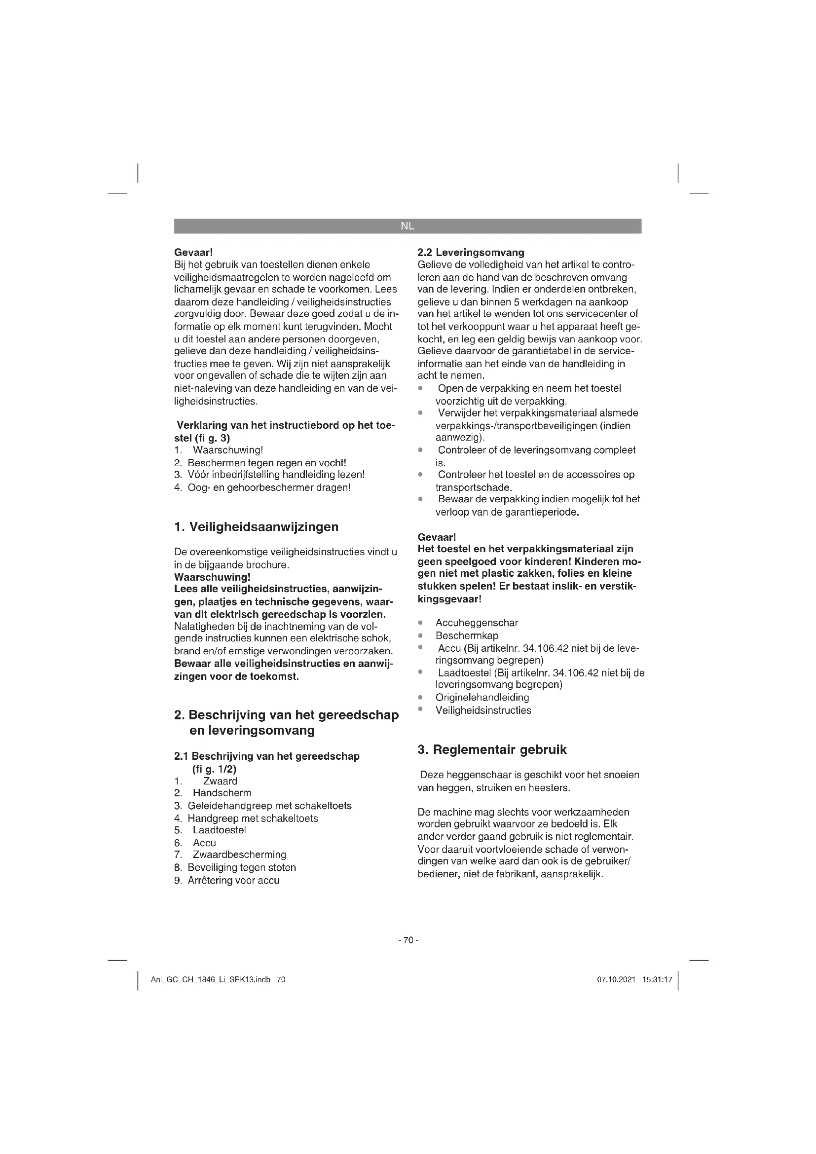 Deze heggenschaar is geschikt voor het snoeien van heggen, struiken en heesters. De machine mag slechts voor werkzaamheden worden gebruikt waarvoor ze bedoeld is. Elk ander verder gaand gebruik is niet reglementair. Voor daaruit voortvloeiende schade of verwon- dingen van welke aard dan ook is de gebruiker/ bediener, niet de fabrikant, aansprakelijk. Anl_GC_CH_1846_Li_SPK13.indb 70Anl_GC_CH_1846_Li_SPK13.indb 70 07.10.2021 15:31:1707.10.2021 15:31:17NL