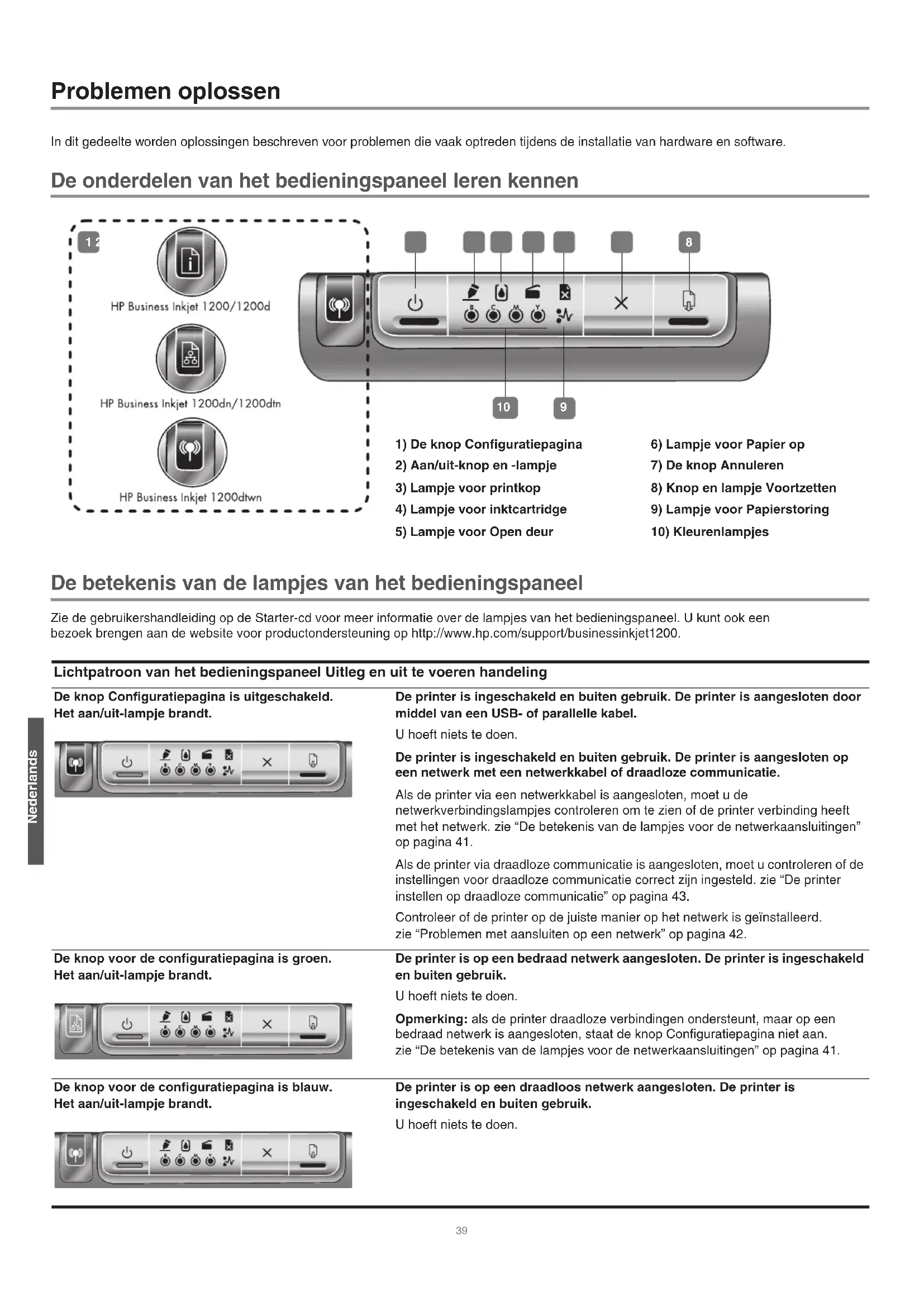 dialoogvensters te sluiten. Problemen met aansluiten op een bedraad netwerk Als het verbindingslampje op de netwerkaansluiting niet brandt, controleert u of aan alle onder “Algemene netwerkproblemen oplossen” voorwaarden is voldaan. Het is niet aan te raden de printer een vast IP-adres te geven, maar het is goed mogelijk dat sommige installatieproblemen op die manier kunnen worden opgelost (zoals een tegenstrijdigheid met een persoonlijke firewall). Zie de gebruikershandleiding voor meer informatie. Problemen met het installeren van draadloze communicatie Als u na installatie van de software en het verwijderen van de netwerkkabel nog steeds geen communicatie met de printer krijgt, is mogelijk een van de volgende netwerkinstellingen van de printer niet juist: Naam netwerk (SSID) Communicatiemethode Kanaal (alleen ad-hocnetwerken) Beveiligingsinstellingen en beveiligingssleutel Zie “De printer instellen op draadloze communicatie” op pagina 43 voor informatie over de juiste configuratie van deze instellingen. Netwerkinstellingen van de printer opnieuw instellen Als de printer geen verbinding met het netwerk krijgt, kunt u de netwerkinstellingen van de printer wijzigen: 1 Houd de knop Configuratiepagina ingedrukt en druk driemaal op de knop (Voortzetten). 2 Als u het printerstuurprogramma hebt geïnstalleerd, moet u printerstuurprogramma verwijderen en daarna opnieuw installeren. Opmerking: zie het leesmij-bestand en de versieopmerkingen voor de laatste informatie of ga naar de website voor productondersteuning op http://www.hp.com/support/businessinkjet1200. HPCrickMLK_GSG_UGFDIA.book Page 42 Wednesday, May 19, 2004 4:26 PM43 Nederlands Hulpmiddelen voor het oplossen van problemen en voor de configuratie Voor het oplossen van problemen met de printer en voor de configuratie van de printer zijn de volgende hulpmiddelen beschikbaar. Zie de gebruikershandleiding op de Starter-cd voor meer informatie over deze hulpmiddelen. Configuratiepagina Gebruik de configuratiepagina om de huidige printerinstellingen te bekijken, hulp te zoeken bij het oplossen van problemen met de printer en om de plaatsing van optionele accessoires als laden te controleren. De configuratiepagina bevat ook een log met recente gebeurtenissen. Als de printer op een netwerk is aangesloten, wordt een extra configuratiepagina voor het netwerk afgedrukt. Hierop staan de netwerkinstellingen voor de printer. Als u HP wilt bellen, drukt u eerst de configuratiepagina af. Een configuratiepagina afdrukken Druk eenmaal op de knop Configuratiepagina. Ingesloten webserver Als de printer op een netwerk is aangesloten, kunt u de ingesloten webserver van de printer gebruiken om informatie over de status te bekijken, instellingen te wijzigen en de printer vanaf de computer te beheren. De ingesloten webserver openen Typ in een ondersteunde webbrowser op uw computer het IP-adres dat aan de printer is toegewezen. Als het IP-adres bijvoorbeeld