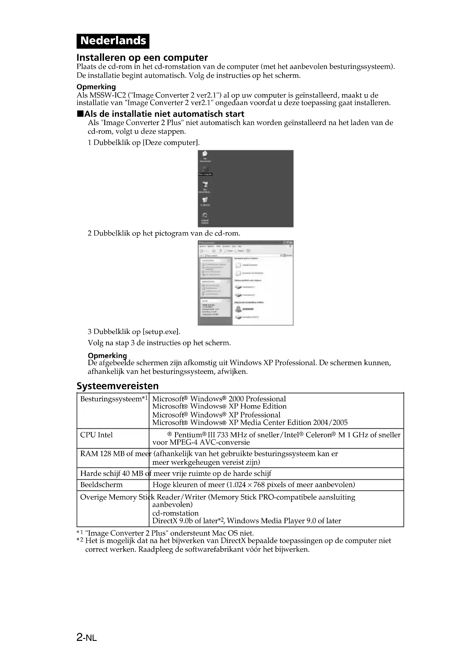 ”.2-NL Nederlands Installeren op een computer Plaats de cd-rom in het cd-romstation van de computer (met het aanbevolen besturingssysteem). De installatie begint automatisch. Volg de instructies op het scherm. Opmerking Als MSSW-IC2 ("Image Converter 2 ver2.1") al op uw computer is geïnstalleerd, maakt u de installatie van "Image Converter 2 ver2.1" ongedaan voordat u deze toepassing gaat installeren. x Als de installatie niet automatisch start Als "Image Converter 2 Plus" niet automatisch kan worden geïnstalleerd na het laden van de cd-rom, volgt u deze stappen. 1 Dubbelklik op [Deze computer]. 2 Dubbelklik op het pictogram van de cd-rom. 3 Dubbelklik op [setup.exe]. Volg na stap 3 de instructies op het scherm. Opmerking De afgebeelde schermen zijn afkomstig uit Windows XP Professional. De schermen kunnen, afhankelijk van het besturingssysteem, afwijken. Systeemvereisten Besturingssysteem*