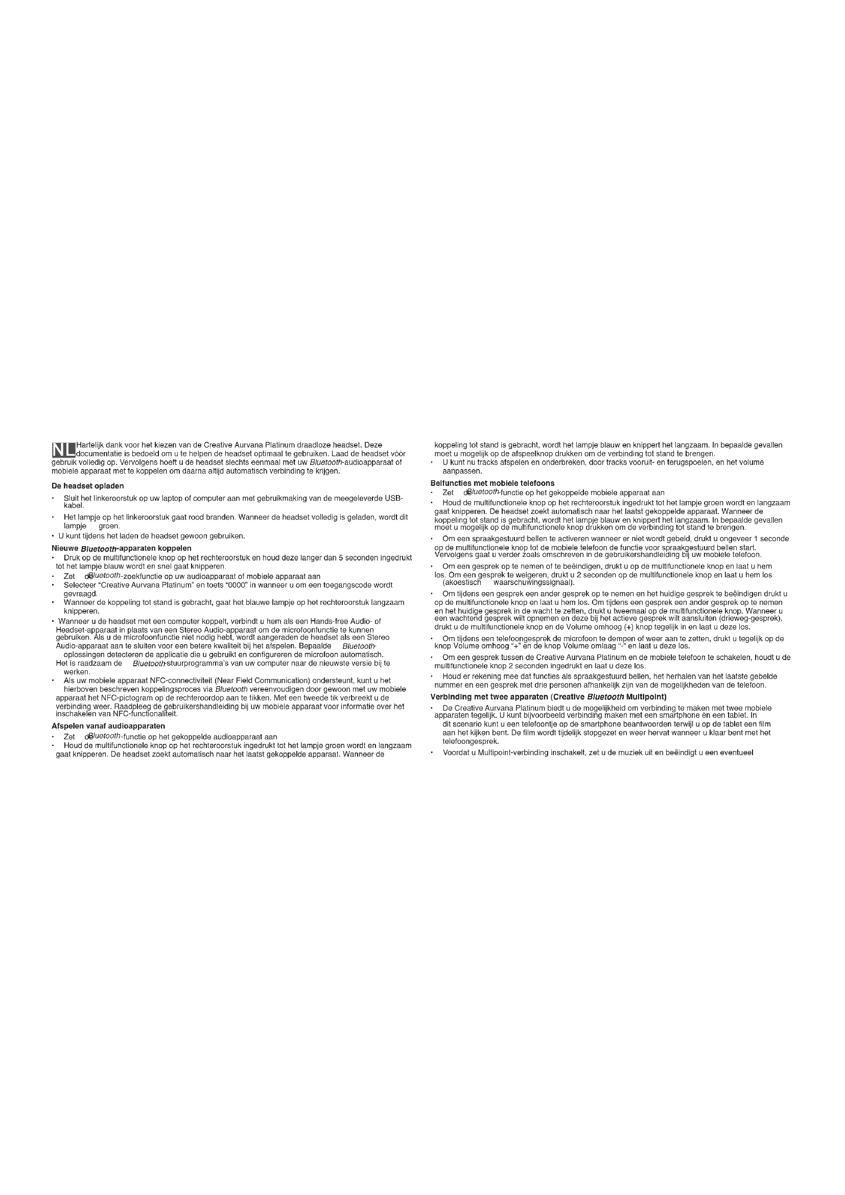 (Near Field Communication) Toca aquí los dispositivos móviles que admiten NFC para establecer la sincronización y conexión Bluetooth. Vuelve a tocar para fi nalizar la conexión.NL Hartelijk dank voor het kiezen van de Creative Aurvana Platinum draadloze headset. Deze documentatie is bedoeld om u te helpen de headset optimaal te gebruiken. Laad de headset vóór gebruik volledig op. Vervolgens hoeft u de headset slechts eenmaal met uw Bluetooth-audioapparaat of mobiele apparaat met te koppelen om daarna altijd automatisch verbinding te krijgen. De headset opladen