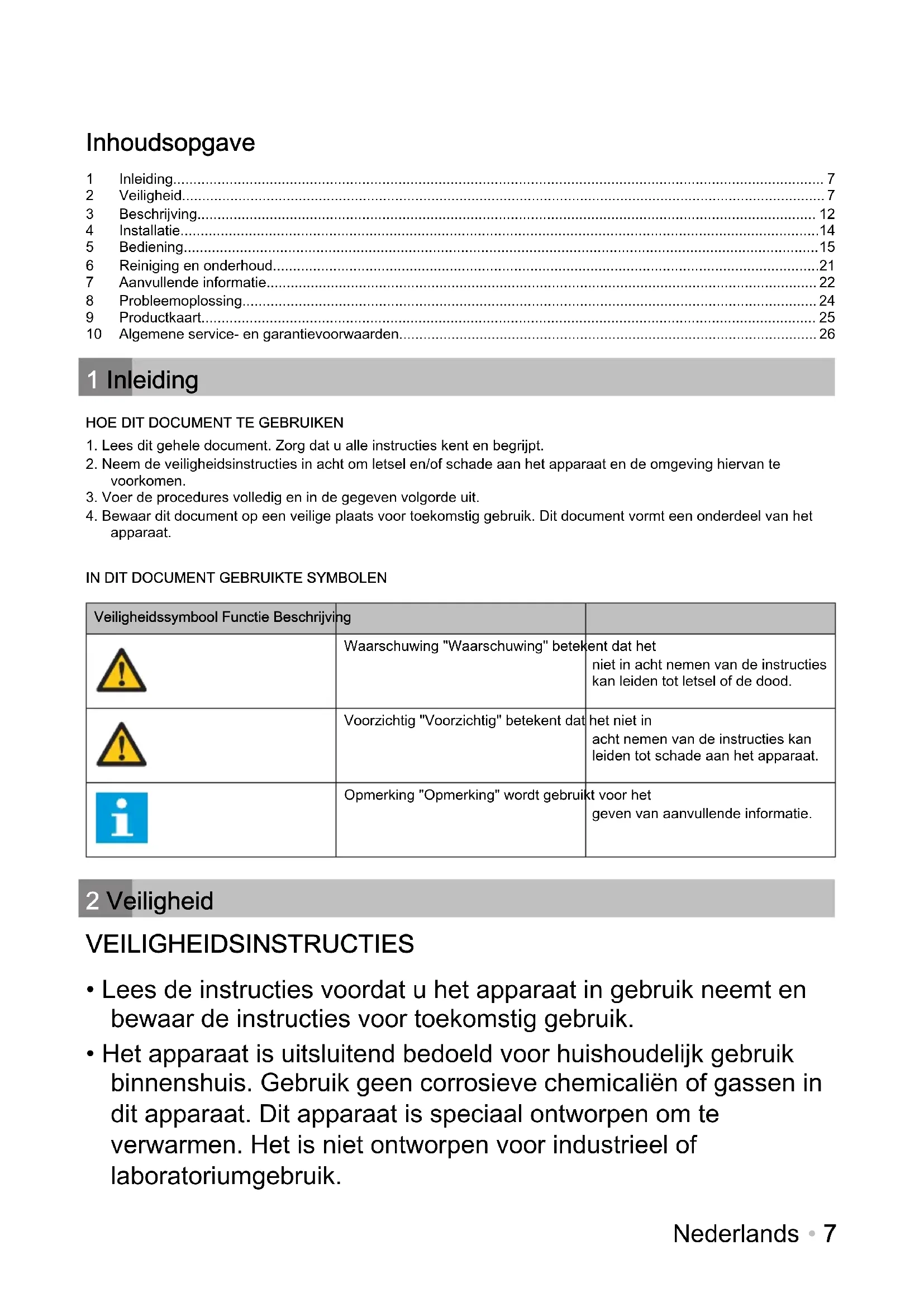 - Het apparaat is uitsluitend bedoeld voor huishoudelijk gebruik binnenshuis. Gebruik geen corrosieve chemicaliën of gassen in dit apparaat. Dit apparaat is speciaal ontworpen om te verwarmen. Het is niet ontworpen voor industrieel of laboratoriumgebruik. Nederlands