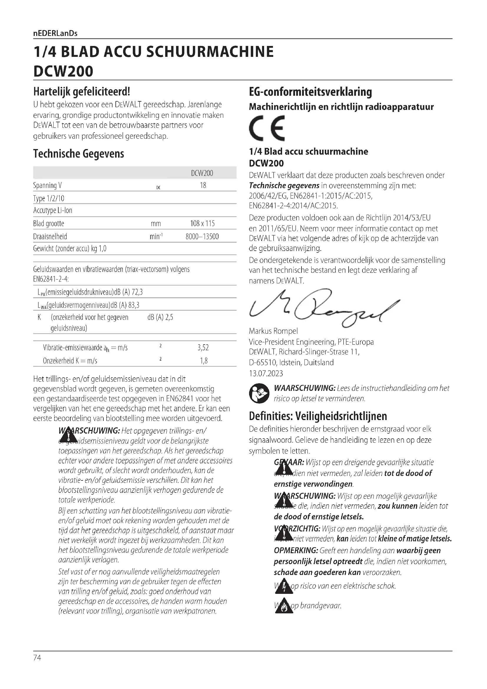 - Le batterie agli ioni di litio sono riciclabili. Consegnarle al proprio rivenditore o presso un centro di riciclo di zona. Le batterie raccolte saranno riciclate o smaltite in modocorretto. del liquido all’interno dell’utensile e non immergere alcuno dei suoi componenti direttamente in unliquido. Le feritoie di ventilazione possono essere pulite con uno spazzolino asciutto e morbido di materiale non metallico e/o con un aspirapolvere adatto. Non utilizzare acqua o soluzioni detergenti. Indossare occhiali di protezione e una mascherina antipolvereomologati.74 nEDERLanDs WAARSCHUWING: Lees de instructiehandleiding om het risico op letsel teverminderen. Definities: Veiligheidsrichtlijnen De definities hieronder beschrijven de ernstgraad voor elk signaalwoord. Gelieve de handleiding te lezen en op deze symbolen teletten. GEVAAR: Wijst op een dreigende gevaarlijke situatie die, indien niet vermeden, zal leiden tot de dood of ernstigeverwondingen. WAARSCHUWING: Wijst op een mogelijk gevaarlijke situatie die, indien niet vermeden, zou kunnen leiden tot de dood of ernstigeletsels. VOORZICHTIG: Wijst op een mogelijk gevaarlijke situatie die, indien niet vermeden, kan leiden tot kleine of matigeletsels. OPMERKING: Geeft een handeling aan waarbij geen persoonlijk letsel optreedt die, indien niet voorkomen, schade aan goederen kanveroorzaken. Wijst op risico van een elektrischeschok. Wijst opbrandgevaar. EG‑conformiteitsverklaring Machinerichtlijn en richtlijn radioapparatuur 1/4Blad accu schuurmachine DCW200 DeWALT verklaart dat deze producten zoals beschreven onder Technische gegevens in overeenstemming zijn met: 2006/42/EG, EN62841-1:2015/AC:2015, EN62841-2-4:2014/AC:2015.Deze producten voldoen ook aan de Richtlijn 2014/53/EU en 2011/65/EU. Neem voor meer informatie contact op met DeWALT via het volgende adres of kijk op de achterzijde van degebruiksaanwijzing.De ondergetekende is verantwoordelijk voor de samenstelling van het technische bestand en legt deze verklaring af namensDeWALT.Markus Rompel Vice-President Engineering, PTE-Europa DeWALT, Richard-Slinger-Strase 11, D-65510, Idstein, Duitsland 13.07.2023Het trillings- en/of geluidsemissieniveau dat in dit gegevensblad wordt gegeven, is gemeten overeenkomstig een gestandaardiseerde test opgegeven in 62841 voor het vergelijken van het ene gereedschap met het andere. Er kan een eerste beoordeling van blootstelling mee wordenuitgevoerd. WAARSCHUWING: Het opgegeven trillings- en/ geluidsemissieniveau geldt voor de belangrijkste toepassingen van het gereedschap. Als het gereedschap echter voor andere toepassingen of met andere accessoires wordt gebruikt, of slecht wordt onderhouden, kan de vibratie- en/of geluidsemissie verschillen. Dit kan het blootstellingsniveau aanzienlijk verhogen gedurende de totalewerkperiode.Bij een schatting van het blootstellingsniveau aan vibratie- en/of geluid moet ook rekening worden gehouden met de tijd dat het gereedschap is uitgeschakeld, of aanstaat maar niet werkelijk wordt ingezet bij werkzaamheden. Dit kan het blootstellingsniveau gedurende de totale werkperiode aanzienlijkverlagen.Stel vast of er nog aanvullende veiligheidsmaatregelen zijn ter bescherming van de gebruiker tegen de effecten van trilling en/of geluid, zoals: goed onderhoud van gereedschap en de accessoires, de handen warm houden (relevant voor trilling), organisatie vanwerkpatronen.DCW200Spanning V