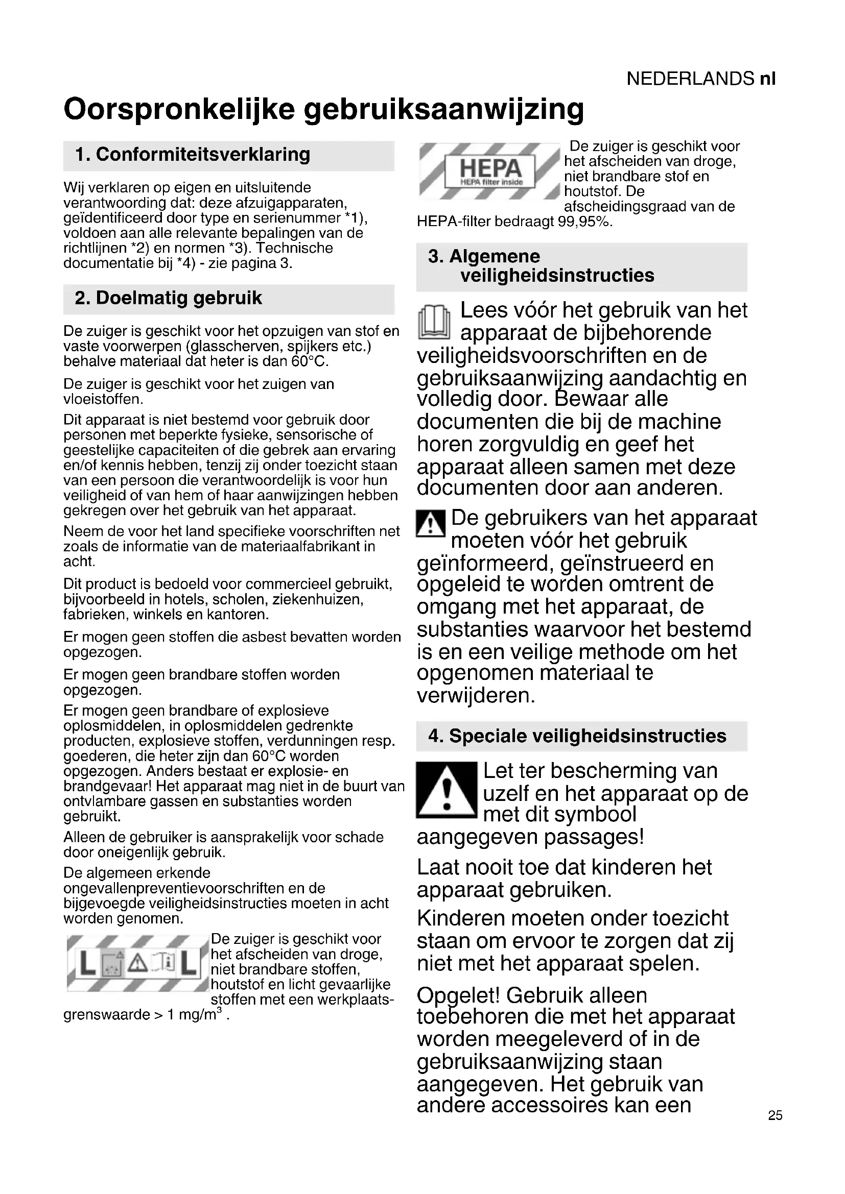 Oorspronkelijke gebruiksaanwijzing Wij verklaren op eigen en uitsluitende verantwoording dat: deze afzuigapparaten, geïdentificeerd door type en serienummer *1), voldoen aan alle relevante bepalingen van de richtlijnen *2) en normen *3). Technische documentatie bij *4) - zie pagina 3. De zuiger is geschikt voor het opzuigen van stof en vaste voorwerpen (glasscherven, spijkers etc.) behalve materiaal dat heter is dan 60°C. De zuiger is geschikt voor het zuigen van vloeistoffen. Dit apparaat is niet bestemd voor gebruik door personen met beperkte fysieke, sensorische of geestelijke capaciteiten of die gebrek aan ervaring en/of kennis hebben, tenzij zij onder toezicht staan van een persoon die verantwoordelijk is voor hun veiligheid of van hem of haar aanwijzingen hebben gekregen over het gebruik van het apparaat. Neem de voor het land specifieke voorschriften net zoals de informatie van de materiaalfabrikant in acht. Dit product is bedoeld voor commercieel gebruikt, bijvoorbeeld in hotels, scholen, ziekenhuizen, fabrieken, winkels en kantoren. Er mogen geen stoffen die asbest bevatten worden opgezogen. Er mogen geen brandbare stoffen worden opgezogen. Er mogen geen brandbare of explosieve oplosmiddelen, in oplosmiddelen gedrenkte producten, explosieve stoffen, verdunningen resp. goederen, die heter zijn dan 60°C worden opgezogen. Anders bestaat er explosie- en brandgevaar! Het apparaat mag niet in de buurt van ontvlambare gassen en substanties worden gebruikt. Alleen de gebruiker is aansprakelijk voor schade door oneigenlijk gebruik. De algemeen erkende ongevallenpreventievoorschriften en de bijgevoegde veiligheidsinstructies moeten in acht worden genomen. De zuiger is geschikt voor het afscheiden van droge, niet brandbare stoffen, houtstof en licht gevaarlijke stoffen met een werkplaats- grenswaarde > 1 mg/m³ . De zuiger is geschikt voor het afscheiden van droge, niet brandbare stof en houtstof. De afscheidingsgraad van de HEPA-filter bedraagt 99,95%. Lees vóór het gebruik van het apparaat de bijbehorende veiligheidsvoorschriften en de gebruiksaanwijzing aandachtig en volledig door. Bewaar alle documenten die bij de machine horen zorgvuldig en geef het apparaat alleen samen met deze documenten door aan anderen. De gebruikers van het apparaat moeten vóór het gebruik geïnformeerd, geïnstrueerd en opgeleid te worden omtrent de omgang met het apparaat, de substanties waarvoor het bestemd is en een veilige methode om het opgenomen materiaal te verwijderen. Let ter bescherming van uzelf en het apparaat op de met dit symbool aangegeven passages! Laat nooit toe dat kinderen het apparaat gebruiken. Kinderen moeten onder toezicht staan om ervoor te zorgen dat zij niet met het apparaat spelen. Opgelet! Gebruik alleen toebehoren die met het apparaat worden meegeleverd of in de gebruiksaanwijzing staan aangegeven. Het gebruik van andere accessoires kan een