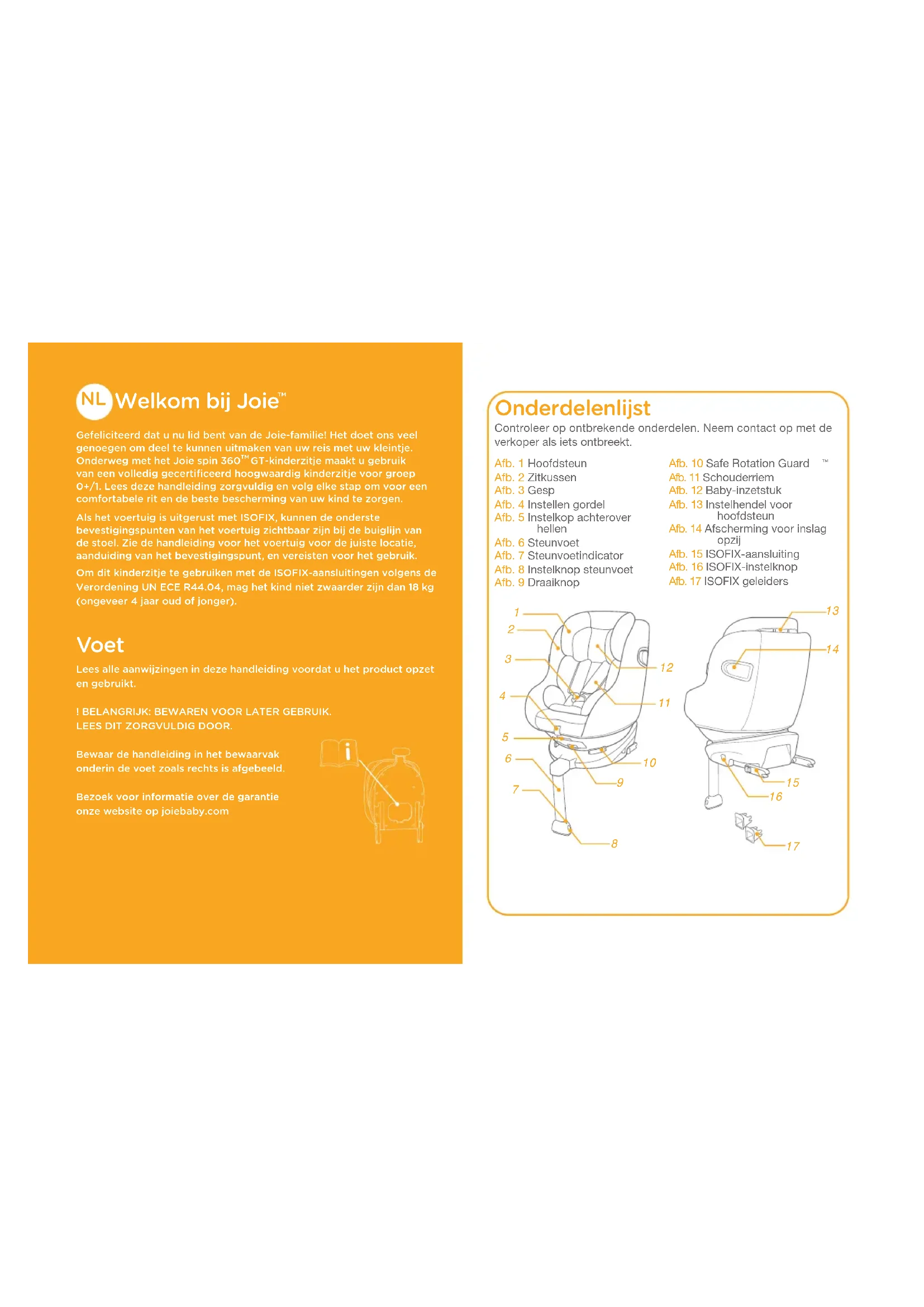 Gefeliciteerd dat u nu lid bent van de Joie-familie! Het doet ons veel genoegen om deel te kunnen uitmaken van uw reis met uw kleintje. Onderweg met het Joie spin 360 GT-kinderzitje maakt u gebruik van een volledig gecertificeerd hoogwaardig kinderzitje voor groep 0+/1. Lees deze handleiding zorgvuldig en volg elke stap om voor een comfortabele rit en de beste bescherming van uw kind te zorgen.Als het voertuig is uitgerust met ISOFIX, kunnen de onderste bevestigingspunten van het voertuig zichtbaar zijn bij de buiglijn van de stoel. Zie de handleiding voor het voertuig voor de juiste locatie, aanduiding van het bevestigingspunt, en vereisten voor het gebruik.Om dit kinderzitje te gebruiken met de ISOFIX-aansluitingen volgens de Verordening UN ECE R44.04, mag het kind niet zwaarder zijn dan 18 kg (ongeveer 4 jaar oud of jonger). Voet Lees alle aanwijzingen in deze handleiding voordat u het product opzet en gebruikt.! BELANGRIJK: BEWAREN VOOR LATER GEBRUIK.LEES DIT ZORGVULDIG DOOR.Bewaar de handleiding in het bewaarvak onderin de voet zoals rechts is afgebeeld.Bezoek voor informatie over de garantie onze website op joiebaby.com Onderdelenlijst Controleer op ontbrekende onderdelen. Neem contact op met de verkoper als iets ontbreekt.