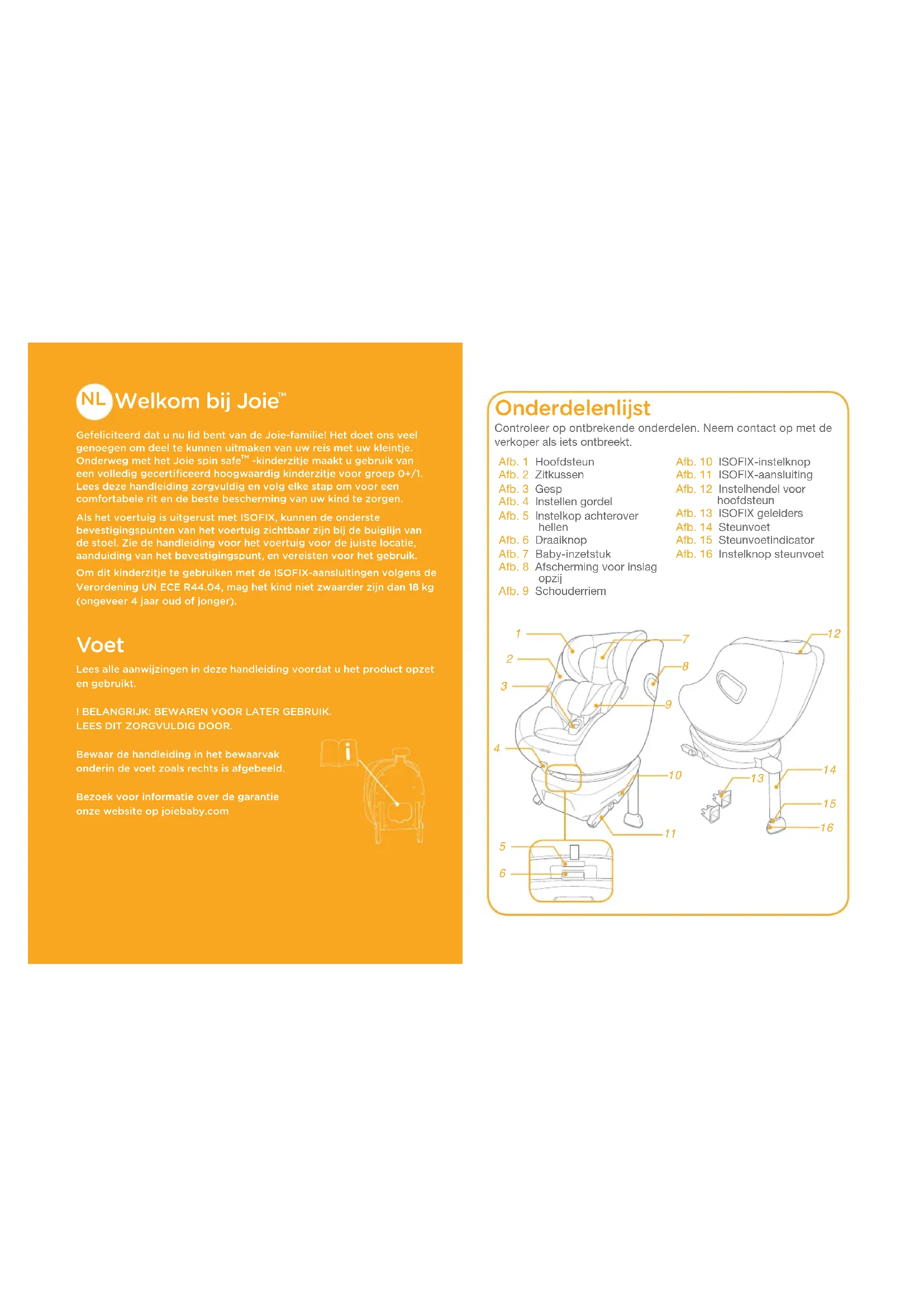 Gefeliciteerd dat u nu lid bent van de Joie-familie! Het doet ons veel genoegen om deel te kunnen uitmaken van uw reis met uw kleintje. Onderweg met het Joie spin safe -kinderzitje maakt u gebruik van een volledig gecertificeerd hoogwaardig kinderzitje voor groep 0+/1. Lees deze handleiding zorgvuldig en volg elke stap om voor een comfortabele rit en de beste bescherming van uw kind te zorgen.Als het voertuig is uitgerust met ISOFIX, kunnen de onderste bevestigingspunten van het voertuig zichtbaar zijn bij de buiglijn van de stoel. Zie de handleiding voor het voertuig voor de juiste locatie, aanduiding van het bevestigingspunt, en vereisten voor het gebruik.Om dit kinderzitje te gebruiken met de ISOFIX-aansluitingen volgens de Verordening UN ECE R44.04, mag het kind niet zwaarder zijn dan 18 kg (ongeveer 4 jaar oud of jonger). Voet Lees alle aanwijzingen in deze handleiding voordat u het product opzet en gebruikt.! BELANGRIJK: BEWAREN VOOR LATER GEBRUIK.LEES DIT ZORGVULDIG DOOR.Bewaar de handleiding in het bewaarvak onderin de voet zoals rechts is afgebeeld.Bezoek voor informatie over de garantie onze website op joiebaby.com Onderdelenlijst Controleer op ontbrekende onderdelen. Neem contact op met de verkoper als iets ontbreekt. Afb. 1 HoofdsteunAfb. 2 ZitkussenAfb. 3 GespAfb. 4 Instellen gordelAfb. 5 Instelkop achterover hellenAfb. 6 DraaiknopAfb. 7 Baby-inzetstukAfb. 8 Afscherming voor inslag opzijAfb. 9 SchouderriemAfb. 10 ISOFIX-instelknopAfb. 11 ISOFIX-aansluitingAfb. 12 Instelhendel voor hoofdsteunAfb. 13 ISOFIX geleidersAfb. 14 SteunvoetAfb. 15 SteunvoetindicatorAfb. 16 Instelknop steunvoet47 48 WAARSCHUWING