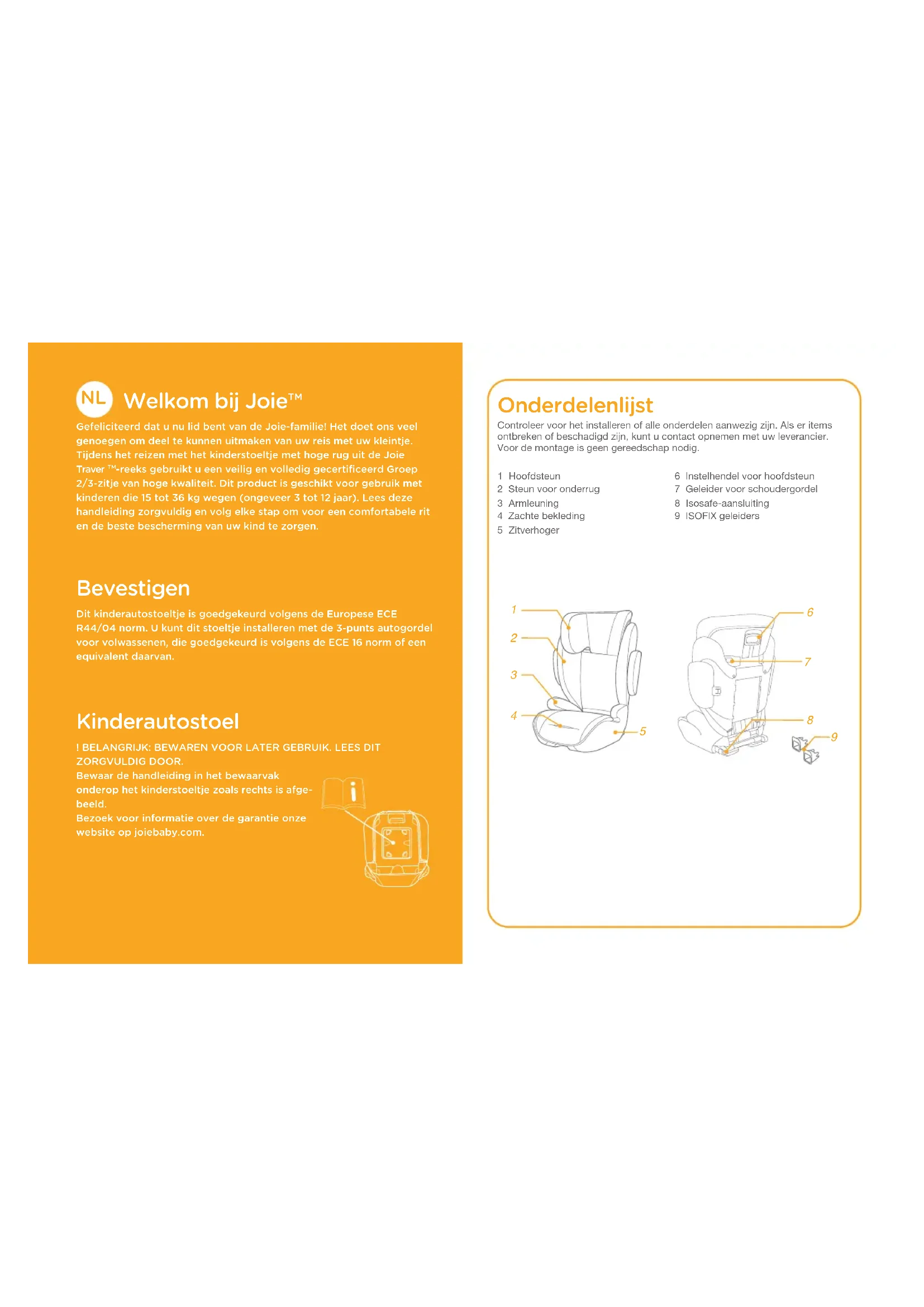 -reeks gebruikt u een veilig en volledig gecertificeerd Groep 2/3-zitje van hoge kwaliteit. Dit product is geschikt voor gebruik met kinderen die 15 tot 36 kg wegen (ongeveer 3 tot 12 jaar). Lees deze handleiding zorgvuldig en volg elke stap om voor een comfortabele rit en de beste bescherming van uw kind te zorgen. Bevestigen Dit kinderautostoeltje is goedgekeurd volgens de Europese ECE R44/04 norm. U kunt dit stoeltje installeren met de 3-punts autogordel voor volwassenen, die goedgekeurd is volgens de ECE 16 norm of een equivalent daarvan. Kinderautostoel ! BELANGRIJK: BEWAREN VOOR LATER GEBRUIK. LEES DIT ZORGVULDIG DOOR. Bewaar de handleiding in het bewaarvak onderop het kinderstoeltje zoals rechts is afge- beeld. Bezoek voor informatie over de garantie onze website op joiebaby.com.