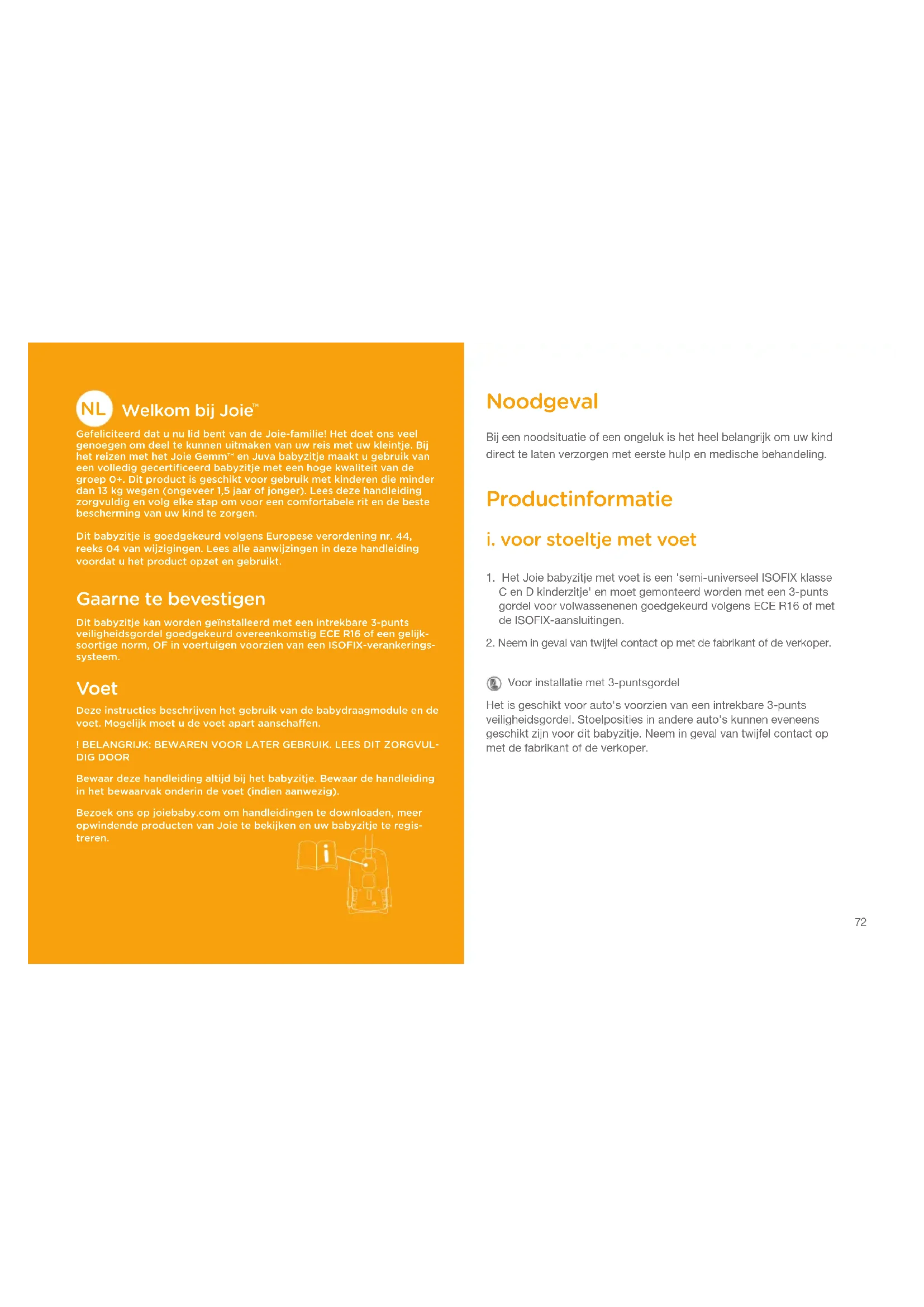 Gefeliciteerd dat u nu lid bent van de Joie-familie! Het doet ons veel genoegen om deel te kunnen uitmaken van uw reis met uw kleintje. Bij het reizen met het Joie Gemm™ en Juva babyzitje maakt u gebruik van een volledig gecertificeerd babyzitje met een hoge kwaliteit van de groep 0+. Dit product is geschikt voor gebruik met kinderen die minder dan 13 kg wegen (ongeveer 1,5 jaar of jonger). Lees deze handleiding zorgvuldig en volg elke stap om voor een comfortabele rit en de beste bescherming van uw kind te zorgen.Dit babyzitje is goedgekeurd volgens Europese verordening nr. 44, reeks 04 van wijzigingen. Lees alle aanwijzingen in deze handleiding voordat u het product opzet en gebruikt. Gaarne te bevestigen Dit babyzitje kan worden geïnstalleerd met een intrekbare 3-punts veiligheidsgordel goedgekeurd overeenkomstig ECE R16 of een gelijk-soortige norm, OF in voertuigen voorzien van een ISOFIX-verankerings-systeem. Voet Deze instructies beschrijven het gebruik van de babydraagmodule en de voet. Mogelijk moet u de voet apart aanschaffen.! BELANGRIJK: BEWAREN VOOR LATER GEBRUIK. LEES DIT ZORGVUL-DIG DOORBewaar deze handleiding altijd bij het babyzitje. Bewaar de handleiding in het bewaarvak onderin de voet (indien aanwezig).Bezoek ons op joiebaby.com om handleidingen te downloaden, meer opwindende producten van Joie te bekijken en uw babyzitje te regis-treren. Noodgeval Bij een noodsituatie of een ongeluk is het heel belangrijk om uw kind direct te laten verzorgen met eerste hulp en medische behandeling. Productinformatie