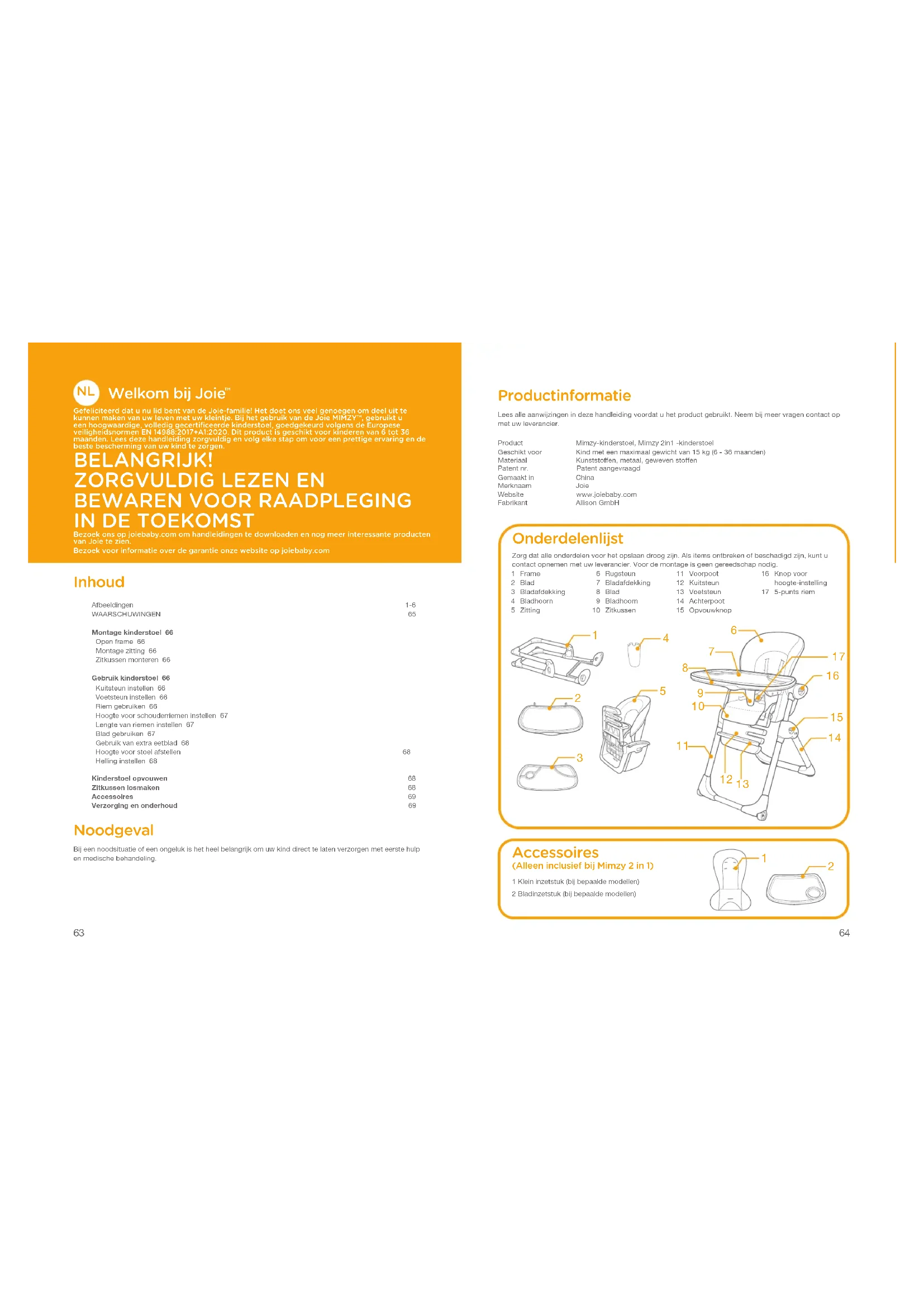 Bezoek ons op joiebaby.com om handleidingen te downloaden en nog meer interessante producten van Joie te zien.Bezoek voor informatie over de garantie onze website op joiebaby.com Inhoud Afbeeldingen 1-6WAARSCHUWINGEN 65Montage kinderstoel 66 Open frame 66 Montage zitting 66 Zitkussen monteren 66 Gebruik kinderstoel 66 Kuitsteun instellen 66 Voetsteun instellen 66 Riem gebruiken 66 Hoogte voor schouderriemen instellen 67 Lengte van riemen instellen 67 Blad gebruiken 67 Gebruik van extra eetblad 68 Hoogte voor stoel afstellen 68 Helling instellen 68Kinderstoel opvouwen 68Zitkussen losmaken 68Accessoires 69Verzorging en onderhoud 69 Noodgeval Bij een noodsituatie of een ongeluk is het heel belangrijk om uw kind direct te laten verzorgen met eerste hulp en medische behandeling. Productinformatie Lees alle aanwijzingen in deze handleiding voordat u het product gebruikt. Neem bij meer vragen contact op met uw leverancier.Product Mimzy-kinderstoel, Mimzy 2in1 -kinderstoelGeschikt voor Kind met een maximaal gewicht van 15 kg (6 - 36 maanden)Materiaal Kunststoffen, metaal, geweven stoffenPatent nr. Patent aangevraagdGemaakt in ChinaMerknaam Joie Website www.joiebaby.com Fabrikant Allison GmbH 1 Frame 2 Blad 3 Bladafdekking 4 Bladhoorn 5 Zitting 6 Rugsteun 7 Bladafdekking 8 Blad 9 Bladhoorn 10 Zitkussen 11 Voorpoot 12 Kuitsteun 13 Voetsteun 14 Achterpoot 15 Opvouwknop 16 Knop voor hoogte-instelling 17 5-punts riem Onderdelenlijst Zorg dat alle onderdelen voor het opslaan droog zijn. Als items ontbreken of beschadigd zijn, kunt u contact opnemen met uw leverancier. Voor de montage is geen gereedschap nodig.