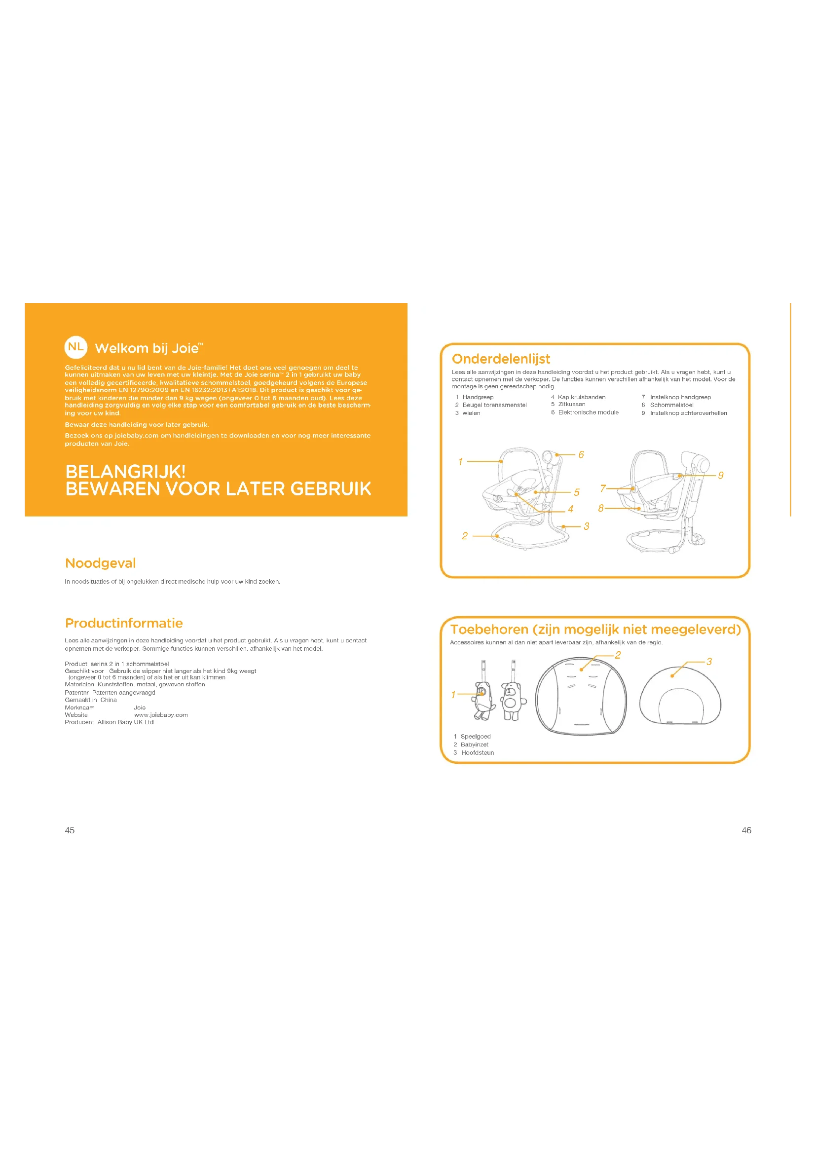 Noodgeval In noodsituaties of bij ongelukken direct medische hulp voor uw kind zoeken. Productinformatie Lees alle aanwijzingen in deze handleiding voordat u het product gebruikt. Als u vragen hebt, kunt u contact opnemen met de verkoper. Sommige functies kunnen verschillen, afhankelijk van het model.Product serina 2 in 1 schommelstoel Geschikt voor Gebruik de wipper niet langer als het kind 9kg weegt (ongeveer 0 tot 6 maanden) of als het er uit kan klimmenMaterialen Kunststoffen, metaal, geweven stoffenPatentnr Patenten aangevraagdGemaakt in ChinaMerknaam JoieWebsite www.joiebaby.com Producent Allison Baby UK Ltd Onderdelenlijst Lees alle aanwijzingen in deze handleiding voordat u het product gebruikt. Als u vragen hebt, kunt u contact opnemen met de verkoper. De functies kunnen verschillen afhankelijk van het model. Voor de montage is geen gereedschap nodig.