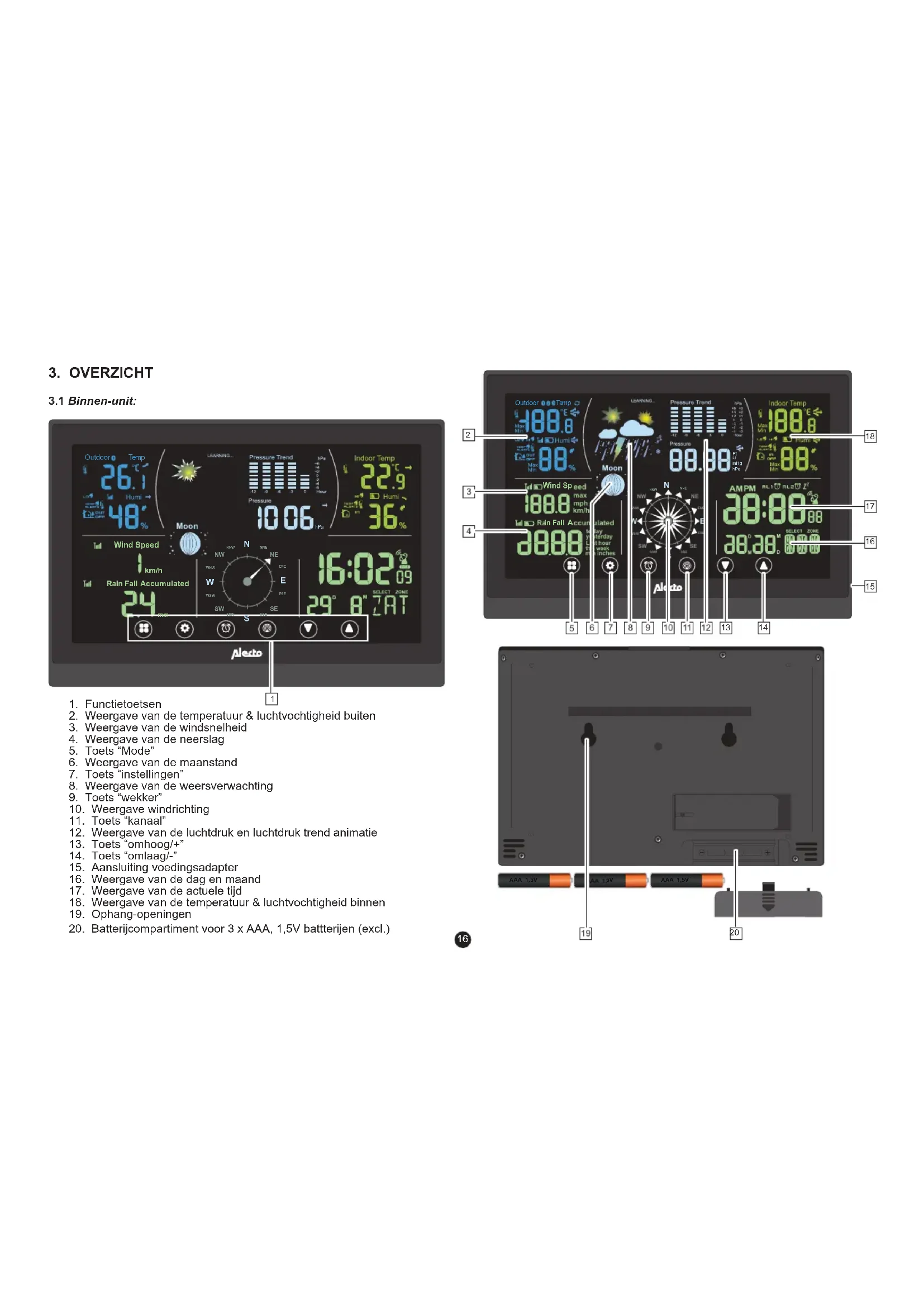 Het Alecto WS-3850 weerstation bestaat uit de volgende componenten: Buiten-unit-wind: De buiten-unit-wind heeft een ingebouwde windsnelheidsmeter, windrichtingssensor, temperatuursensor, vochtigheidssensor en DCF- ontvanger. De meetgegevens van deze sensoren worden draadloos doorgestuurd naar de display-unit. De buiten-unit-wind wordt gevoed door 4 x AA 1,5 Volt batterijen (excl.). De buiten-unit-wind wordt geleverd inclusief bevestigingsmateriaal. Buiten-unit-regen: De buiten-unit-regen heeft een ingebouwde regenmeter. De meetgegevens van de sensor wordt draadloos doorgestuurd naar de display-unit. De buiten-unit-regen wordt gevoed door 2 x AA 1,5 Volt batterijen (excl.). Binnen-unit: De binnen-unit ontvangt de meetgegevens van de buiten- units en beschikt daarnaast over een eigen temperatuursensor, vochtigheidssensor en luchtdruksensor. De binnen-unit wordt gevoed door de meegeleverde voedingsadapter en als back up kunnen 3 x AAA 1,5V batterijen geplaatst worden (excl.). Alle meetgegevens wordt getoond op het 7.5” / 19,1 cm groot kleuren LCD-scherm. Bij gebruik van de adapter zal de snooze/light toets werken als dimmer voor de achtergrondverlichting in 4 stappen. Bij gebruik van alleen batterijen zal de achtergrondverlichting zijn gedoofd. Bij aanraken van de snooze/light toets zal het scherm voor 5 seconden oplichten. INHOUDSOPGAVE