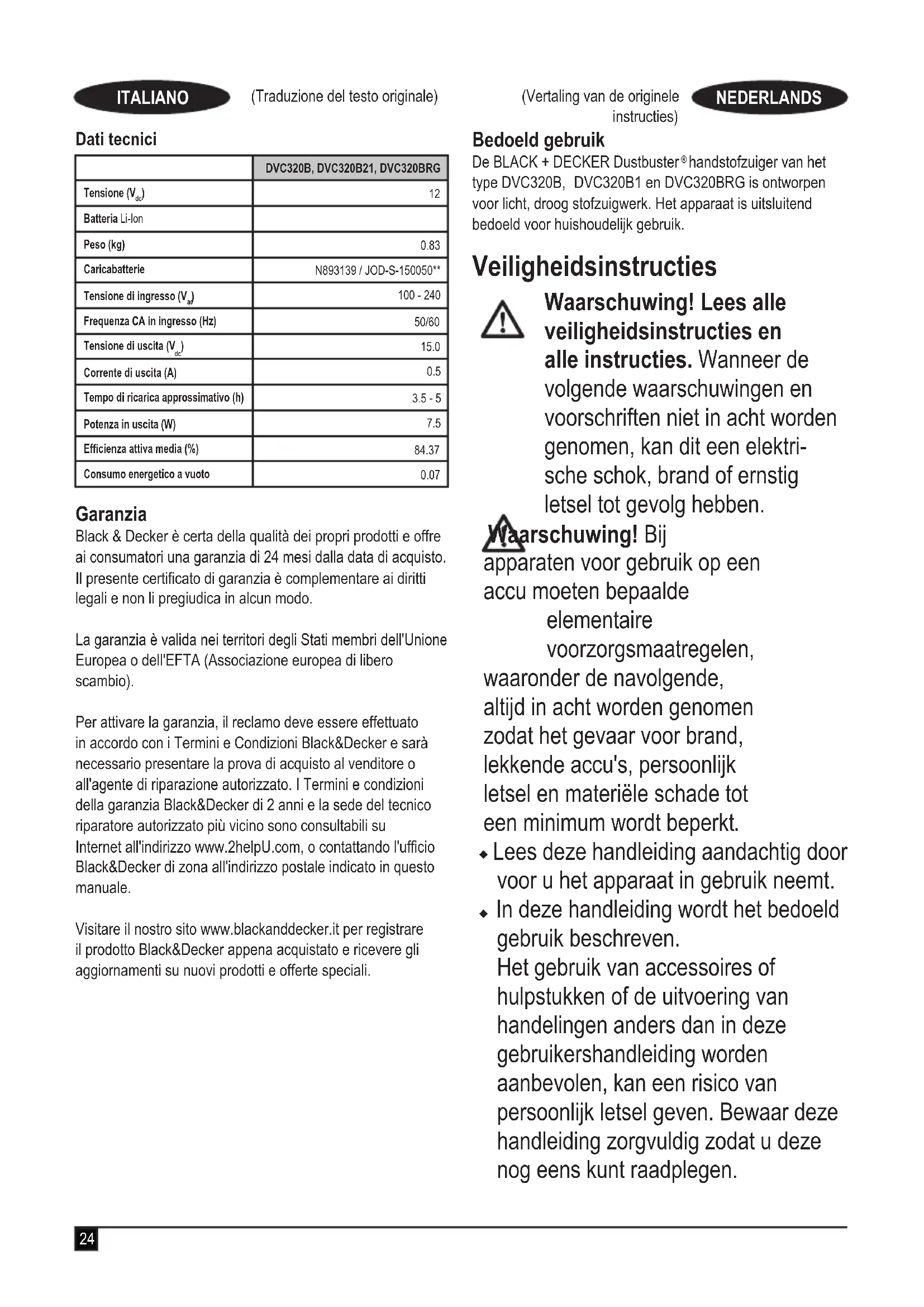 Het laadstation is uitsluitend bestemd voor gebruik binnens- huis. Labels op het apparaat Naast de datumcode worden op het apparaat de volgende pictogrammen afgebeeld. Lees deze handleiding zorgvuldig door voordat u het apparaat in gebruik neemt N893139 / JOD-S-150050** Gebruik alleen de lader van het type N893139 / JOD-S-150050** Functies Dit gereedschap is voorzien van enkele of alle van de volgende functies. 1. Ontgrendelknop kap stofreservoir 2. Stofreservoir 3. Voorlter 4. Filter 5. Accu 6. Accu-vrijgaveknop 7. Mondstuk voor kieren 8. Borstel 9. Laadstation 10. Laadadapter 11. Aan/uit-knop 12. Behuizing28 (Vertaling van de originele instructies) NEDERLANDS Bediening u Druk op de aan/uit-knop (11), zoals in afbeelding A wordt getoond u Het apparaat start op hoge snelheid op. Druk op de knop als u de snelheid wilt verlagen. u Druk nogmaals op de aan/uit-knop en het apparaat komt tot stilstand. Accessoires bevestigen u Wilt u de Borstel (8) die als accessoire is meegeleverd, gebruiken, steek de borstel dan in de luchtinlaat, zoals in afbeelding B wordt getoond, en start vervolgens het apparaat. u Wilt u het mondstuk voor kieren (7), dat als accessoire is meegeleverd, gebruiken, steek het mondstuk voor kieren dan in de luchtinlaat, zoals in afbeelding B wordt getoond, en start vervolgens het apparaat. Opladen u Steek de stekker van het laadadapter (10) in het stopcontact, zoals wordt getoond in afbeelding C. u Zet het apparaat in het laadstation (9) zo dat de aansluiting in het apparaat vastzit in de stekker van het laadadapter, zoals in afbeelding D wordt getoond. u Het LED-indicatielampje van de lader gaat branden en het laden van het apparaat begint. Wanneer het apparaat geheel is opgeladen, gaat het LED-indicatielampje van de lader uit. Waarschuwing! Voorkom verontreiniging van de accu, laad de accu niet buiten het apparaat op. De lters reinigen u Draai het stofreservoir (2) naar rechts los van de behuizing van het apparaat, zoals in afbeelding F wordt getoond. u Pak de greep (4) van het lter vast en draai het stofreservoir zodat u het Filter (4) kunt uitnemen. u Druk op de vrijgavehendel (1) van de kap van het stofreservoir en schud het vuil uit het stofreservoir, zoals wordt getoond in afbeelding G. u Maak het stofreservoir goed leeg. Het stofreservoir kan met water worden schoongespoeld. Het moet daarna wel droog worden gemaakt. u Het voorlter kan met water worden schoongespoeld en moet daarna droog worden gemaakt. De lters vervangen De lters moeten om de 6 tot 9 maanden worden vervangen of wanneer ze maar versleten of beschadigd zijn. Reservelters zijn verkrijgbaar bij de BLACK + DECKER- leverancier. Opslag Het apparaat kan met het laadstation (10) veilig worden opgeborgen zoals in afbeelding D wordt getoond. Onderhoud Het BLACK+DECKER-apparaat/-gereedschap (met netsnoer/snoerloos) is ontworpen om gedurende lange tijd te functioneren met een minimum aan onderhoud. Het continu naar tevredenheid functioneren hangt af van de juiste zorg voor het gereedschap en regelmatig schoonmaken. Waarschuwing! Ga altijd als volgt te werk voor u onderhouds- of reinigingswerkzaamheden aan het gereedschap (met snoer/snoerloos) uitvoert: u Schakel het gereedschap/apparaat uit en trek de stekker uit het stopcontact. u Of schakel het gereedschap/apparaat uit en verwijder de accu als het een afzonderlijke accu heeft. u Of laat de accu volledig ontladen als de accu is ingebouwd en schakel het apparaat uit. u Trek de stekker van de lader uit het stopcontact voordat u de lader schoonmaakt. Behalve regelmatige reiniging vraagt de lader geen onderhoud. u Reinig regelmatig de ventilatieopeningen van het gereedschap/apparaat/lader met een zachte borstel of droge doek. u Reinig de behuizing van de motor regelmatig met een vochtige doek. Gebruik niet een schurend schoonmaakmiddel of een schoonmaakmiddel op basis van een oplosmiddel. Het milieu beschermen