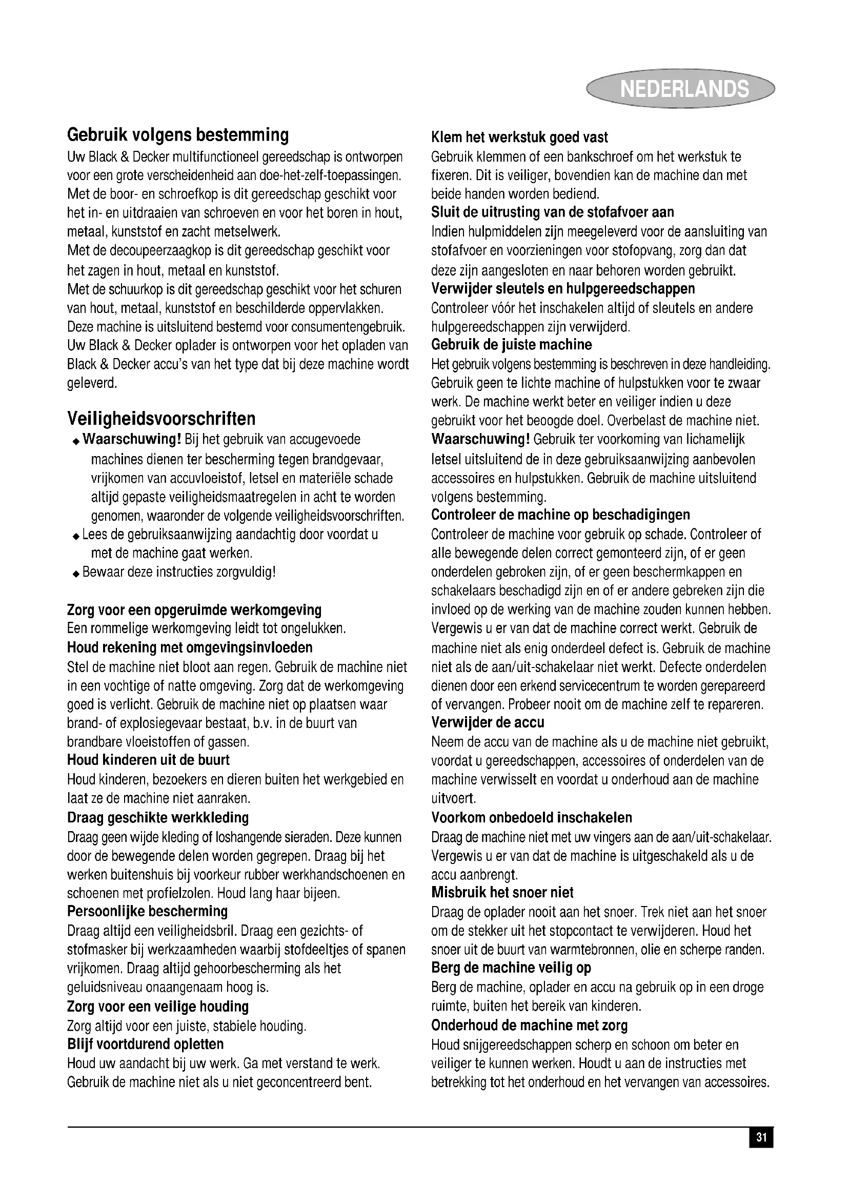 Colin Wills Director of Engineering BDCI, 4/F, 2 Dai Wang Street Tai Po Industrial Estate Tai Po NT, Hong Kong Garanzia Certa della qualità dei suoi prodotti, Black & Decker offre una garanzia eccezionale. Il presente certificato di garanzia è complementare ai diritti statutari e non li pregiudica in alcun modo. La garanzia è valida entro il territorio degli Stati membri dell’Unione Europea e dell’EFTA (European Free Trade Area). Se un prodotto Black & Decker risulta difettoso per qualità del30 ITALIANO materiale, della costruzione o per mancata conformità entro 24 mesi dalla data di acquisto, Black & Decker garantisce la sostituzione delle parti difettose, provvede alla riparazione dei prodotti se ragionevolmente usurati oppure alla loro sostituzione, in modo da ridurre al minimo il disagio del cliente a meno che: ◆ Il prodotto non sia stato destinato ad usi commerciali, professionali o al noleggio; ◆ Il prodotto non sia stato usato in modo improprio o scorretto; ◆ Il prodotto non abbia subito danni causati da oggetti o sostanze estranee oppure incidenti; ◆ Il prodotto non abbia subito tentativi di riparazione non effettuati da tecnici autorizzati né dall’assistenza Black & Decker. Per attivare la garanzia è necessario esibire la prova comprovante l’acquisto al venditore o al tecnico autorizzato. Per individuare il tecnico autorizzato più vicino, rivolgersi alla sede Black & Decker locale, presso il recapito indicato nel presente manuale. Altrimenti un elenco completo di tutti i tecnici autorizzati Black & Decker e i dettagli completi sui contatti e i servizi post-vendita sono disponibili su Internet presso: www.2helpU.com.31 NEDERLANDS Gebruik volgens bestemming Uw Black & Decker multifunctioneel gereedschap is ontworpen voor een grote verscheidenheid aan doe-het-zelf-toepassingen. Met de boor- en schroefkop is dit gereedschap geschikt voor het in- en uitdraaien van schroeven en voor het boren in hout, metaal, kunststof en zacht metselwerk. Met de decoupeerzaagkop is dit gereedschap geschikt voor het zagen in hout, metaal en kunststof. Met de schuurkop is dit gereedschap geschikt voor het schuren van hout, metaal, kunststof en beschilderde oppervlakken. Deze machine is uitsluitend bestemd voor consumentengebruik. Uw Black & Decker oplader is ontworpen voor het opladen van Black & Decker accu’s van het type dat bij deze machine wordt geleverd. Veiligheidsvoorschriften ◆ Waarschuwing! Bij het gebruik van accugevoede machines dienen ter bescherming tegen brandgevaar, vrijkomen van accuvloeistof, letsel en materiële schade altijd gepaste veiligheidsmaatregelen in acht te worden genomen, waaronder de volgende veiligheidsvoorschriften. ◆ Lees de gebruiksaanwijzing aandachtig door voordat u met de machine gaat werken. ◆ Bewaar deze instructies zorgvuldig! Zorg voor een opgeruimde werkomgeving Een rommelige werkomgeving leidt tot ongelukken. Houd rekening met omgevingsinvloeden Stel de machine niet bloot aan regen. Gebruik de machine niet in een vochtige of natte omgeving. Zorg dat de werkomgeving goed is verlicht. Gebruik de machine niet op plaatsen waar brand- of explosiegevaar bestaat, b.v. in de buurt van brandbare vloeistoffen of gassen. Houd kinderen uit de buurt Houd kinderen, bezoekers en dieren buiten het werkgebied en laat ze de machine niet aanraken. Draag geschikte werkkleding Draag geen wijde kleding of loshangende sieraden. Deze kunnen door de bewegende delen worden gegrepen. Draag bij het werken buitenshuis bij voorkeur rubber werkhandschoenen en schoenen met profielzolen. Houd lang haar bijeen. Persoonlijke bescherming Draag altijd een veiligheidsbril. Draag een gezichts- of stofmasker bij werkzaamheden waarbij stofdeeltjes of spanen vrijkomen. Draag altijd gehoorbescherming als het geluidsniveau onaangenaam hoog is. Zorg voor een veilige houding Zorg altijd voor een juiste, stabiele houding. Blijf voortdurend opletten Houd uw aandacht bij uw werk. Ga met verstand te werk. Gebruik de machine niet als u niet geconcentreerd bent. Klem het werkstuk goed vast Gebruik klemmen of een bankschroef om het werkstuk te fixeren. Dit is veiliger, bovendien kan de machine dan met beide handen worden bediend. Sluit de uitrusting van de stofafvoer aan Indien hulpmiddelen zijn meegeleverd voor de aansluiting van stofafvoer en voorzieningen voor stofopvang, zorg dan dat deze zijn aangesloten en naar behoren worden gebruikt. Verwijder sleutels en hulpgereedschappen Controleer vóór het inschakelen altijd of sleutels en andere hulpgereedschappen zijn verwijderd. Gebruik de juiste machine Het gebruik volgens bestemming is beschreven in deze handleiding. Gebruik geen te lichte machine of hulpstukken voor te zwaar werk. De machine werkt beter en veiliger indien u deze gebruikt voor het beoogde doel. Overbelast de machine niet. Waarschuwing! Gebruik ter voorkoming van lichamelijk letsel uitsluitend de in deze gebruiksaanwijzing aanbevolen accessoires en hulpstukken. Gebruik de machine uitsluitend volgens bestemming. Controleer de machine op beschadigingen Controleer de machine voor gebruik op schade. Controleer of alle bewegende delen correct gemonteerd zijn, of er geen onderdelen gebroken zijn, of er geen beschermkappen en schakelaars beschadigd zijn en of er andere gebreken zijn die invloed op de werking van de machine zouden kunnen hebben. Vergewis u er van dat de machine correct werkt. Gebruik de machine niet als enig onderdeel defect is. Gebruik de machine niet als de aan/uit-schakelaar niet werkt. Defecte onderdelen dienen door een erkend servicecentrum te worden gerepareerd of vervangen. Probeer nooit om de machine zelf te repareren. Verwijder de accu Neem de accu van de machine als u de machine niet gebruikt, voordat u gereedschappen, accessoires of onderdelen van de machine verwisselt en voordat u onderhoud aan de machine uitvoert. Voorkom onbedoeld inschakelen Draag de machine niet met uw vingers aan de aan/uit-schakelaar. Vergewis u er van dat de machine is