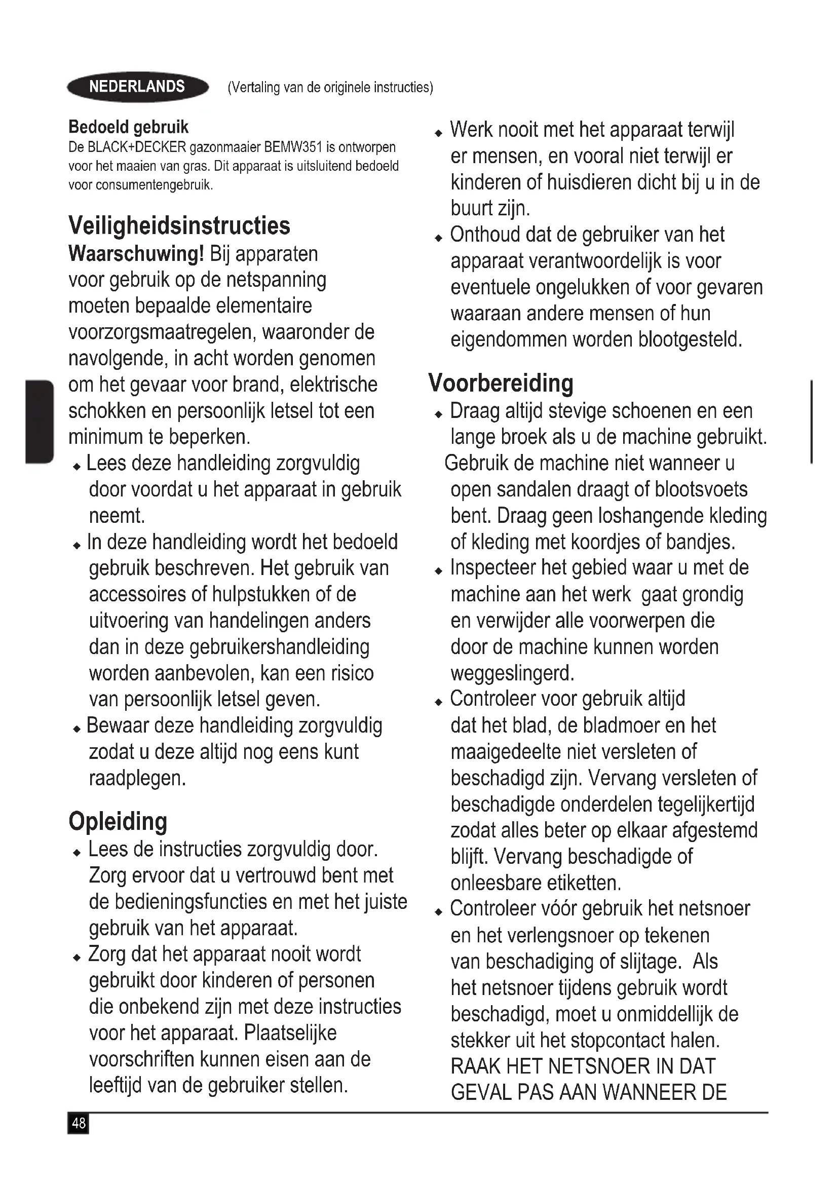 : 93 dB(A). Questi prodotti sono inoltre conformi alle direttive 2006/42/CE, 2014/30/UE e 2011/65/UE. Per maggiori informazioni contattare Black&Decker al seguente indirizzo oppure consultare l’ultima di copertina del manuale. Il sottoscritto è responsabile della redazione di questo documento tecnico e rilascia questa dichiarazione per conto di Black & Decker. R. Laverick Direttore tecnico Black & Decker Europe, 210 Bath Road, Slough, Berkshire, SL1 3YD Regno Unito 11/09/2018 Garanzia Black&Decker è certa della qualità dei propri prodotti e offre ai consumatori una garanzia di 24 mesi dalla data di acquisto. Il presente certicato di garanzia è complementare ai diritti legali e non li pregiudica in alcun modo. La garanzia è valida sui territori degli Stati membri dell’Unione Europea o dell’EFTA (Associazione europea di libero scambio). Per attivare la garanzia, la richiesta di intervento e riparazione in garanzia deve essere effettuata in accordo con i Termini e condizioni Black&Decker e sarà necessario presentare la prova di acquisto al venditore o all’agente di riparazione autorizzato. I Termini e condizioni della garanzia Black & Decker di 2 anni e la sede dell’agente di riparazione autorizzato più vicino sono consultabili su Internet all’indirizzo www.2helpU.com oppure è possibile contattare l’ufcio Black & Decker di zona all’indirizzo indicato in questo manuale. Visitare il nostro sito www.blackanddecker.it per registrare il prodotto Black & Decker appena acquistato e ricevere gli aggiornamenti su nuovi prodotti e offerte speciali.48 (Vertaling van de originele instructies) NEDERLANDS Bedoeld gebruik De BLACK+DECKER gazonmaaier BEMW351 is ontworpen voor het maaien van gras. Dit apparaat is uitsluitend bedoeld voor consumentengebruik. Veiligheidsinstructies Waarschuwing! Bij apparaten voor gebruik op de netspanning moeten bepaalde elementaire voorzorgsmaatregelen, waaronder de navolgende, in acht worden genomen om het gevaar voor brand, elektrische schokken en persoonlijk letsel tot een minimum te beperken. u Lees deze handleiding zorgvuldig door voordat u het apparaat in gebruik neemt. u In deze handleiding wordt het bedoeld gebruik beschreven. Het gebruik van accessoires of hulpstukken of de uitvoering van handelingen anders dan in deze gebruikershandleiding worden aanbevolen, kan een risico van persoonlijk letsel geven. u Bewaar deze handleiding zorgvuldig zodat u deze altijd nog eens kunt raadplegen. Opleiding u Lees de instructies zorgvuldig door. Zorg ervoor dat u vertrouwd bent met de bedieningsfuncties en met het juiste gebruik van het apparaat. u Zorg dat het apparaat nooit wordt gebruikt door kinderen of personen die onbekend zijn met deze instructies voor het apparaat. Plaatselijke voorschriften kunnen eisen aan de leeftijd van de gebruiker stellen. u Werk nooit met het apparaat terwijl er mensen, en vooral niet terwijl er kinderen of huisdieren dicht bij u in de buurt zijn. u Onthoud dat de gebruiker van het apparaat verantwoordelijk is voor eventuele ongelukken of voor gevaren waaraan andere mensen of hun eigendommen worden blootgesteld. Voorbereiding u Draag altijd stevige schoenen en een lange broek als u de machine gebruikt. Gebruik de machine niet wanneer u open sandalen draagt of blootsvoets bent. Draag geen loshangende kleding of kleding met koordjes of bandjes. u Inspecteer het gebied waar u met de machine aan het werk gaat grondig en verwijder alle voorwerpen die door de machine kunnen worden weggeslingerd. u Controleer voor gebruik altijd dat het blad, de bladmoer en het maaigedeelte niet versleten of beschadigd zijn. Vervang versleten of beschadigde onderdelen tegelijkertijd zodat alles beter op elkaar afgestemd blijft. Vervang beschadigde of onleesbare etiketten. u Controleer vóór gebruik het netsnoer en het verlengsnoer op tekenen van beschadiging of slijtage. Als het netsnoer tijdens gebruik wordt beschadigd, moet u onmiddellijk de stekker uit het stopcontact halen.