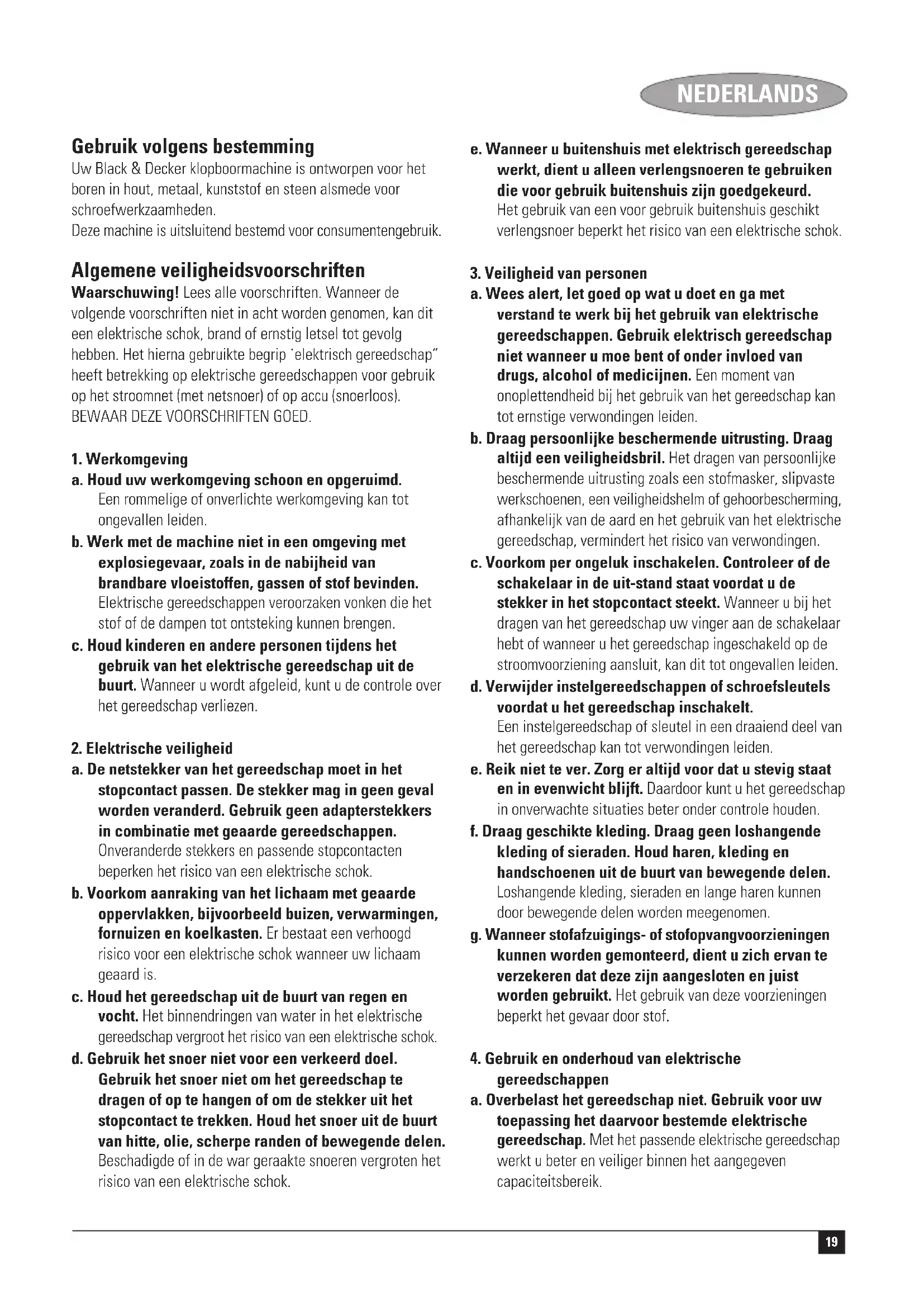 (meetonzekerheid geluidsvermogen) 3 dB(A) Kevin Hewitt Director of Consumer Engineering Spennymoor, County Durham DL16 6JG, Verenigd Koninkrijk 1-9-2005 Garantie Black & Decker heeft vertrouwen in zijn producten en biedt een uitstekende garantie. Deze garantiebepalingen vormen een aanvulling op uw wettelijke rechten en beperken deze niet. De garantie geldt in de lidstaten van de Europese Unie en de Europese Vrijhandelsassociatie. Mocht uw Black & Decker product binnen 24 maanden na datum van aankoop defect raken tengevolge van materiaal- of constructiefouten, dan garanderen wij de kosteloze vervanging van defecte onderdelen, de reparatie van het product of de vervanging van het product, tenzij: ◆ Het product is gebruikt voor handelsdoeleinden, professionele toepassingen of verhuurdoeleinden; ◆ Het product onoordeelkundig is gebruikt; ◆ Het product is beschadigd door invloeden van buitenaf of door een ongeval; ◆ Reparaties zijn uitgevoerd door anderen dan onze servicecentra of Black & Decker personeel. Om een beroep op de garantie te doen, dient u een aankoopbewijs te overhandigen aan de verkoper of een van onze servicecentra. U kunt het adres van het dichtstbijzijnde servicecentrum opvragen via de adressen op de achterzijde van deze handleiding. U kunt ook een lijst van onze servicecentra en meer informatie m.b.t. onze klantenservice vinden op het volgende Internet-adres: www.2helpU.com. Meld u aan op onze website www.blackanddecker.com om te worden geïnformeerd over nieuwe producten en speciale aanbiedingen. Verdere informatie over het merk Black & Decker en onze producten vindt u op www.blackanddecker.com. NEDERLANDS23 ESPAÑOL Uso previsto La taladradora de martillo Black & Decker está diseñada para taladrar madera, metales, plásticos y mampostería, así como para tareas de atornillado. Esta herramienta está pensada únicamente para uso doméstico. Normas de seguridad generales ¡Atención! Lea íntegramente estas instrucciones. En caso de no atenerse a las instrucciones de seguridad siguientes, ello puede dar lugar a una descarga eléctrica, incendio o lesión grave. El término “herramienta eléctrica” empleado en las advertencias indicadas a continuación se refiere a la herramienta eléctrica con alimentación de red (con cable) o alimentada por batería (sin cable). GUARDE ESTAS INSTRUCCIONES EN UN LUGAR SEGURO.