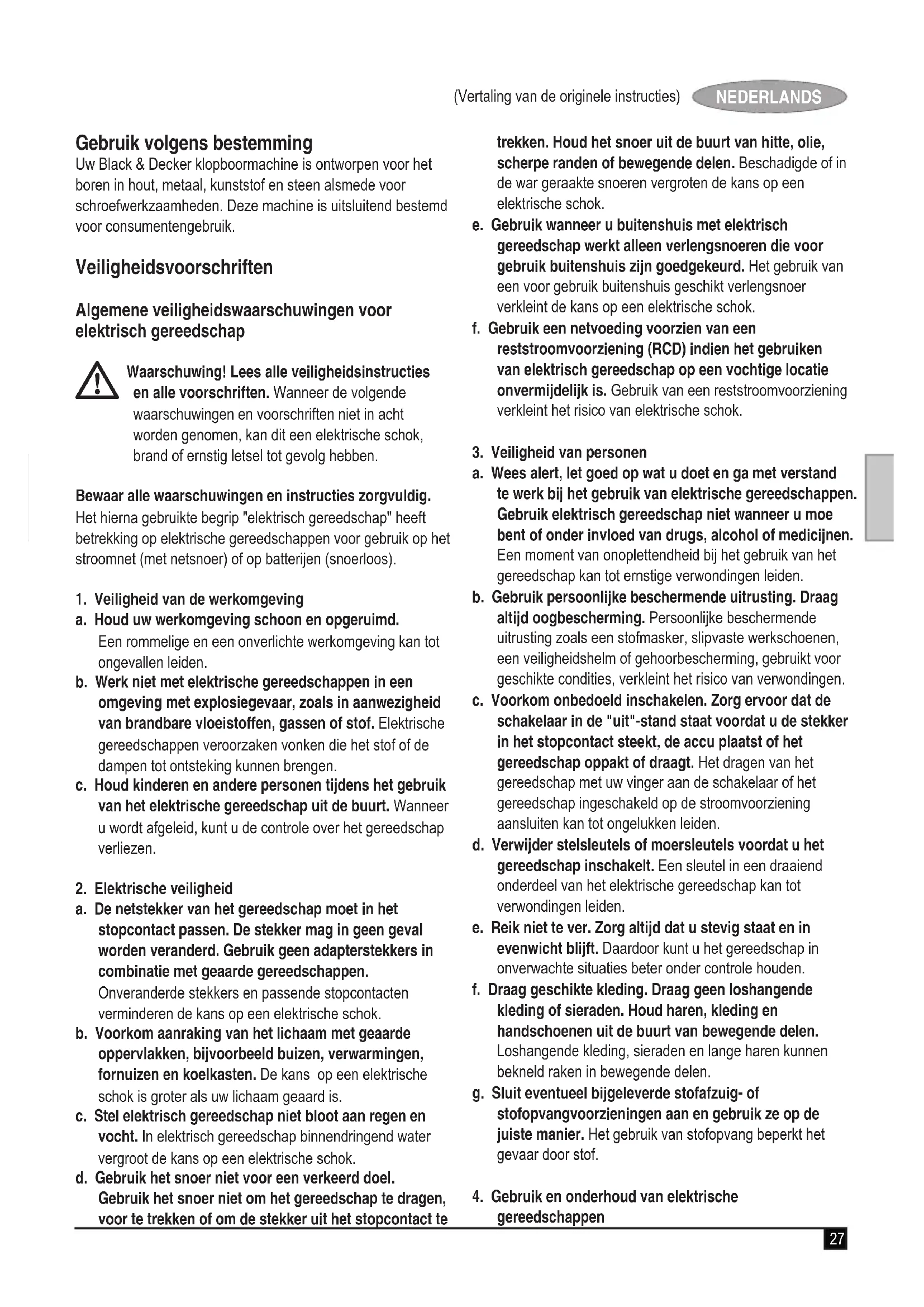 //2011KR910/KR910B/KR8532/KR8532B32 (Vertaling van de originele instructies) NEDERLANDS Garantie Black & Decker heeft vertrouwen in zijn producten en biedt een uitstekende garantie. Deze garantiebepalingen vormen een aanvulling op uw wettelijke rechten en beperken deze niet. De garantie geldt in de lidstaten van de Europese Unie en de Europese Vrijhandelsassociatie. Mocht uw Black & Decker product binnen 24 maanden na datum van aankoop defect raken tengevolge van materiaal- of constructiefouten, dan garanderen wij de kosteloze vervanging van defecte onderdelen, de reparatie van het product of de vervanging van het product, tenzij: u Het product is gebruikt voor handelsdoeleinden, professionele toepassingen of verhuurdoeleinden; u Het product onoordeelkundig is gebruikt; u Het product is beschadigd door invloeden van buitenaf of door een ongeval; u Reparaties zijn uitgevoerd door anderen dan onze servicecentra of Black & Decker personeel. Om een beroep op de garantie te doen, dient u een aankoopbewijs te overhandigen aan de verkoper of een van onze servicecentra. U kunt het adres van het dichtstbijzijnde servicecentrum opvragen via de adressen op de achterzijde van deze handleiding. U kunt ook een lijst van onze servicecentra en meer informatie m.b.t. onze klantenservice vinden op het volgende Internet-adres: www.2helpU.com Meld u aan op onze website www.blackanddecker.nl om te worden geïnformeerd over nieuwe producten en speciale aanbiedingen. Verdere informatie over het merk Black & Decker en onze producten vindt u op www.blackanddecker.nl33 (Traducción de las instrucciones originales) ESPAÑOL Finalidad El taladro percutor Black & Decker se ha diseñado para taladrar madera, metal, plástico y mampostería, así como para tareas de atornillado. Esta herramienta está pensada únicamente para uso doméstico. Instrucciones de seguridad Advertencias de seguridad generales para herramientas eléctricas
