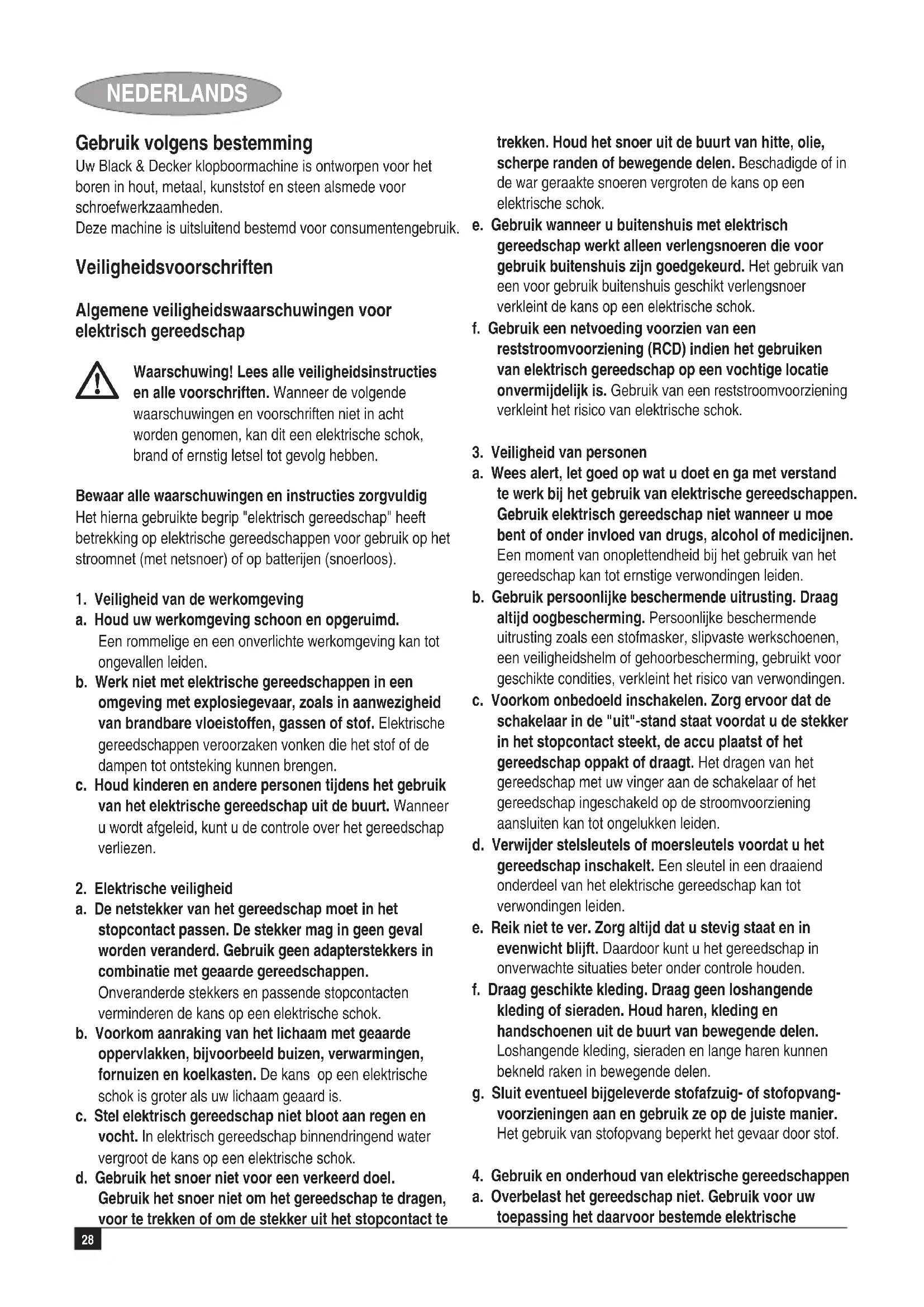 EG-conformiteitsverklaring MACHINERICHTLIJN XTD91 / XTD91B / XTD91DBlack & Decker verklaart dat deze producten, zoals onder "technische gegevens" beschreven, overeenkomstig zijn met:2006/42/EG, EN 60745-1, EN 60745-2-1Neem voor meer informatie contact op met Black & Decker via het volgende adres of zie de achterzijde van de handleiding.De ondergetekende is verantwoordelijk voor de samenstelling van de technische gegevens en geeft deze verklaring namens Black & Decker. Kevin HewittVice-President Global EngineeringBlack & Decker Europe, 210 Bath Road, Slough,Berkshire, SL1 3YDVerenigd Koninkrijk30/03/201033 NEDERLANDS Garantie Black & Decker heeft vertrouwen in zijn producten en biedt een uitstekende garantie. Deze garantiebepalingen vormen een aanvulling op uw wettelijke rechten en beperken deze niet. De garantie geldt in de lidstaten van de Europese Unie en de Europese Vrijhandelsassociatie. Mocht uw Black & Decker product binnen 24 maanden na datum van aankoop defect raken tengevolge van materiaal- of constructiefouten, dan garanderen wij de kosteloze vervanging van defecte onderdelen, de reparatie van het product of de vervanging van het product, tenzij: u Het product is gebruikt voor handelsdoeleinden, professionele toepassingen of verhuurdoeleinden; u Het product onoordeelkundig is gebruikt; u Het product is beschadigd door invloeden van buitenaf of door een ongeval; u Reparaties zijn uitgevoerd door anderen dan onze servicecentra of Black & Decker personeel. Om een beroep op de garantie te doen, dient u een aankoopbewijs te overhandigen aan de verkoper of een van onze servicecentra. U kunt het adres van het dichtstbijzijnde servicecentrum opvragen via de adressen op de achterzijde van deze handleiding. U kunt ook een lijst van onze servicecentra en meer informatie m.b.t. onze klantenservice vinden op het volgende Internet-adres: www.2helpU.com Meld u aan op onze website www.blackanddecker.nl om te worden geïnformeerd over nieuwe producten en speciale aanbiedingen. Verdere informatie over het merk Black & Decker en onze producten vindt u op www.blackanddecker.nl34 ESPAÑOL Finalidad El taladro percutor Black & Decker se ha diseñado para taladrar madera, metal, plástico y mampostería, así como para tareas de atornillado. Esta herramienta está pensada únicamente para uso doméstico. Instrucciones de seguridad Advertencias de seguridad generales para herramientas eléctricas