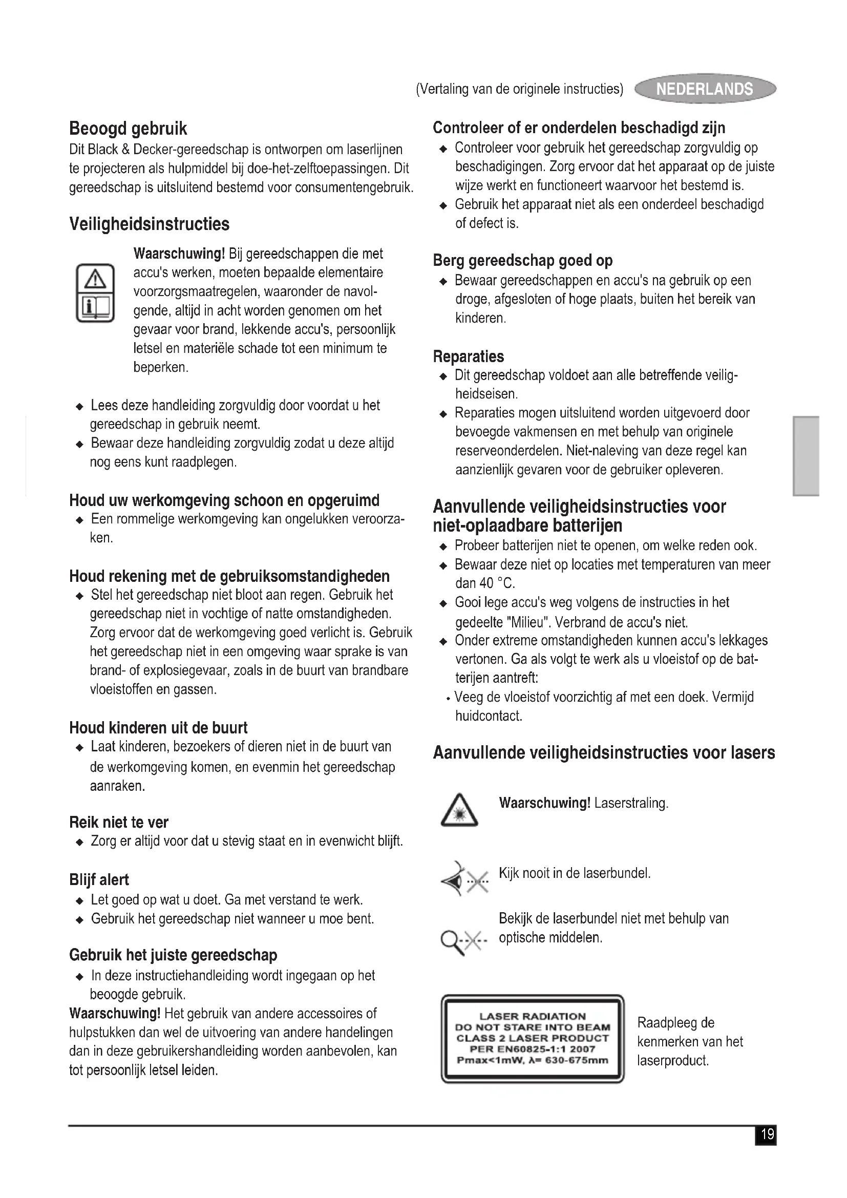 0-40 Peso kg 1,518 (Traduzione del testo originale) ITALIANO Garanzia Certa della qualità dei suoi prodotti, Black & Decker offre una garanzia eccezionale. Il presente certicato di garanzia è complementare ai diritti legali e non li pregiudica in alcun modo. La garanzia è valida entro il territorio degli Stati membri dell'Unione Europea e dell'EFTA (European Free Trade Area). Se un prodotto Black & Decker risulta difettoso per qualità del materiale, della costruzione o per mancata conformità entro 24 mesi dalla data di acquisto, Black & Decker garantisce la sostituzione delle parti difettose, provvede alla riparazione dei prodotti se ragionevolmente usurati oppure alla loro sostituzione, in modo da ridurre al minimo il disagio del cliente a meno che: u il prodotto non sia stato destinato a usi commerciali, professionali o al noleggio; u il prodotto non sia stato usato in modo improprio o scor- retto; u il prodotto non abbia subito danni causati da oggetti o sostanze estranee oppure incidenti; u il prodotto non abbia subito tentativi di riparazione non effettuati da tecnici autorizzati né dall’assistenza Black & Decker. Per attivare la garanzia è necessario esibire la prova di acquisto al venditore o al tecnico autorizzato. Per individuare il tecnico autorizzato più vicino, rivolgersi alla sede Black & Decker locale, presso il recapito indicato nel presente manuale. Altrimenti, un elenco completo di tutti i tecnici autorizzati Black & Decker e i dettagli completi sui contatti e i servizi post-vendita sono disponibili su Internet all’indirizzo: www.2helpU.com I clienti che desiderano registrare il nuovo prodotto Black & Decker e ricevere gli aggiornamenti sui nuovi prodotti e le offerte speciali, sono invitati a visitare il sito Web (www.black- anddecker.it). Ulteriori informazioni sul marchio e la gamma di prodotti Black & Decker sono disponibili all’indirizzo www. blackanddecker.it.19 (Vertaling van de originele instructies) NEDERLANDS Beoogd gebruik Dit Black & Decker-gereedschap is ontworpen om laserlijnen te projecteren als hulpmiddel bij doe-het-zelftoepassingen. Dit gereedschap is uitsluitend bestemd voor consumentengebruik. Veiligheidsinstructies Waarschuwing! Bij gereedschappen die met accu's werken, moeten bepaalde elementaire voorzorgsmaatregelen, waaronder de navol- gende, altijd in acht worden genomen om het gevaar voor brand, lekkende accu's, persoonlijk letsel en materiële schade tot een minimum te beperken. u Lees deze handleiding zorgvuldig door voordat u het gereedschap in gebruik neemt. u Bewaar deze handleiding zorgvuldig zodat u deze altijd nog eens kunt raadplegen. Houd uw werkomgeving schoon en opgeruimd u Een rommelige werkomgeving kan ongelukken veroorza- ken. Houd rekening met de gebruiksomstandigheden u Stel het gereedschap niet bloot aan regen. Gebruik het gereedschap niet in vochtige of natte omstandigheden. Zorg ervoor dat de werkomgeving goed verlicht is. Gebruik het gereedschap niet in een omgeving waar sprake is van brand- of explosiegevaar, zoals in de buurt van brandbare vloeistoffen en gassen. Houd kinderen uit de buurt u Laat kinderen, bezoekers of dieren niet in de buurt van de werkomgeving komen, en evenmin het gereedschap aanraken. Reik niet te ver u Zorg er altijd voor dat u stevig staat en in evenwicht blijft. Blijf alert u Let goed op wat u doet. Ga met verstand te werk. u Gebruik het gereedschap niet wanneer u moe bent. Gebruik het juiste gereedschap u In deze instructiehandleiding wordt ingegaan op het beoogde gebruik. Waarschuwing! Het gebruik van andere accessoires of hulpstukken dan wel de uitvoering van andere handelingen dan in deze gebruikershandleiding worden aanbevolen, kan tot persoonlijk letsel leiden. Controleer of er onderdelen beschadigd zijn u Controleer voor gebruik het gereedschap zorgvuldig op beschadigingen. Zorg ervoor dat het apparaat op de juiste wijze werkt en functioneert waarvoor het bestemd is. u Gebruik het apparaat niet als een onderdeel beschadigd of defect is. Berg gereedschap goed op u Bewaar gereedschappen en accu's na gebruik op een droge, afgesloten of hoge plaats, buiten het bereik van kinderen. Reparaties u Dit gereedschap voldoet aan alle betreffende veilig- heidseisen. u Reparaties mogen uitsluitend worden uitgevoerd door bevoegde vakmensen en met behulp van originele reserveonderdelen. Niet-naleving van deze regel kan aanzienlijk gevaren voor de gebruiker opleveren. Aanvullende veiligheidsinstructies voor niet-oplaadbare batterijen u Probeer batterijen niet te openen, om welke reden ook. u Bewaar deze niet op locaties met temperaturen van meer dan 40 °C. u Gooi lege accu's weg volgens de instructies in het gedeelte "Milieu". Verbrand de accu's niet. u Onder extreme omstandigheden kunnen accu's lekkages vertonen. Ga als volgt te werk als u vloeistof op de bat- terijen aantreft: w Veeg de vloeistof voorzichtig af met een doek. Vermijd huidcontact. Aanvullende veiligheidsinstructies voor lasers Waarschuwing! Laserstraling. Kijk nooit in de laserbundel. Bekijk de laserbundel niet met behulp van optische middelen. Raadpleeg de kenmerken van het laserproduct.20 (Vertaling van de originele instructies) NEDERLANDS Dit product mag niet worden gebruikt door kinderen onder de 16. u Deze laser voldoet aan klasse 2 van norm EN 60825-1 Vervang de laserdiode niet door een ander type. Laat een beschadigde laser altijd repareren door een van onze servicecentra. u Gebruik de laser niet voor andere doeleinden dan het projecteren van laserlijnen. u Bij een laser van klasse 2 mag het oog maar 0,25 sec- onde aan de laserbundel worden blootgesteld om geen letsel op te lopen. Doorgaans bieden de ooglidreexen echter een adequate bescherming. Bij afstanden van meer dan 1 m valt de laser onder klasse 1 en daarom wordt deze volkomen veilig geacht. u Kijk nooit rechtstreeks in de laserbundel. u Bekijk de laserbundel evenmin met behulp van optische middelen. u Plaats het gereedschap niet op hoofdhoogte van perso- nen die 