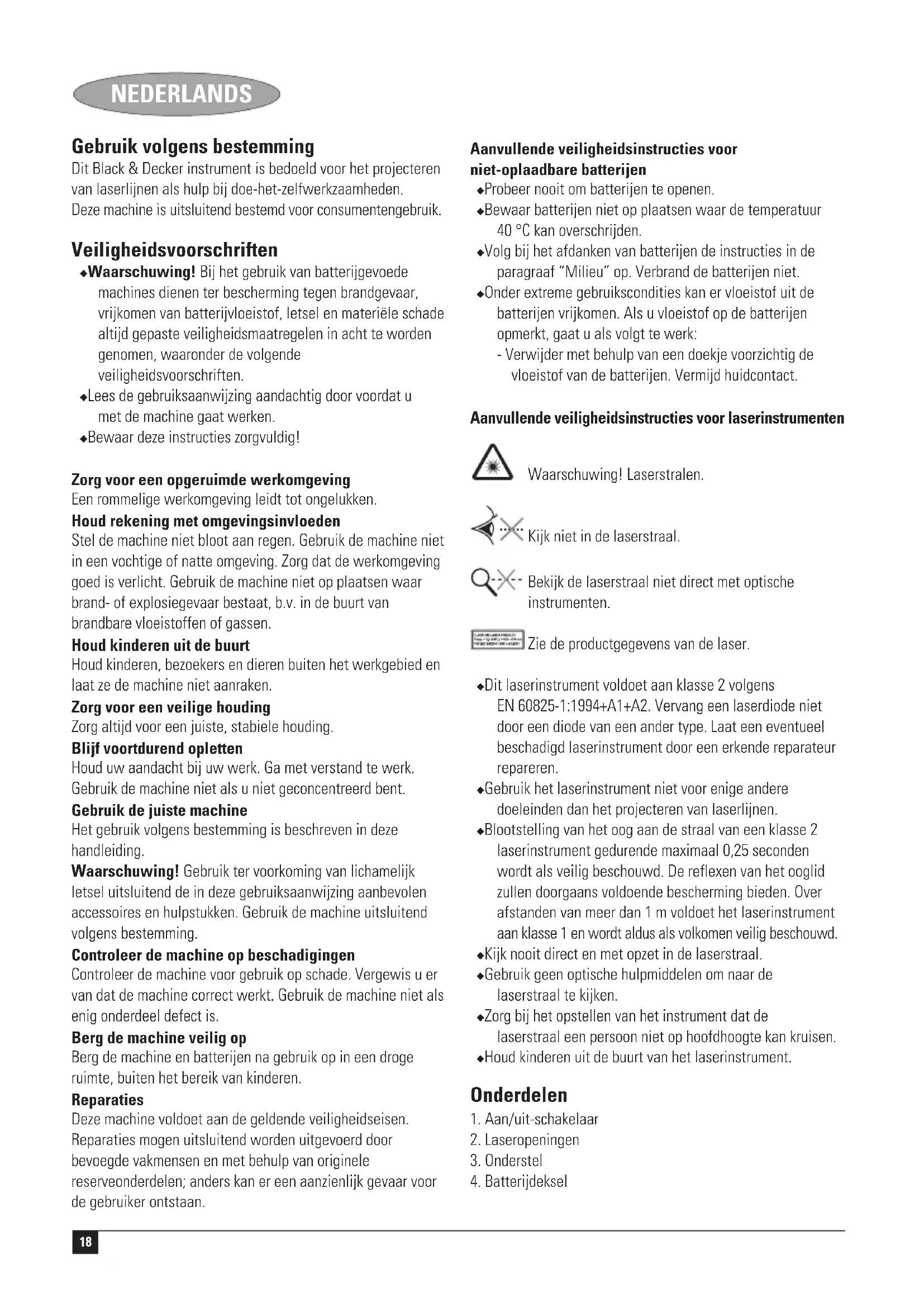 Kevin Hewitt Direttore di Ricerca e Sviluppo Spennymoor, County Durham DL16 6JG, United Kingdom 1-12-2004 Garanzia Certa della qualità dei suoi prodotti, Black & Decker offre una garanzia eccezionale. Il presente certificato di garanzia è complementare ai diritti statutari e non li pregiudica in alcun modo. La garanzia è valida entro il territorio degli Stati membri dell’Unione Europea e dell’EFTA (European Free Trade Area). Se un prodotto Black & Decker risulta difettoso per qualità del materiale, della costruzione o per mancata conformità entro 24 mesi dalla data di acquisto, Black & Decker garantisce la sostituzione delle parti difettose, provvede alla riparazione dei prodotti se ragionevolmente usurati oppure alla loro sostituzione, in modo da ridurre al minimo il disagio del cliente a meno che: ◆ Il prodotto non sia stato destinato ad usi commerciali, professionali o al noleggio; ◆ Il prodotto non sia stato usato in modo improprio o scorretto; ◆ Il prodotto non abbia subito danni causati da oggetti o sostanze estranee oppure incidenti; ◆ Il prodotto non abbia subito tentativi di riparazione non effettuati da tecnici autorizzati né dall’assistenza Black & Decker. Per attivare la garanzia è necessario esibire la prova comprovante l’acquisto al venditore o al tecnico autorizzato. Per individuare il tecnico autorizzato più vicino, rivolgersi alla sede Black & Decker locale, presso il recapito indicato nel presente manuale.17 ITALIANO Altrimenti un elenco completo di tutti i tecnici autorizzati Black & Decker e i dettagli completi sui contatti e i servizi post-vendita sono disponibili su Internet presso: www.2helpU.com I clienti che desiderano registrare il nuovo prodotto Black & Decker e ricevere gli aggiornamenti sui nuovi prodotti e le offerte speciali, sono invitati a visitare il sito Web (www.blackanddecker.it). Ulteriori informazioni sul marchio e la gamma di prodotti Black & Decker sono disponibili all’indirizzo www.blackanddecker.it18 NEDERLANDS Gebruik volgens bestemming Dit Black & Decker instrument is bedoeld voor het projecteren van laserlijnen als hulp bij doe-het-zelfwerkzaamheden. Deze machine is uitsluitend bestemd voor consumentengebruik. Veiligheidsvoorschriften ◆ Waarschuwing! Bij het gebruik van batterijgevoede machines dienen ter bescherming tegen brandgevaar, vrijkomen van batterijvloeistof, letsel en materiële schade altijd gepaste veiligheidsmaatregelen in acht te worden genomen, waaronder de volgende veiligheidsvoorschriften. ◆ Lees de gebruiksaanwijzing aandachtig door voordat u met de machine gaat werken. ◆ Bewaar deze instructies zorgvuldig! Zorg voor een opgeruimde werkomgeving Een rommelige werkomgeving leidt tot ongelukken. Houd rekening met omgevingsinvloeden Stel de machine niet bloot aan regen. Gebruik de machine niet in een vochtige of natte omgeving. Zorg dat de werkomgeving goed is verlicht. Gebruik de machine niet op plaatsen waar brand- of explosiegevaar bestaat, b.v. in de buurt van brandbare vloeistoffen of gassen. Houd kinderen uit de buurt Houd kinderen, bezoekers en dieren buiten het werkgebied en laat ze de machine niet aanraken. Zorg voor een veilige houding Zorg altijd voor een juiste, stabiele houding. Blijf voortdurend opletten Houd uw aandacht bij uw werk. Ga met verstand te werk. Gebruik de machine niet als u niet geconcentreerd bent. Gebruik de juiste machine Het gebruik volgens bestemming is beschreven in deze handleiding. Waarschuwing! Gebruik ter voorkoming van lichamelijk letsel uitsluitend de in deze gebruiksaanwijzing aanbevolen accessoires en hulpstukken. Gebruik de machine uitsluitend volgens bestemming. Controleer de machine op beschadigingen Controleer de machine voor gebruik op schade. Vergewis u er van dat de machine correct werkt. Gebruik de machine niet als enig onderdeel defect is. Berg de machine veilig op Berg de machine en batterijen na gebruik op in een droge ruimte, buiten het bereik van kinderen. Reparaties Deze machine voldoet aan de geldende veiligheidseisen. Reparaties mogen uitsluitend worden uitgevoerd door bevoegde vakmensen en met behulp van originele reserveonderdelen; anders kan er een aanzienlijk gevaar voor de gebruiker ontstaan. Aanvullende veiligheidsinstructies voor niet-oplaadbare batterijen ◆ Probeer nooit om batterijen te openen. ◆ Bewaar batterijen niet op plaatsen waar de temperatuur 40 °C kan overschrijden. ◆ Volg bij het afdanken van batterijen de instructies in de paragraaf “Milieu” op. Verbrand de batterijen niet. ◆ Onder extreme gebruikscondities kan er vloeistof uit de batterijen vrijkomen. Als u vloeistof op de batterijen opmerkt, gaat u als volgt te werk: - Verwijder met behulp van een doekje voorzichtig de vloeistof van de batterijen. Vermijd huidcontact. Aanvullende veiligheidsinstructies voor laserinstrumenten Waarschuwing! Laserstralen. Kijk niet in de laserstraal. Bekijk de laserstraal niet direct met optische instrumenten. Zie de productgegevens van de laser. ◆ Dit laserinstrument voldoet aan klasse 2 volgens EN 60825-1:1994+A1+A2. Vervang een laserdiode niet door een diode van een ander type. Laat een eventueel beschadigd laserinstrument door een erkende reparateur repareren. ◆ Gebruik het laserinstrument niet voor enige andere doeleinden dan het projecteren van laserlijnen. ◆ Blootstelling van het oog aan de straal van een klasse 2 laserinstrument gedurende maximaal 0,25 seconden wordt als veilig beschouwd. De reflexen van het ooglid zullen doorgaans voldoende bescherming bieden. Over afstanden van meer dan 1 m voldoet het laserinstrument aan klasse 1 en wordt aldus als volkomen veilig beschouwd. ◆ Kijk nooit direct en met opzet in de laserstraal. ◆ Gebruik geen optische hulpmiddelen om naar de laserstraal te kijken. ◆ Zorg bij het opstellen van het instrument dat de laserstraal een persoon niet op hoofdhoogte kan kruisen. ◆ Houd kinderen uit de buurt van het laserinstrument. Onderdelen