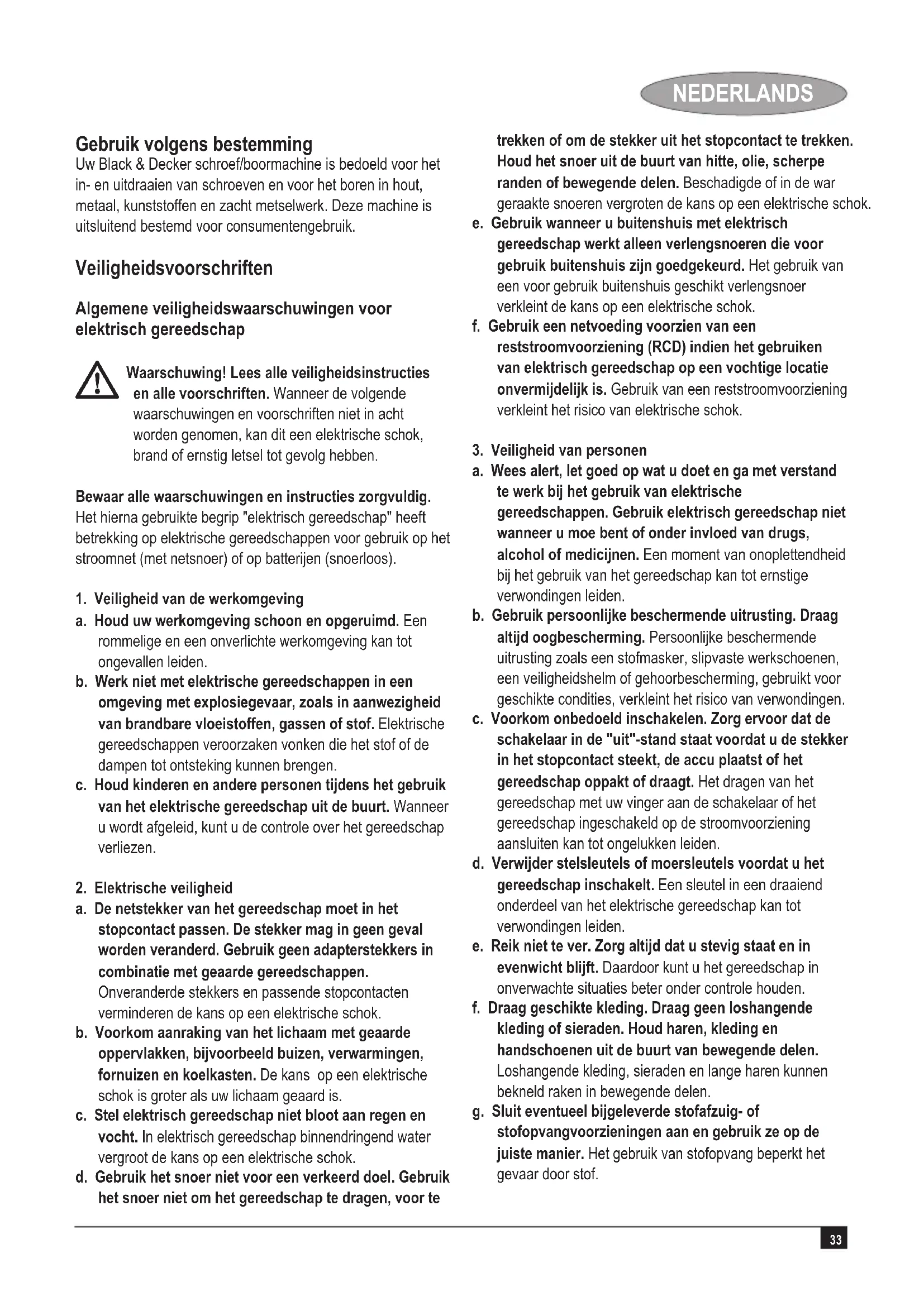 Kevin Hewitt Vice-President Global Engineering Black & Decker Europe, 210 Bath Road, Slough, Berkshire, SL1 3YD Verenigd Koninkrijk 09/02/2010 Garantie Black & Decker heeft vertrouwen in zijn producten en biedt een uitstekende garantie. Deze garantiebepalingen vormen een aanvulling op uw wettelijke rechten en beperken deze niet. De garantie geldt in de lidstaten van de Europese Unie en de Europese Vrijhandelsassociatie. Mocht uw Black & Decker product binnen 24 maanden na datum van aankoop defect raken tengevolge van materiaal- of constructiefouten, dan garanderen wij de kosteloze vervanging van defecte onderdelen, de reparatie van het product of de vervanging van het product, tenzij: u Het product is gebruikt voor handelsdoeleinden, professionele toepassingen of verhuurdoeleinden; u Het product onoordeelkundig is gebruikt;u Het product is beschadigd door invloeden van buitenaf of door een ongeval; u Reparaties zijn uitgevoerd door anderen dan onze servicecentra of Black & Decker personeel. Om een beroep op de garantie te doen, dient u een aankoopbewijs te overhandigen aan de verkoper of een van onze servicecentra. U kunt het adres van het dichtstbijzijnde servicecentrum opvragen via de adressen op de achterzijde van deze handleiding. U kunt ook een lijst van onze servicecentra en meer informatie m.b.t. onze klantenservice vinden op het volgende Internet-adres: www.2helpU.com Meld u aan op onze website www.blackanddecker.nl om te worden geïnformeerd over nieuwe producten en speciale aanbiedingen. Verdere informatie over het merk Black & Decker en onze producten vindt u op www.blackanddecker.nl40 ESPAÑOL Finalidad El taladro/atornillador Black & Decker ha sido diseñado para atornillar y desatornillar así como para taladrar madera, metal, plástico y mampostería blanda. Esta herramienta está pensada únicamente para uso doméstico. Instrucciones de seguridad Advertencias de seguridad generales para herramientas eléctricas