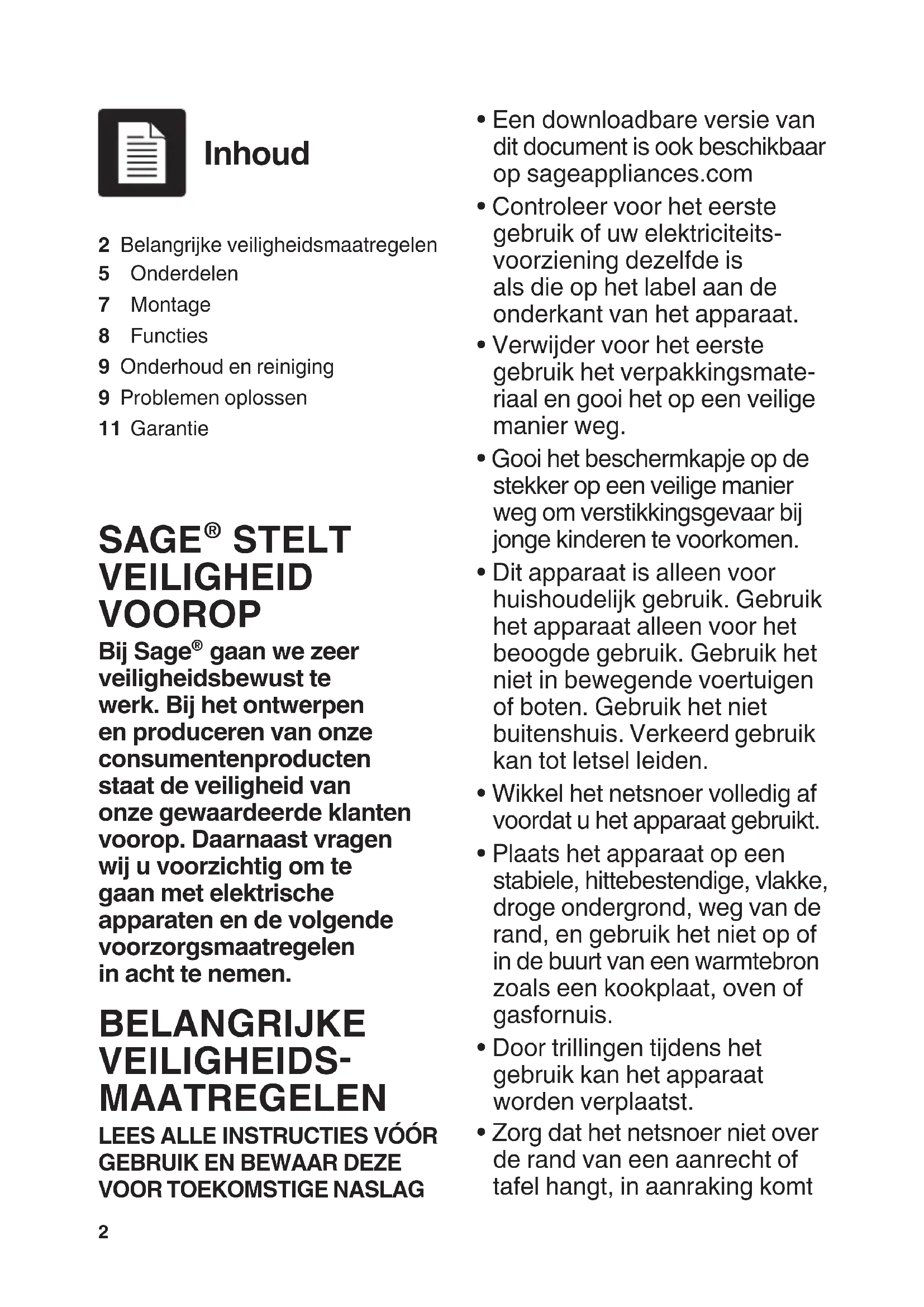 - Een downloadbare versie van dit document is ook beschikbaar op sageappliances.com