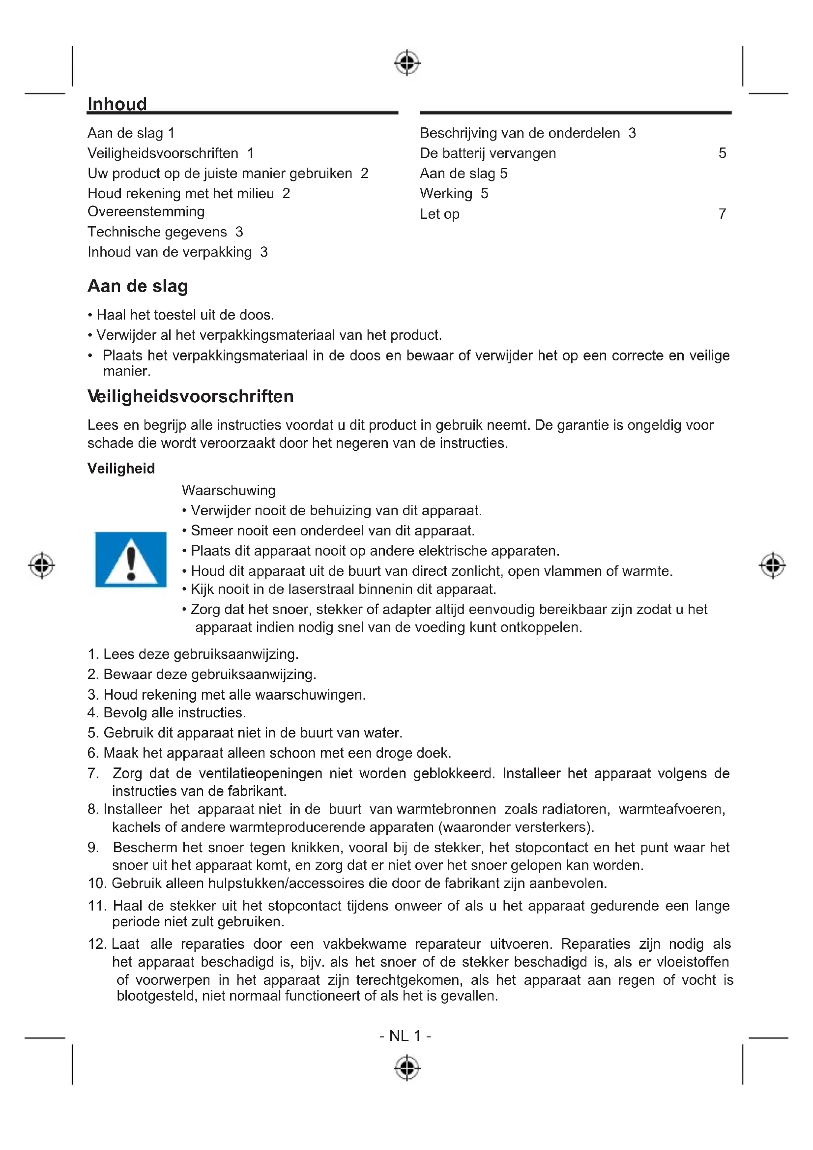 eiligheidsvoorschriften 1 Uw product op de juiste manier gebruiken 2 Houd rekening met het milieu 2 Overeenstemming Technische gegevens 3 Inhoud van de verpakking 3 Beschrijving van de onderdelen 3 De batterij vervangen Aan de slag 5 Werking 5 Let op Aan de slag