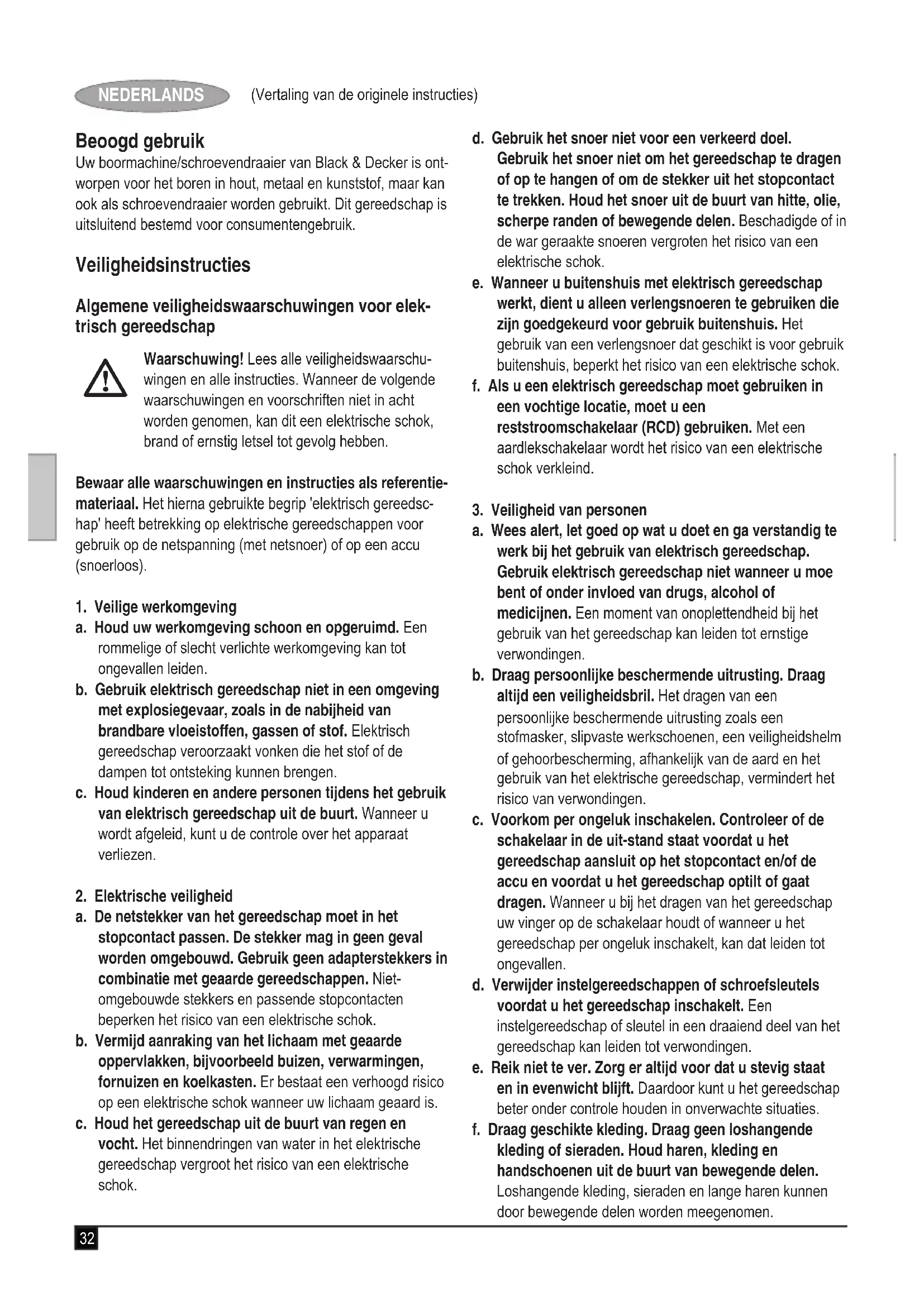 Kevin Hewitt Vice-President Global Engineering Black & Decker Europe, 210 Bath Road, Slough, Berkshire, SL1 3YD Verenigd Koninkrijk 16/11/2010 Garantie Black & Decker heeft vertrouwen in haar producten en biedt een uitstekende garantie. Deze garantiebepalingen vormen een aanvulling op uw wettelijke rechten en beperken deze niet. De garantie geldt in de lidstaten van de Europese Unie en de Europese Vrijhandelsassociatie. Mocht uw Black & Decker product binnen 24 maanden na de datum van aankoop defect raken ten gevolge van materi- aal- of constructiefouten, dan garanderen wij de kosteloze vervanging van defecte onderdelen, de reparatie van het product of de vervanging van het product, tenzij: u Het product is gebruikt voor handelsdoeleinden, profes- sionele toepassingen of verhuurdoeleinden. u Het product onoordeelkundig is gebruikt.u Het product is beschadigd door invloeden van buitenaf of door een ongeval. u Reparaties zijn uitgevoerd door anderen dan onze serv- icecentra of Black & Decker-personeel. Om een beroep te doen op de garantie, dient u een aank- oopbewijs te overhandigen aan de verkoper of een van onze servicecentra. U kunt het adres van het dichtstbijzijnde Black & Decker-servicecentrum opvragen via de adressen op de achterzijde van deze handleiding. U kunt ook een lijst van Black & Decker-servicecentra en meer informatie m.b.t. onze klantenservice vinden op internet op: www.2helpU.com Meld u aan op onze website www.blackanddecker.nl om te worden geïnformeerd over nieuwe producten en speciale aan- biedingen. Verdere informatie over het merk Black & Decker en onze producten vindt u op www.blackanddecker.nl.39 (Traducción de las instrucciones originales) ESPAÑOL Uso previsto El taladro/destornillador Black & Decker se ha diseñado para atornillar y para taladrar madera, metal y plásticos. Esta her- ramienta está pensada únicamente para uso doméstico. Instrucciones de seguridad Advertencias de seguridad generales para herrami- entas eléctricas