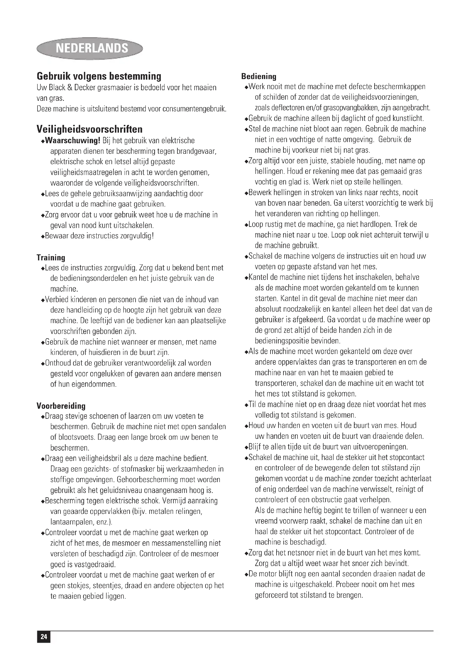 ITALIANO Kevin Hewitt Direttore tecnico prodotti di consumo Spennymoor, County Durham DL16 6JG, Regno Unito 1-8-2004 Garanzia Certa della qualità dei suoi prodotti, Black & Decker offre una garanzia eccezionale. Il presente certificato di garanzia è complementare ai diritti statutari e non li pregiudica in alcun modo. La garanzia è valida entro il territorio degli Stati membri dell’Unione Europea e dell’EFTA (European Free Trade Area). Se un prodotto Black & Decker risulta difettoso per qualità del materiale, della costruzione o per mancata conformità entro 24 mesi dalla data di acquisto, Black & Decker garantisce la sostituzione delle parti difettose, provvede alla riparazione dei prodotti se ragionevolmente usurati oppure alla loro sostituzione, in modo da ridurre al minimo il disagio del cliente a meno che: ◆ Il prodotto non sia stato destinato ad usi commerciali, professionali o al noleggio; ◆ Il prodotto non sia stato usato in modo improprio o scorretto; ◆ Il prodotto non abbia subito danni causati da oggetti o sostanze estranee oppure incidenti; ◆ Il prodotto non abbia subito tentativi di riparazione non effettuati da tecnici autorizzati né dall’assistenza Black & Decker. Per attivare la garanzia è necessario esibire la prova comprovante l’acquisto al venditore o al tecnico autorizzato. Per individuare il tecnico autorizzato più vicino, rivolgersi alla sede Black & Decker locale, presso il recapito indicato nel presente manuale. Altrimenti un elenco completo di tutti i tecnici autorizzati Black & Decker e i dettagli completi sui contatti e i servizi post-vendita sono disponibili su Internet presso: www.2helpU.com I clienti che desiderano registrare il nuovo prodotto Black & Decker e ricevere gli aggiornamenti sui nuovi prodotti e le offerte speciali, sono invitati a visitare il sito Web (www.blackanddecker.it). Ulteriori informazioni sul marchio e la gamma di prodotti Black & Decker sono disponibili all’indirizzo www.blackanddecker.it24 NEDERLANDS Gebruik volgens bestemming Uw Black & Decker grasmaaier is bedoeld voor het maaien van gras. Deze machine is uitsluitend bestemd voor consumentengebruik. Veiligheidsvoorschriften ◆ Waarschuwing! Bij het gebruik van elektrische apparaten dienen ter bescherming tegen brandgevaar, elektrische schok en letsel altijd gepaste veiligheidsmaatregelen in acht te worden genomen, waaronder de volgende veiligheidsvoorschriften. ◆ Lees de gehele gebruiksaanwijzing aandachtig door voordat u de machine gaat gebruiken. ◆ Zorg ervoor dat u voor gebruik weet hoe u de machine in geval van nood kunt uitschakelen. ◆ Bewaar deze instructies zorgvuldig! Training ◆ Lees de instructies zorgvuldig. Zorg dat u bekend bent met de bedieningsonderdelen en het juiste gebruik van de machine. ◆ Verbied kinderen en personen die niet van de inhoud van deze handleiding op de hoogte zijn het gebruik van deze machine. De leeftijd van de bediener kan aan plaatselijke voorschriften gebonden zijn. ◆ Gebruik de machine niet wanneer er mensen, met name kinderen, of huisdieren in de buurt zijn. ◆ Onthoud dat de gebruiker verantwoordelijk zal worden gesteld voor ongelukken of gevaren aan andere mensen of hun eigendommen. Voorbereiding ◆ Draag stevige schoenen of laarzen om uw voeten te beschermen. Gebruik de machine niet met open sandalen of blootsvoets. Draag een lange broek om uw benen te beschermen. ◆ Draag een veiligheidsbril als u deze machine bedient. Draag een gezichts- of stofmasker bij werkzaamheden in stoffige omgevingen. Gehoorbescherming moet worden gebruikt als het geluidsniveau onaangenaam hoog is. ◆ Bescherming tegen elektrische schok. Vermijd aanraking van geaarde oppervlakken (bijv. metalen relingen, lantaarnpalen, enz.). ◆ Controleer voordat u met de machine gaat werken op zicht of het mes, de mesmoer en messamenstelling niet versleten of beschadigd zijn. Controleer of de mesmoer goed is vastgedraaid. ◆ Controleer voordat u met de machine gaat werken of er geen stokjes, steentjes, draad en andere objecten op het te maaien gebied liggen. Bediening ◆ Werk nooit met de machine met defecte beschermkappen of schilden of zonder dat de veiligheidsvoorzieningen, zoals deflectoren en/of grasopvangbakken, zijn aangebracht. ◆ Gebruik de machine alleen bij daglicht of goed kunstlicht. ◆ Stel de machine niet bloot aan regen. Gebruik de machine niet in een vochtige of natte omgeving. Gebruik de machine bij voorkeur niet bij nat gras. ◆ Zorg altijd voor een juiste, stabiele houding, met name op hellingen. Houd er rekening mee dat pas gemaaid gras vochtig en glad is. Werk niet op steile hellingen. ◆ Bewerk hellingen in stroken van links naar rechts, nooit van boven naar beneden. Ga uiterst voorzichtig te werk bij het veranderen van richting op hellingen. ◆ Loop rustig met de machine, ga niet hardlopen. Trek de machine niet naar u toe. Loop ook niet achteruit terwijl u de machine gebruikt. ◆ Schakel de machine volgens de instructies uit en houd uw voeten op gepaste afstand van het mes. ◆ Kantel de machine niet tijdens het inschakelen, behalve als de machine moet worden gekanteld om te kunnen starten. Kantel in dit geval de machine niet meer dan absoluut noodzakelijk en kantel alleen het deel dat van de gebruiker is afgekeerd. Ga voordat u de machine weer op de grond zet altijd of beide handen zich in de bedieningspositie bevinden. ◆ Als de machine moet worden gekanteld om deze over andere oppervlaktes dan gras te transporteren en om de machine naar en van het te maaien gebied te transporteren, schakel dan de machine uit en wacht tot het mes tot stilstand is gekomen. ◆ Til de machine niet op en draag deze niet voordat het mes volledig tot stilstand is gekomen. ◆ Houd uw handen en voeten uit de buurt van mes. Houd uw handen en voeten uit de buurt van draaiende delen. ◆ Blijf te allen tijde uit de buurt van uitvoeropeningen. ◆ Schakel de machine uit, haal de stekker uit het stopcontact en controleer of de be