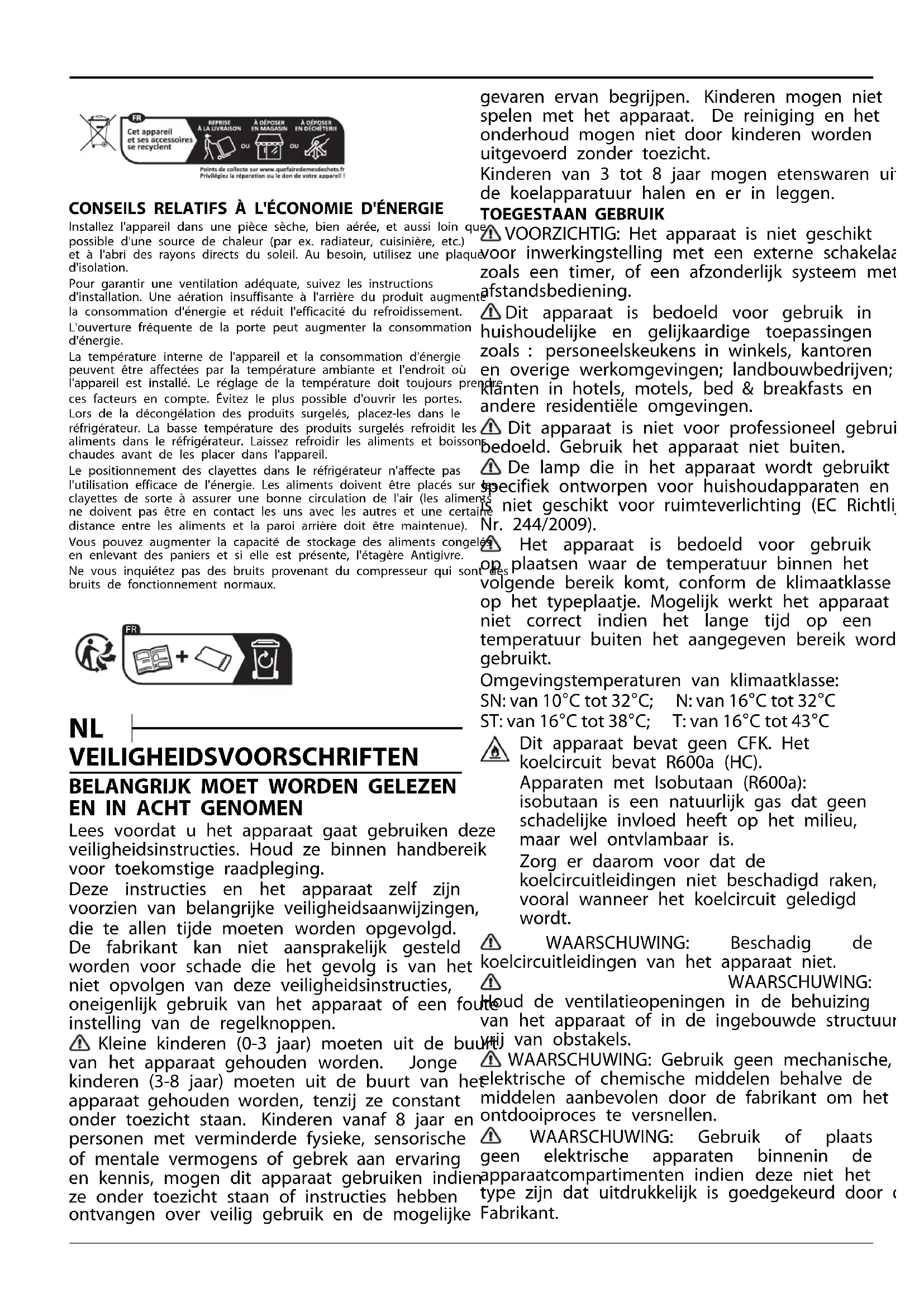 Lees voordat u het apparaat gaat gebruiken deze veiligheidsinstructies. Houd ze binnen handbereik voor toekomstige raadpleging. Deze instructies en het apparaat zelf zijn voorzien van belangrijke veiligheidsaanwijzingen, die te allen tijde moeten worden opgevolgd. De fabrikant kan niet aansprakelijk gesteld worden voor schade die het gevolg is van het niet opvolgen van deze veiligheidsinstructies, oneigenlijk gebruik van het apparaat of een foute instelling van de regelknoppen. Kleine kinderen (0-3 jaar) moeten uit de buurt van het apparaat gehouden worden. Jonge kinderen (3-8 jaar) moeten uit de buurt van het apparaat gehouden worden, tenzij ze constant onder toezicht staan. Kinderen vanaf 8 jaar en personen met verminderde fysieke, sensorische of mentale vermogens of gebrek aan ervaring en kennis, mogen dit apparaat gebruiken indien ze onder toezicht staan of instructies hebben ontvangen over veilig gebruik en de mogelijke gevaren ervan begrijpen. Kinderen mogen niet spelen met het apparaat. De reiniging en het onderhoud mogen niet door kinderen worden uitgevoerd zonder toezicht. Kinderen van 3 tot 8 jaar mogen etenswaren uit de koelapparatuur halen en er in leggen. TOEGESTAAN GEBRUIK VOORZICHTIG: Het apparaat is niet geschikt voor inwerkingstelling met een externe schakelaar zoals een timer, of een afzonderlijk systeem met afstandsbediening. Dit apparaat is bedoeld voor gebruik in huishoudelijke en gelijkaardige toepassingen zoals : personeelskeukens in winkels, kantoren en overige werkomgevingen; landbouwbedrijven; klanten in hotels, motels, bed & breakfasts en andere residentiële omgevingen. Dit apparaat is niet voor professioneel gebruik bedoeld. Gebruik het apparaat niet buiten. De lamp die in het apparaat wordt gebruikt is specifiek ontworpen voor huishoudapparaten en is niet geschikt voor ruimteverlichting (EC Richtlijn Nr. 244/2009). Het apparaat is bedoeld voor gebruik op plaatsen waar de temperatuur binnen het volgende bereik komt, conform de klimaatklasse op het typeplaatje. Mogelijk werkt het apparaat niet correct indien het lange tijd op een temperatuur buiten het aangegeven bereik wordt gebruikt. Omgevingstemperaturen van klimaatklasse: SN: van 10°C tot 32°C; N: van 16°C tot 32°C ST: van 16°C tot 38°C; T: van 16°C tot 43°C Dit apparaat bevat geen CFK. Het koelcircuit bevat R600a (HC). Apparaten met Isobutaan (R600a): isobutaan is een natuurlijk gas dat geen schadelijke invloed heeft op het milieu, maar wel ontvlambaar is. Zorg er daarom voor dat de koelcircuitleidingen niet beschadigd raken, vooral wanneer het koelcircuit geledigd wordt. WAARSCHUWING: Beschadig de koelcircuitleidingen van het apparaat niet. WAARSCHUWING: Houd de ventilatieopeningen in de behuizing van het apparaat of in de ingebouwde structuur vrij van obstakels. WAARSCHUWING: Gebruik geen mechanische, elektrische of chemische middelen behalve de middelen aanbevolen door de fabrikant om het ontdooiproces te versnellen. WAARSCHUWING: Gebruik of plaats geen elektrische apparaten binnenin de apparaatcompartimenten indien deze niet het type zijn dat uitdrukkelijk is goedgekeurd door de Fabrikant.WAARSCHUWING: IJsmakers en/of waterdispensers die niet rechtstreeks op het waterleidingnet zijn aangesloten, mogen uitsluitend met drinkwater worden gevuld. WAARSCHUWING: Automatische ijsmakers en/of waterdispensers moeten worden aangesloten op een waterleidingnet dat uitsluitend drinkwater levert, met een waterdruk tussen 0,17 en 0,81 MPa (1,7 en 8,1 bar). Geen ontplofbare stoffen zoals spuitbussen opslaan en geen benzine of andere brandbare materialen gebruiken in of in de buurt van het apparaat. Slik de (niet-giftige) vloeistof uit de vrieselementen niet in (bij enkele modellen). Eet geen ijsblokjes of waterijsjes die net uit de vriezer komen, aangezien deze vriesbrandwonden kunnen veroorzaken. Bij producten ontworpen voor gebruik met een luchtfilter in een toegankelijke ventilatorafdekking, moet het filter altijd zijn aangebracht wanneer de koelkast in bedrijf is. Bewaar geen glazen containers met vloeistoffen in het diepvriezercompartiment omdat ze kunnen breken. Blokkeer de ventilator (indien aanwezig) niet met levensmiddelen. Controleernadatulevensmiddeleninhetapparaat heeft geplaatst of de deuren van de vakken goed zijn gesloten, met name de deur van het vriesvak. Een beschadigde afdichting dient zo snel mogelijk vervangen te worden. Gebruik het koelkastcompartiment uitsluitend voor het bewaren van vers voedsel en het diepvriezercompartiment uitsluitend voor het bewaren van bevroren voedsel, het invriezen van vers voedsel en het maken van ijsblokjes. Bewaar geen onverpakt voedsel in het koel- of vriesgedeelte om direct contact met interne oppervlakken te voorkomen. Apparaten kunnen over speciale compartimenten beschikken (vak voor verse etenswaar, nul graden-vak,...). Indien niet anders gespecificeerd in de productbeschrijving, kunnen deze compartimenten verwijderd worden zonder dat hierdoor de prestaties veranderen. C-pentaan wordt gebruikt als blaasmiddel in het isolatieschuim en is een licht ontvlambaar gas. Rekening houdend met de temperatuursverschillen in de verschillende koelkastcompartimenten, kunnen etenswaren het beste als volgt worden bewaard: - Koelkastcompartiment: