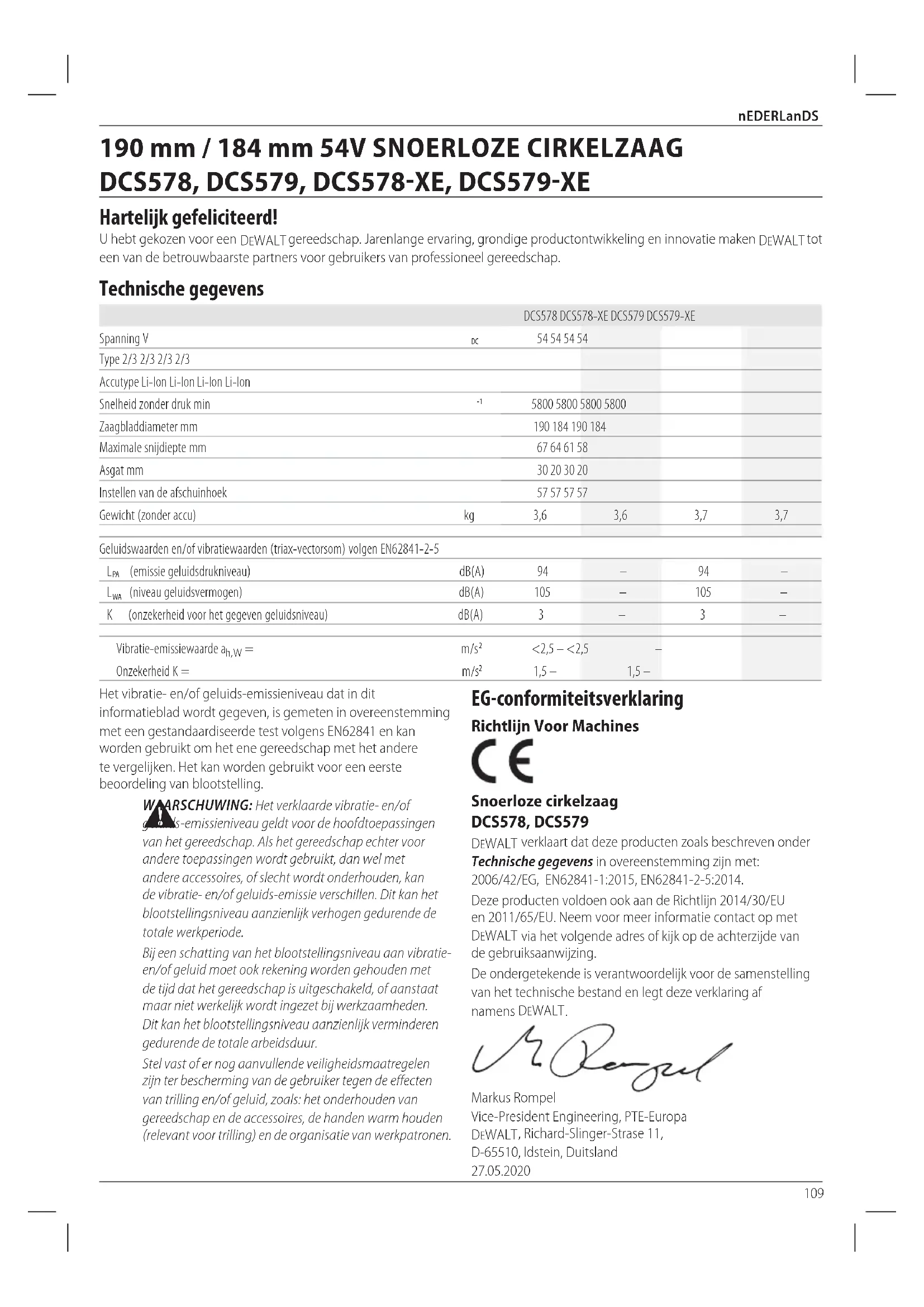 - Le batteria agli ioni di litio sono riciclabili. Consegnarle al proprio concessionario o presso un’apposita stazione di riciclaggio. Le batterie raccolte verranno riciclate o smaltite in modoappropriato.109 nEDERLanDS EG-conformiteitsverklaring Richtlijn Voor Machines Snoerloze cirkelzaag DCS578, DCS579 DeWALT verklaart dat deze producten zoals beschreven onder Technische gegevens in overeenstemming zijn met: 2006/42/EG, EN62841-1:2015, EN62841-2-5:2014. Deze producten voldoen ook aan de Richtlijn 2014/30/EU en 2011/65/EU. Neem voor meer informatie contact op met DeWALT via het volgende adres of kijk op de achterzijde van degebruiksaanwijzing. De ondergetekende is verantwoordelijk voor de samenstelling van het technische bestand en legt deze verklaring af namens DeWALT