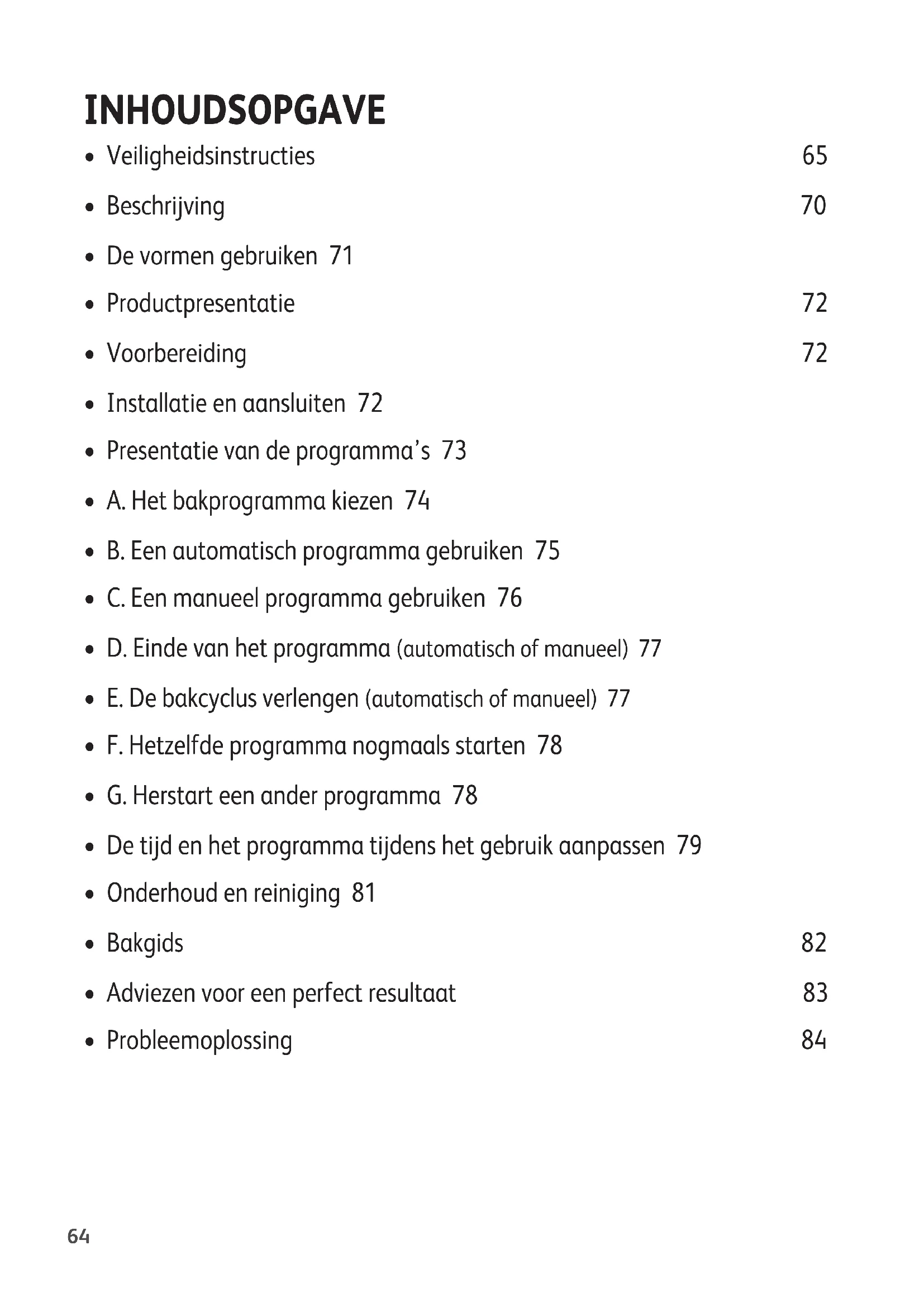 72Presentatie van de programma’s Als u niet zeker weet welke bakmodus u moet gebruiken, kunt u een kijkje nemen in de bakgids op pagina 82.
