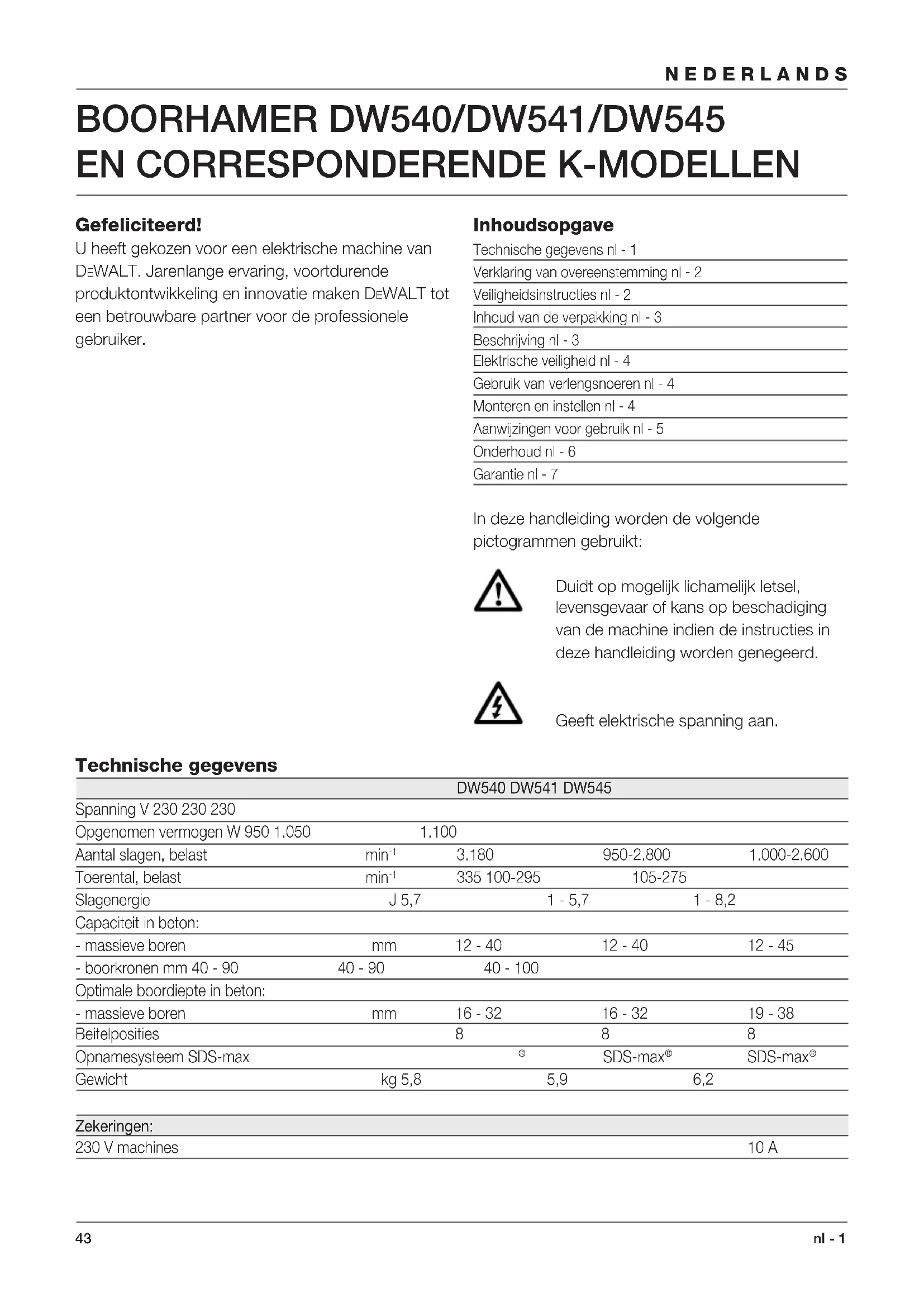 Gefeliciteerd! U heeft gekozen voor een elektrische machine van DEWALT. Jarenlange ervaring, voortdurende produktontwikkeling en innovatie maken DEWALT tot een betrouwbare partner voor de professionele gebruiker. Technische gegevens DW540 DW541 DW545 Spanning V 230 230 230 Opgenomen vermogen W 950 1.050 1.100 Aantal slagen, belast min