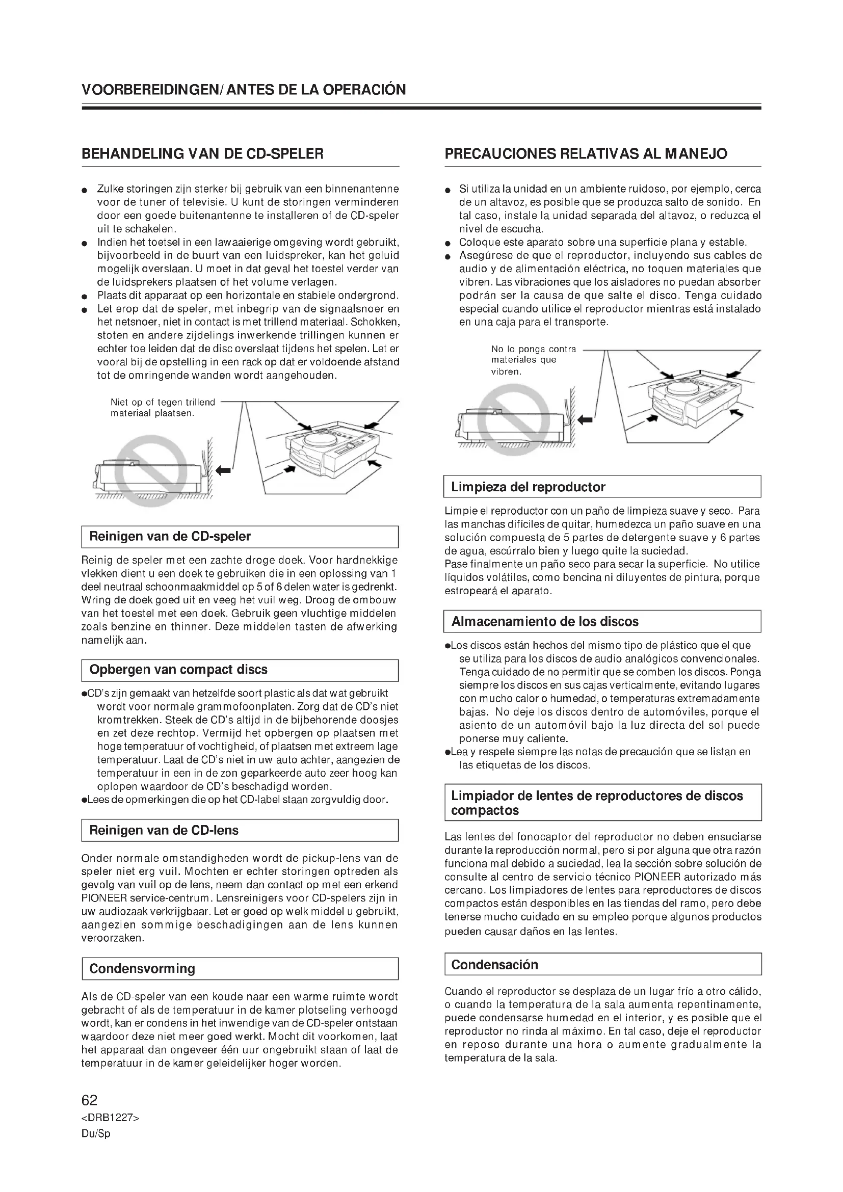 Storingen worden vaak veroorzaakt door een verkeerd gebruik van het apparaat. Raadpleeg daarom bij storingen eerst de onderstaande lijst. Het is eveneens mogelijk dat het probleem veroorzaakt wordt door een andere aangesloten component. Controleer daarom ook de andere componenten. Is het niet mogelijk om de storing aan de hand van de onderstaande lijst te verhelpen, neem dan contact op met een erkend Pioneer service-centrum of uw dealer om het apparaat te laten repareren. OVERIGE INFORMATIE Mogelijke oorzaak ÷ Het netsnoer is niet aangesloten. ÷ De EJECT toets werkt niet. ÷ De plaat is verkeerd om in het apparaat gestoken. ÷ De plaat is vuil e.d. ÷ De uitgangssnoeren zijn verkeerd aangesloten of zitten los. ÷ Onjuist gebruik van het audiomeng- paneel. ÷ De stekkers of de aansluitbussen op de versterker zijn vuil. ÷ De CD-speler staat in de pauzestand. ÷ Verkeerde aansluitingen. ÷ De stekkers of de aansluitbussen op de versterker zijn vuil. ÷ Interferentie veroorzaakt door een televisie. ÷ De plaat is erg bekrast of krom- getrokken. ÷ De plaat is erg vuil. ÷ De zoektijd zal lang zijn als het geluids- loos segment tussen de fragmenten lang is. ÷ Als er een geluidsloze passage van meer dan 20 seconden is, zal de weer- gave starten zonder gebruik van de “auto cue” beginpuntfunctie. ÷ Het beginpunt is nog niet geprogram- meerd. ÷ De storing wordt door de CD-speler veroorzaakt. ÷ De disc stopt automatisch indien er voor 80 minuten of langer geen bediening in de pauzefunctie wordt uitgevoerd. Oplossing ÷ Steek de stekker in het stopcontact. ÷ Gebruik de uitwerp-pen om de CD uit het apparaat te nemen (zie blz. 64). ÷ Plaats de disc met het label omhoog gericht. ÷ Maak de plaat schoon en speel hem opnieuw af. ÷ Controleer de aansluitingen. Zie het hoofdstuk “Aansluitingen”. ÷ Controleer de instelling van de schake- laars op het audiomengpaneel en de instelling van de volumeregelaar. ÷ Maak deze onderdelen schoon. ÷ Druk op de PLAY/PAUSE-toets ( 6 ). ÷ Sluit aan op de LINE INPUT aansluitingen van het audiomengpaneel. (Gebruik niet de MIC aansluitingen.) ÷ Maak deze onderdelen schoon. ÷ Schakel de televisie uit, zet de CD-speler verder van de televisie vandaan of sluit de CD-speler op een stopcontact van een andere stroomkring aan. ÷ Vervang de plaat. ÷ Maak de plaat schoon. ÷ Druk de TIME MODE/AUTO CUE toets langer dan 1 seconde in om de auto-cue functie uit te schakelen (OFF). ÷ Programmeer het beginpunt. (Zie blz. 78.) ÷ Schakel de spanning van de CD-speler uit, of plaats de speler verder van de TV of tuner. ÷ De weergave kan worden gestart door op de PLAY/PAUSE toets ( 6 ) te drukken. Druk op de EJECT toets om de CD uit het apparaat te verwijderen. ¶ Statische elektriciteit of andere externe storingen kunnen een foutieve werking van het apparaat veroorzaken. Indien dit gebeurt, schakelt u het apparaat met de netschakelaar uit en vervolgens schakelt u het apparaat weer in nadat de CD volledig tot stilstand is gekomen. ¶ Dit apparaat kan geen CD-R (opneembare CD) weergeven die slechts gedeeltelijk opgenomen is. ¶ Dit apparaat kan normale 12 cm CD’s weergeven en 8 cm CD’s die in een adapter zijn geplaatst. Steek geen CD’s met een afwijkende vorm in het apparaat (bijv. een hartvormige CD) aangezien dit kan leiden tot beschadiging of een foutieve werking van het apparaat.86 <DRB1227> Du/Sp Síntoma El disco no sale expulsado al pre- sionar el botón EJECT. Al intentar iniciar la reproducción, ésta se detiene inmediatamente. Pausas o interrupciones durante la reproducción. No hay sonido. El sonido está distorsionado, ruido en la salida. Con ciertos discos, se produce mucho ruido, o la reproducción se para. Cuando se activa la función de búsqueda automática, la búsqueda de las canciones no termina. La función de silenciamiento y pausa en el punto de localización no se realiza a pesar de pulsar CUE en el modo de reproducción. La imagen del televisor fluctúa o las radiodifusiones de FM tienen ruidos. El disco no gira al conectar la ali- mentación. OTROS