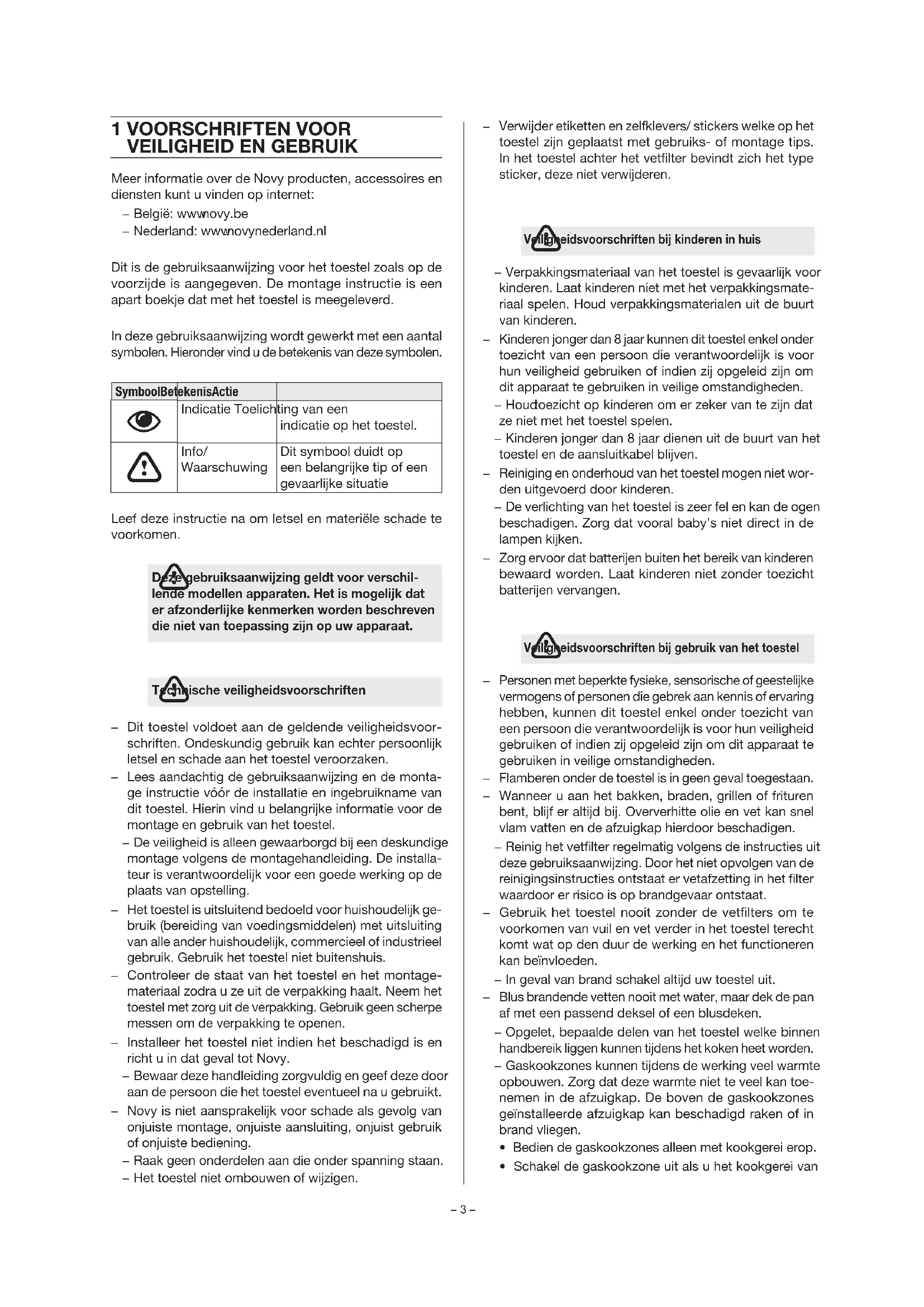 Installeer het toestel niet indien het beschadigd is en richt u in dat geval tot Novy. − Bewaar deze handleiding zorgvuldig en geef deze door aan de persoon die het toestel eventueel na u gebruikt.