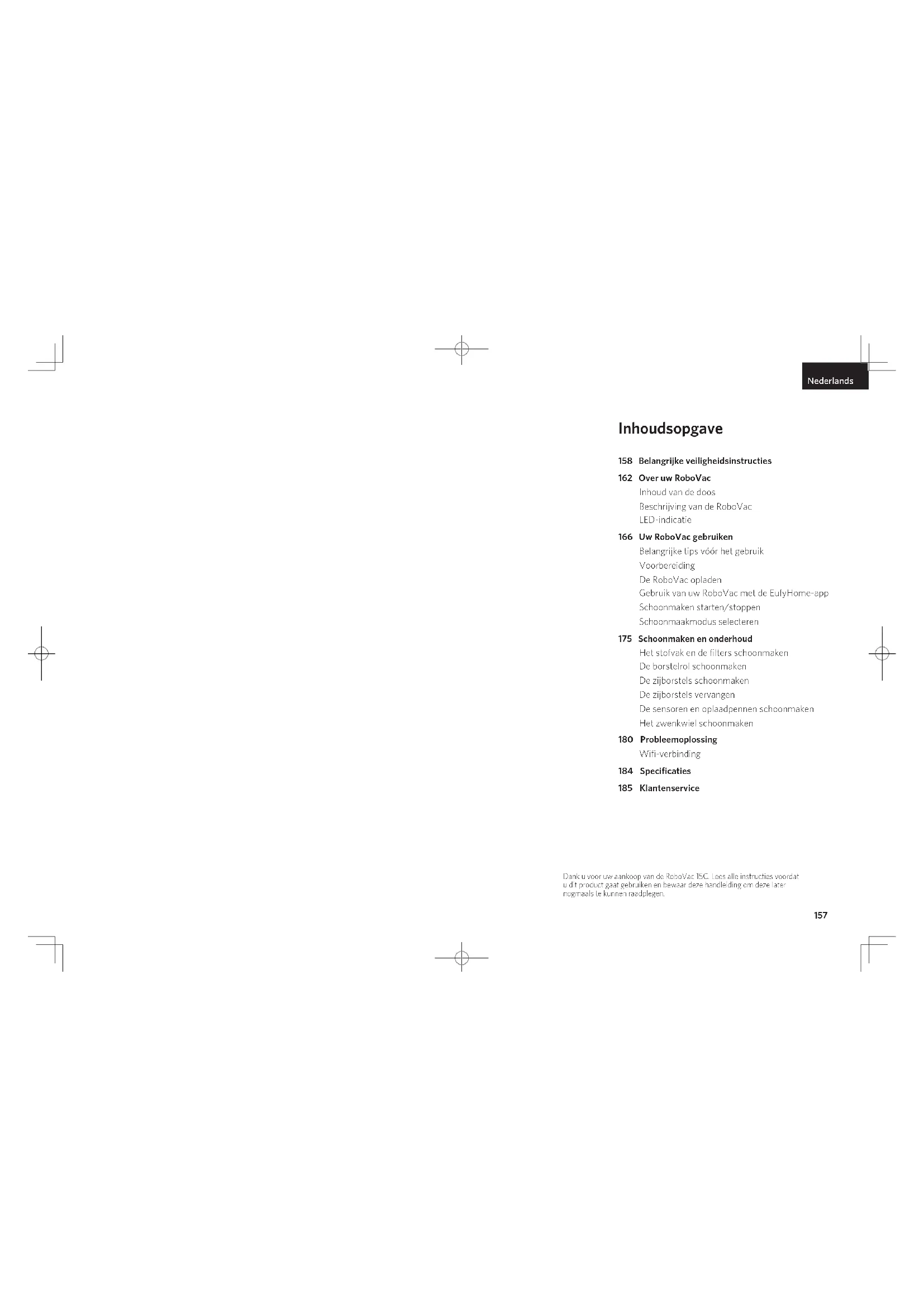 - Om stroom te besparen, gaat het lampje na 1 minuut inactiviteit automatisch uit wanneer de RoboVac niet in het oplaadstation is geplaatst. Knippert/brandt rood + piepen Er is een fout opgetreden bij de RoboVac. Raadpleeg 'Storingstabel>Fouttonen' in deze handleiding voor oplossingen.166 167 Nederlands Nederlands