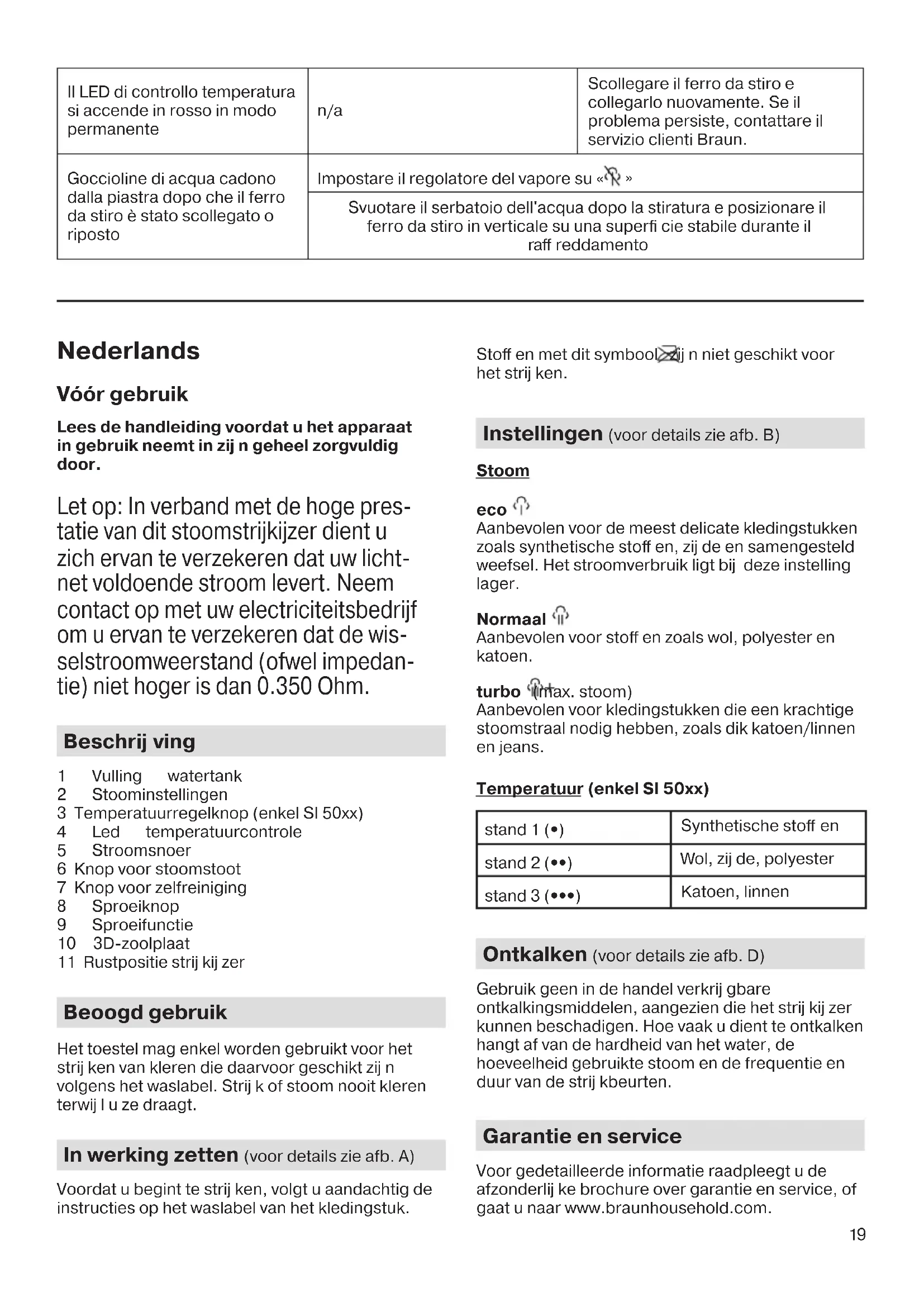Svuotare il serbatoio dell'acqua dopo la stiratura e posizionare il ferro da stiro in verticale su una superfi cie stabile durante il raff reddamento Nederlands Vóór gebruik Lees de handleiding voordat u het apparaat in gebruik neemt in zij n geheel zorgvuldig door. Let op: In verband met de hoge pres- tatie van dit stoomstrijkijzer dient u zich ervan te verzekeren dat uw licht- net voldoende stroom levert. Neem contact op met uw electriciteitsbedrijf om u ervan te verzekeren dat de wis- selstroomweerstand (ofwel impedan- tie) niet hoger is dan 0.350 Ohm. Beschrij ving 1 Vulling watertank 2 Stoominstellingen 3 Temperatuurregelknop (enkel SI 50xx) 4 Led temperatuurcontrole 5 Stroomsnoer 6 Knop voor stoomstoot 7 Knop voor zelfreiniging 8 Sproeiknop 9 Sproeifunctie 10 3D-zoolplaat 11 Rustpositie strij kij zer Beoogd gebruik Het toestel mag enkel worden gebruikt voor het strij ken van kleren die daarvoor geschikt zij n volgens het waslabel. Strij k of stoom nooit kleren terwij l u ze draagt. In werking zetten (voor details zie afb. A) Voordat u begint te strij ken, volgt u aandachtig de instructies op het waslabel van het kledingstuk. Stoff en met dit symbool zij n niet geschikt voor het strij ken. Instellingen (voor details zie afb. B) Stoom eco Aanbevolen voor de meest delicate kledingstukken zoals synthetische stoff en, zij de en samengesteld weefsel. Het stroomverbruik ligt bij deze instelling lager. Normaal Aanbevolen voor stoff en zoals wol, polyester en katoen. turbo (max. stoom) Aanbevolen voor kledingstukken die een krachtige stoomstraal nodig hebben, zoals dik katoen/linnen en jeans. Temperatuur (enkel SI 50xx) stand 1 (•) Synthetische stoff en stand 2 (••) Wol, zij de, polyester stand 3 (•••) Katoen, linnen Ontkalken (voor details zie afb. D) Gebruik geen in de handel verkrij gbare ontkalkingsmiddelen, aangezien die het strij kij zer kunnen beschadigen. Hoe vaak u dient te ontkalken hangt af van de hardheid van het water, de hoeveelheid gebruikte stoom en de frequentie en duur van de strij kbeurten. Garantie en service Voor gedetailleerde informatie raadpleegt u de afzonderlij ke brochure over garantie en service, of gaat u naar www.braunhousehold.com. 5712710761_TS5_INT_01.indd 195712710761_TS5_INT_01.indd 19 09.04.20 15:0809.04.20 15:0820 Gids voor probleemoplossing SI 50xx SI 51xx PROBLEEM OPLOSSING Waterdruppels vallen op de stof tij dens het strij ken Druk op het deksel van de watertank en controleer of het gesloten is Controleer of de temperatuur- regelknop minstens op •• staat. Kies een hogere instelling voor de temperatuur. Neem langere intervallen wanneer u drukt op de knop voor stoomstoot. Neem langere intervallen wanneer u drukt op de knop voor stoomstoot. Indien chemische stoff en in de watertank zij n gedaan, maakt u de tank leeg en spoelt u hem 2-3 maal. Het strij kij zer produceert weinig of geen stoom Controleer het waterpeil en vul de tank bij Voer de ontkalkingsprocedure uit Controleer of de temperatuur- regelknop minstens op •• staat. Wacht tot het strij kij zer warm is en de led temperatuurcontrole vast brandt. Controleer of de stoomregelknop op een stoominstelling is gezet Tij dens het strij ken komen schilfers en witte onzuiverheden uit de zoolplaat Voer de ontkalkingsprocedure uit De sproeifunctie of stoomstoot werkt niet naar behoren Vul de watertank bij De zoolplaat wordt niet warm Trek de stekker uit het stopcontact en steek hem opnieuw in. Draai de temperatuurregelknop van «min» naar «max». Selecteer dan de gewenste temperatuur. Trek de stekker uit het stopcontact en steek hem opnieuw in. De led temperatuurcontrole brandt vast in rode kleur n.v.t. Trek de stekker uit het stopcontact en steek hem opnieuw in. Indien het probleem blij ft aanhouden, neem dan contact op met de klantenservice van Braun. Waterdruppels vallen van de zoolplaat nadat de stekker uit het stopcontact is getrokken of het strij kij zer is opgeborgen Zet de stoomregelaar op « » Maak de watertank na het strij ken leeg en zet het strij kij zer verticaal op een stabiel oppervlak tij dens het afkoelen Dansk Før ibrugtagning Læs venligst instruktionerne grundigt og fuldstændigt inden brug af apparatet. Advarsel: På grund af dampstrygejernets høge præstationsevne, venligst kontrol- lér at netspændingen er høj nok. Kontakt din elleverandør for at sikre dig om at net spændingen ikke er højere 0.350 Ohm. 5712710761_TS5_INT_01.indd 205712710761_TS5_INT_01.indd 20 09.04.20 15:0809.04.20 15:0821 Beskrivelse 1 Vandbeholderpåfyldning 2 Dampindstillinger 3 Temperaturvælger (kun SI 50xx) 4 Temperaturkontrol LED 5 Strømkabel 6 Dampskududløser 7 Selvrenseknap 8 Sprøjteknap 9 Sprøjtefunktion 10 3D sålplade 11 Strygejernsholder Tilsigtet brug Apparatet må kun bruges til strygning af beklædningsgenstande, der er egnet til strygning i overensstemmelse med plejemærkningen. Stryg eller damp aldrig beklædningsgenstande, mens de bæres. Ibrugtagning (for yderligere oplysninger henvises til fi g. A) Før du begynder at stryge, skal instruktionerne på beklædningsgenstanden følges omhyggeligt. Tekstiler med dette symbol kan ikke stryges. Indstillinger (for yderligere oplysninger henvises til fi g. B) Damp eco Denne indstilling foreslås til de fl este sarte beklædningsgenstande, såsom syntetiske stoff er, silke og blandet tekstil. Denne indstilling betyder mindre strømforbrug. Normal Denne indstilling foreslås til beklædningsgenstande såsom uld, polyester og bomuld. turbo (maks. damp) Denne indstilling foreslås til beklædnings- genstande, der har brug for mere kraftig damp, såsom tyk bomuld/linned og jeans. Temperatur (kun SI 50xx) niveau 1 (•) Syntetisk niveau 2 (••) Uld,silke,polyester niveau 3 (•••) Bomuld, linned Afkalkning (for yderligere oplysninger henvises til fi g. D) Brug ikke kommercielle afkalkningsmidler, da de kan beskadige strygejernet. Afkalknings- hyppigheden afhænger af vandets hårdhedsgrad, brugt dampmængde og hyppighed