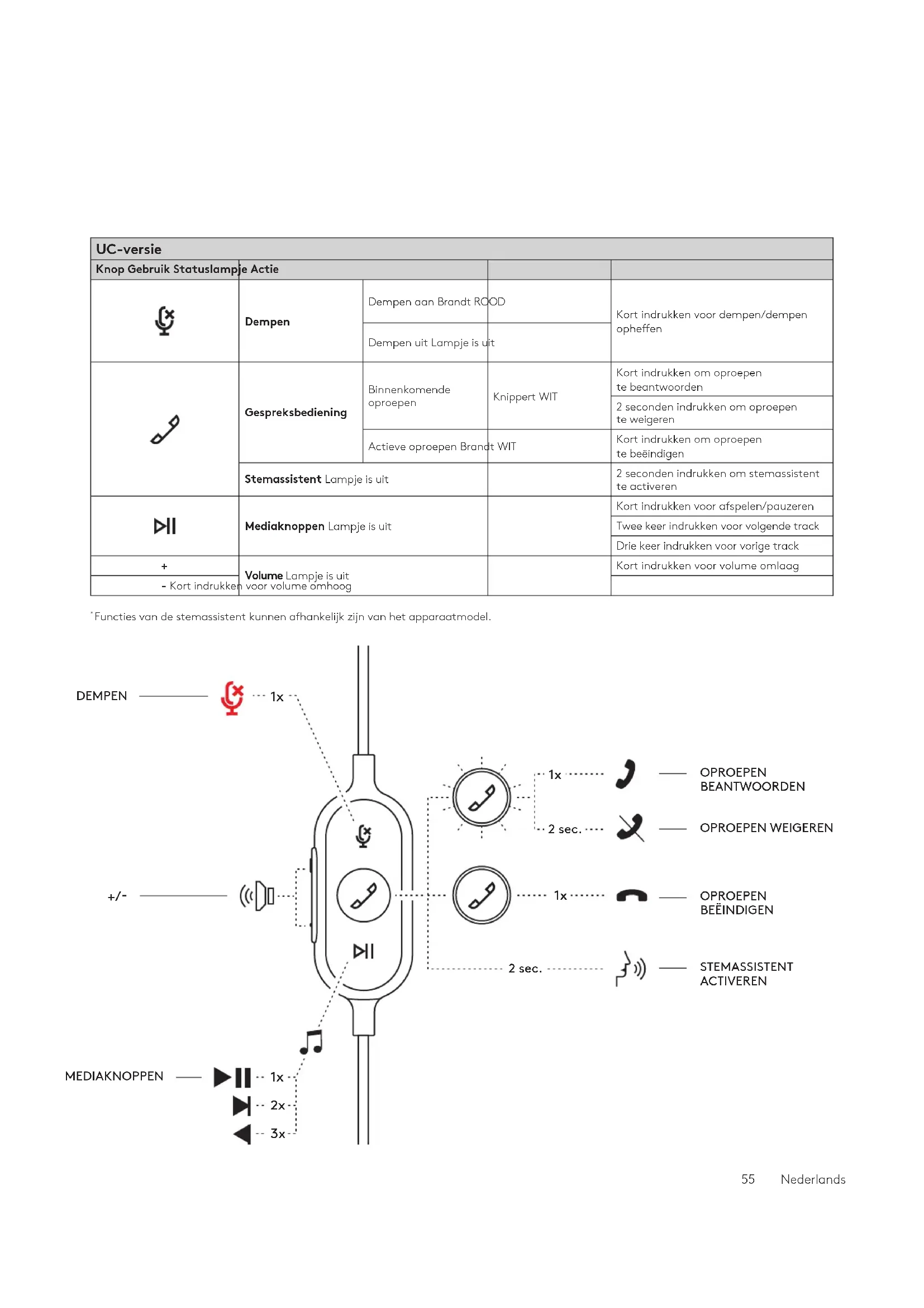 SPRAAKVAARDIGHEDEN (CORTANA) VOOR TEAMS ACTIVEREN 54 Nederlands* Functies van de stemassistent kunnen afhankelijk zijn van het apparaatmodel. UC-versie Knop Gebruik Statuslampje Actie Dempen Dempen aan Brandt ROOD Kort indrukken voor dempen/dempen opheen Dempen uit Lampje is uit Gespreksbediening Binnenkomende oproepen Knippert WIT Kort indrukken om oproepen tebeantwoorden 2 seconden indrukken om oproepen teweigeren Actieve oproepen Brandt WIT Kort indrukken om oproepen tebeëindigen Stemassistent Lampje is uit 2 seconden indrukken om stemassistent te activeren Mediaknoppen Lampje is uit Kort indrukken voor afspelen/pauzeren Twee keer indrukken voor volgende track Drie keer indrukken voor vorige track