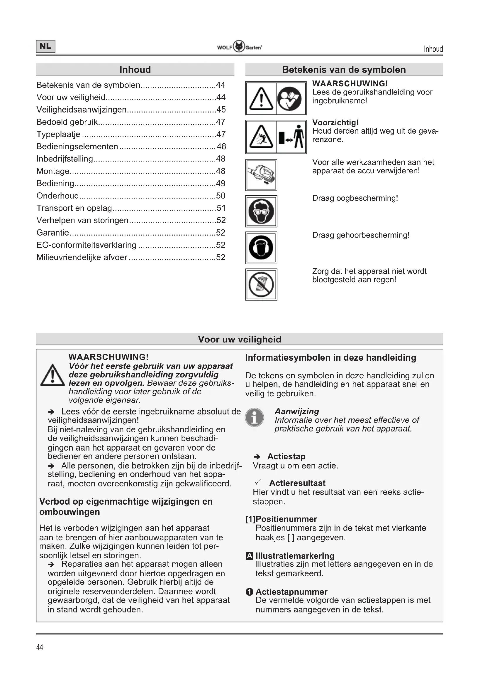 - Milieuvriendelijke afvoer Voor uw veiligheid Betekenis van de symbolen WAARSCHUWING! Lees de gebruikshandleiding voor ingebruikname! Voorzichtig! Houd derden altijd weg uit de geva- renzone. Voor alle werkzaamheden aan het apparaat de accu verwijderen! Draag oogbescherming! Draag gehoorbescherming! Zorg dat het apparaat niet wordt blootgesteld aan regen!Veiligheidsaanwijzingen p. 52