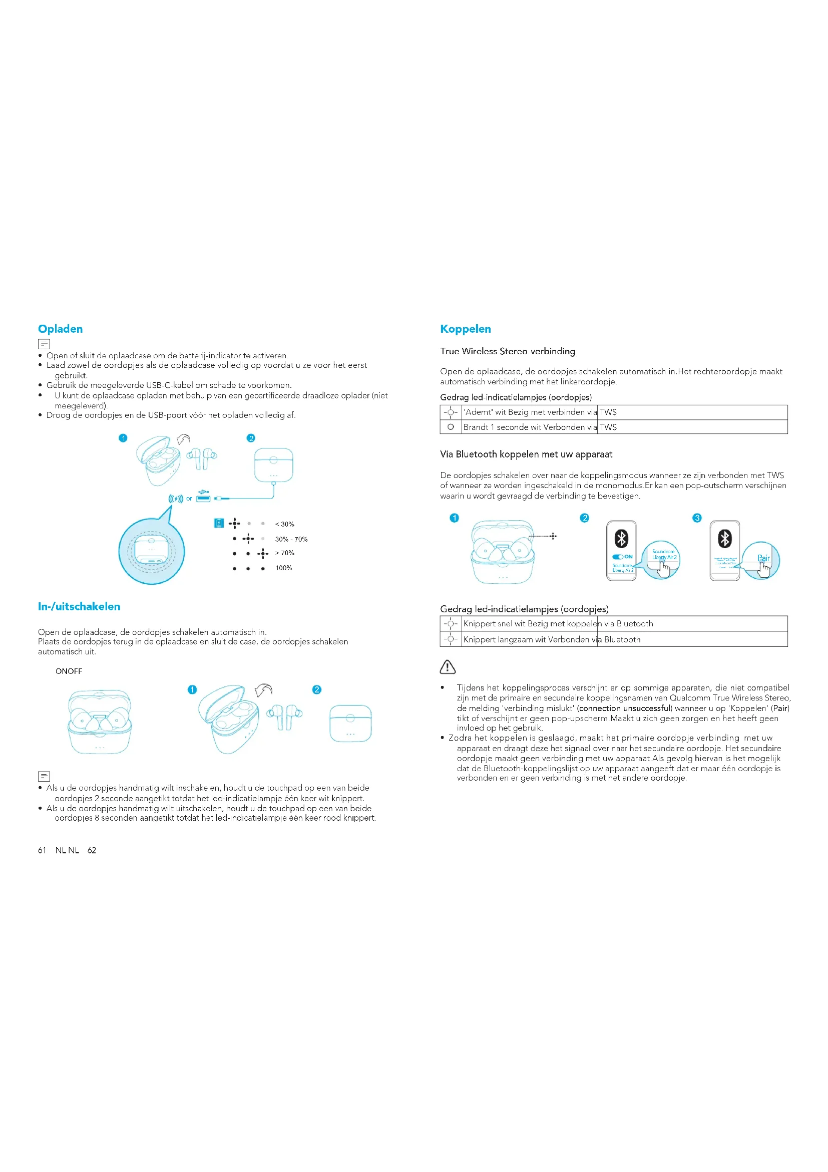 - Zodra het koppelen is geslaagd, maakt het primaire oordopje verbinding met uw apparaat en draagt deze het signaal over naar het secundaire oordopje. Het secundaire oordopje maakt geen verbinding met uw apparaat.Als gevolg hiervan is het mogelijk dat de Bluetooth-koppelingslijst op uw apparaat aangeeft dat er maar één oordopje is verbonden en er geen verbinding is met het andere oordopje.63 NL NL 64 Als u de oordopjes met een ander Bluetooth-apparaat wilt koppelen, plaatst u de oordopjes terug in de oplaadcase. Zorg er vervolgens voor dat de oordopjes worden opgeladen, houd het deksel open en houd de knop op de onderkant van de oplaadcase 3 seconden ingedrukt totdat de led-indicatielampjes op beide oordopjes snel wit knipperen.