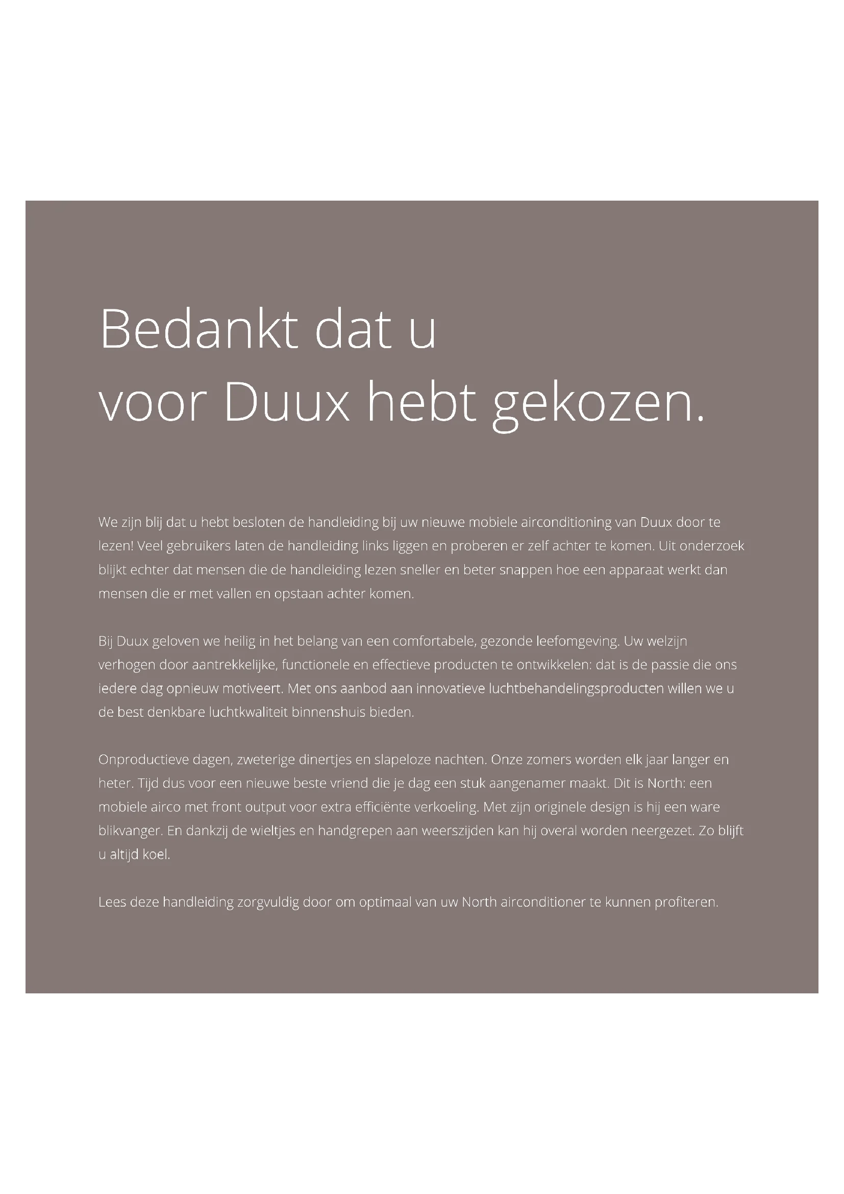 Simplied EU declaration of conformity Hereby, Duux declares that this environmental control radio equipment is in compliance with Directive 2014/53/EU. The full text of the EU Declaration of Conformity is available at the following internet address: www.duux.com/doc22 Bedankt dat u voor Duux hebt gekozen. We zijn blij dat u hebt besloten de handleiding bij uw nieuwe mobiele airconditioning van Duux door te lezen! Veel gebruikers laten de handleiding links liggen en proberen er zelf achter te komen. Uit onderzoek blijkt echter dat mensen die de handleiding lezen sneller en beter snappen hoe een apparaat werkt dan mensen die er met vallen en opstaan achter komen. Bij Duux geloven we heilig in het belang van een comfortabele, gezonde leefomgeving. Uw welzijn verhogen door aantrekkelijke, functionele en eectieve producten te ontwikkelen: dat is de passie die ons iedere dag opnieuw motiveert. Met ons aanbod aan innovatieve luchtbehandelingsproducten willen we u de best denkbare luchtkwaliteit binnenshuis bieden. Onproductieve dagen, zweterige dinertjes en slapeloze nachten. Onze zomers worden elk jaar langer en heter. Tijd dus voor een nieuwe beste vriend die je dag een stuk aangenamer maakt. Dit is North: een mobiele airco met front output voor extra eciënte verkoeling. Met zijn originele design is hij een ware blikvanger. En dankzij de wieltjes en handgrepen aan weerszijden kan hij overal worden neergezet. Zo blijft u altijd koel. Lees deze handleiding zorgvuldig door om optimaal van uw North airconditioner te kunnen proteren.23