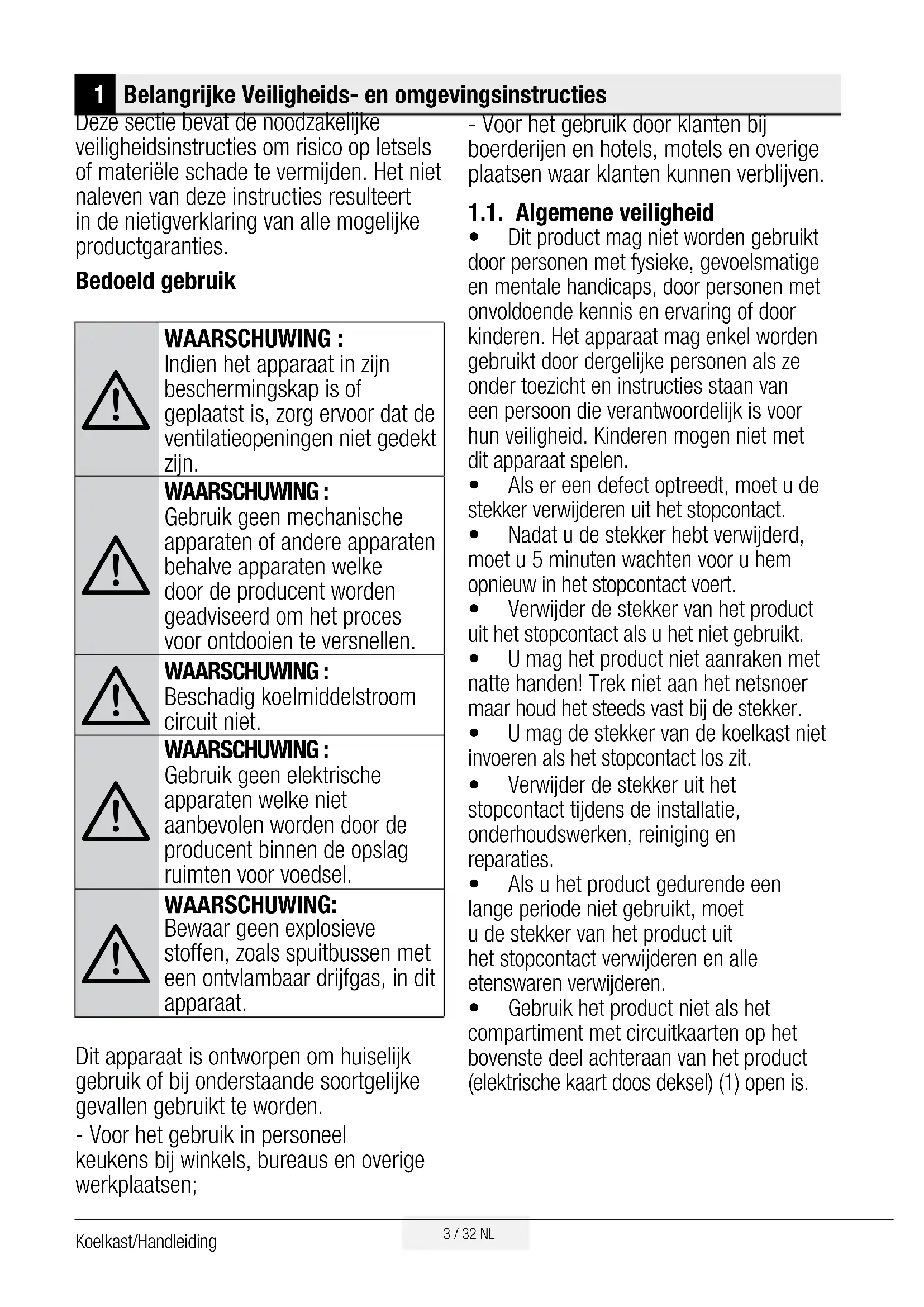 WAARSCHUWING: Bewaar geen explosieve stoffen, zoals spuitbussen met een ontvlambaar drijfgas, in dit apparaat. Dit apparaat is ontworpen om huiselijk gebruik of bij onderstaande soortgelijke gevallen gebruikt te worden. - Voor het gebruik in personeel keukens bij winkels, bureaus en overige werkplaatsen; - Voor het gebruik door klanten bij boerderijen en hotels, motels en overige plaatsen waar klanten kunnen verblijven. 1.1. Algemene veiligheid t Dit product mag niet worden gebruikt door personen met fysieke, gevoelsmatige en mentale handicaps, door personen met onvoldoende kennis en ervaring of door kinderen. Het apparaat mag enkel worden gebruikt door dergelijke personen als ze onder toezicht en instructies staan van een persoon die verantwoordelijk is voor hun veiligheid. Kinderen mogen niet met dit apparaat spelen. t Als er een defect optreedt, moet u de stekker verwijderen uit het stopcontact. t Nadat u de stekker hebt verwijderd, moet u 5 minuten wachten voor u hem opnieuw in het stopcontact voert. t Verwijder de stekker van het product uit het stopcontact als u het niet gebruikt. t U mag het product niet aanraken met natte handen! Trek niet aan het netsnoer maar houd het steeds vast bij de stekker. t U mag de stekker van de koelkast niet invoeren als het stopcontact los zit. t Verwijder de stekker uit het stopcontact tijdens de installatie, onderhoudswerken, reiniging en reparaties. t Als u het product gedurende een lange periode niet gebruikt, moet u de stekker van het product uit het stopcontact verwijderen en alle etenswaren verwijderen. t Gebruik het product niet als het compartiment met circuitkaarten op het bovenste deel achteraan van het product (elektrische kaart doos deksel) (1) open is.4 / 32 NLKoelkast/Handleiding Belangrijke Veiligheids- en omgevingsinstructies