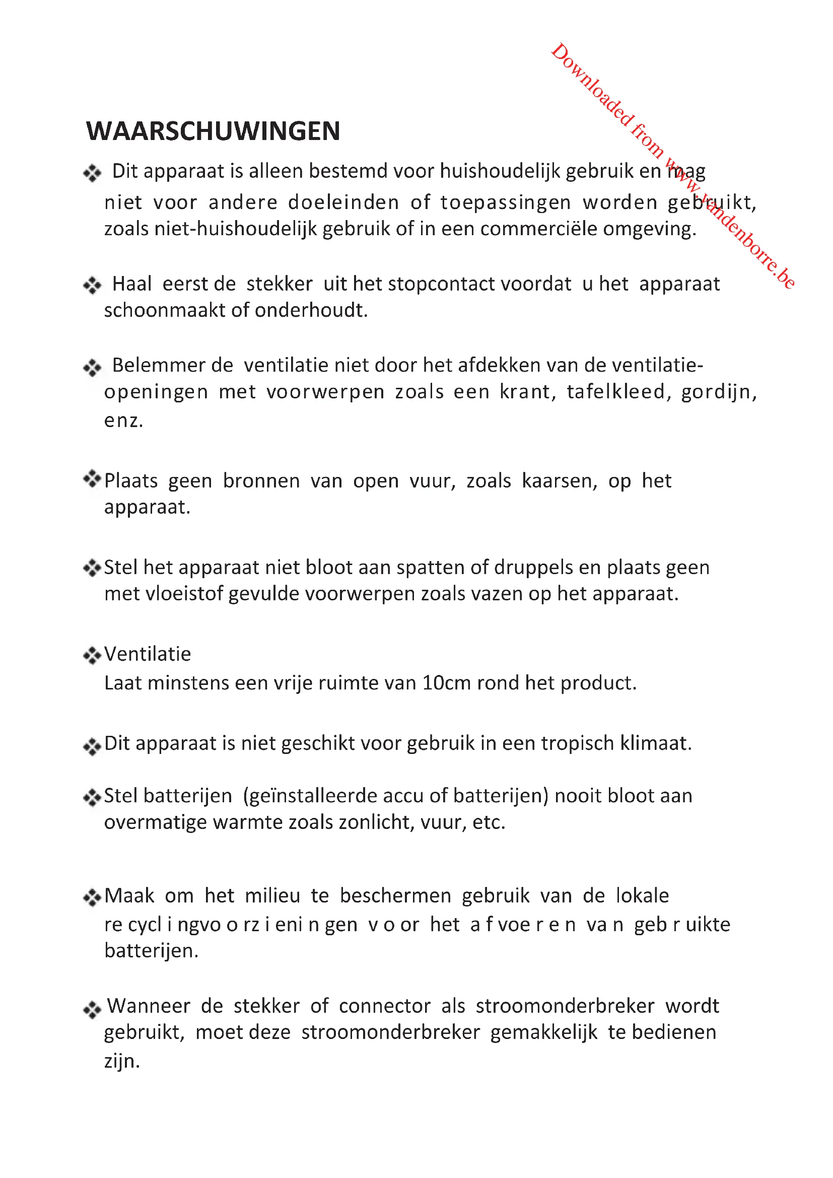 Downloaded from www.vandenborre.be WAARSCHUWINGEN Dit apparaat is alleen bestemd voor huishoudelijk gebruik en mag niet voor andere doeleinden of toepassingen worden gebruikt, zoals niet-huishoudelijk gebruik of in een commerciële omgeving. Haal eerst de stekker uit het stopcontact voordat u het apparaat schoonmaakt of onderhoudt. Belemmer de ventilatie niet door het afdekken van de ventilatie- openingen met voorwerpen zoals een krant, tafelkleed, gordijn, enz. Plaats geen bronnen van open vuur, zoals kaarsen, op het apparaat. Stel het apparaat niet bloot aan spatten of druppels en plaats geen met vloeistof gevulde voorwerpen zoals vazen op het apparaat. Ventilatie Laat minstens een vrije ruimte van 10cm rond het product. Dit apparaat is niet geschikt voor gebruik in een tropisch klimaat. Stel batterijen (geïnstalleerde accu of batterijen) nooit bloot aan overmatige warmte zoals zonlicht, vuur, etc. Maak om het milieu te beschermen gebruik van de lokale re cycl i ngvo o rz i eni n gen v o or het a f voe r e n va n geb r uikte batterijen. Wanneer de stekker of connector als stroomonderbreker wordt gebruikt, moet deze stroomonderbreker gemakkelijk te bedienen zijn.