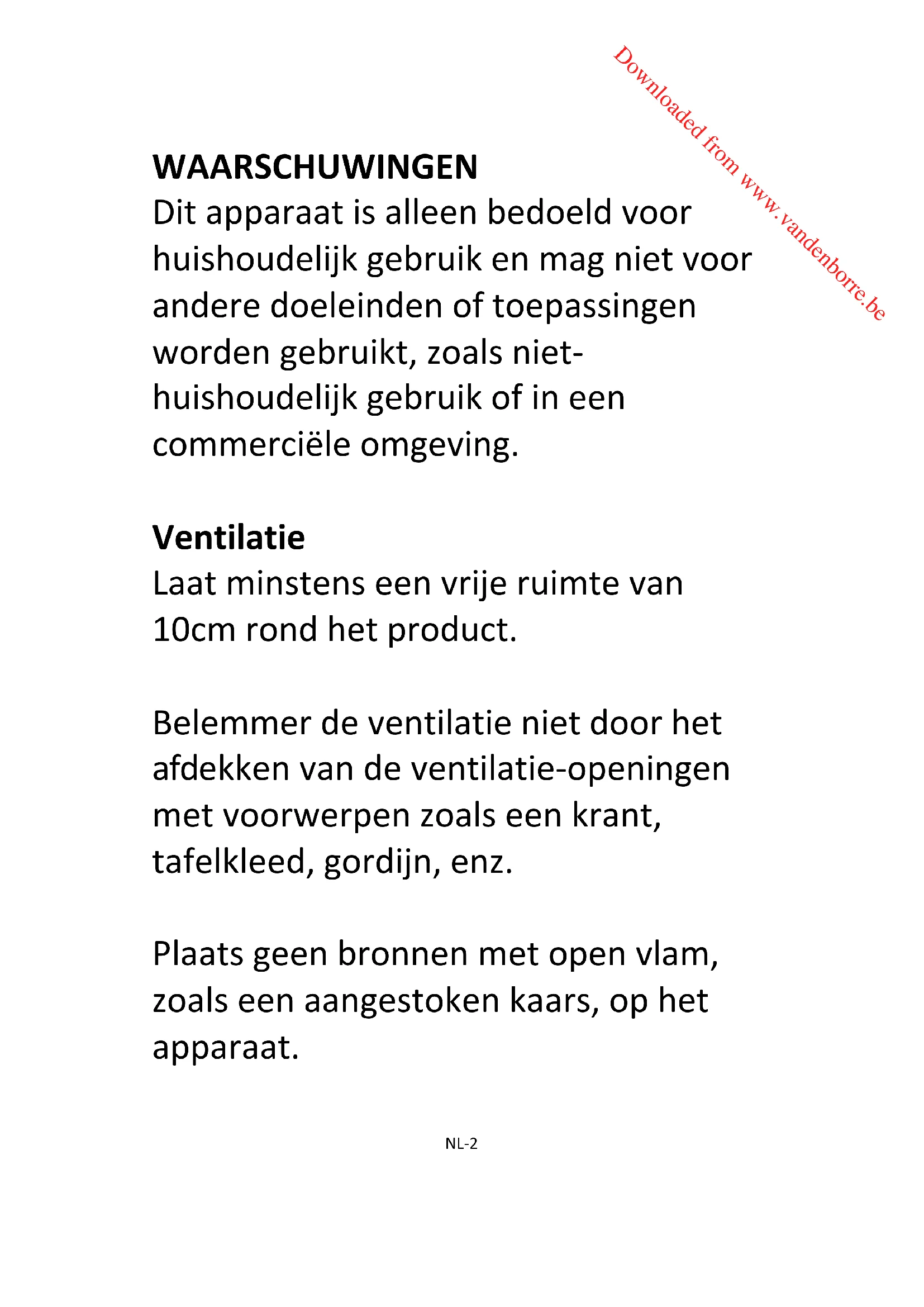 NL-1 Downloaded from www.vandenborre.beWAARSCHUWINGEN Dit apparaat is alleen bedoeld voor huishoudelijk gebruik en mag niet voor andere doeleinden of toepassingen worden gebruikt, zoals niet- huishoudelijk gebruik of in een commerciële omgeving. Ventilatie Laat minstens een vrije ruimte van 10cm rond het product. Belemmer de ventilatie niet door het afdekken van de ventilatie-openingen met voorwerpen zoals een krant, tafelkleed, gordijn, enz. Plaats geen bronnen met open vlam, zoals een aangestoken kaars, op het apparaat.